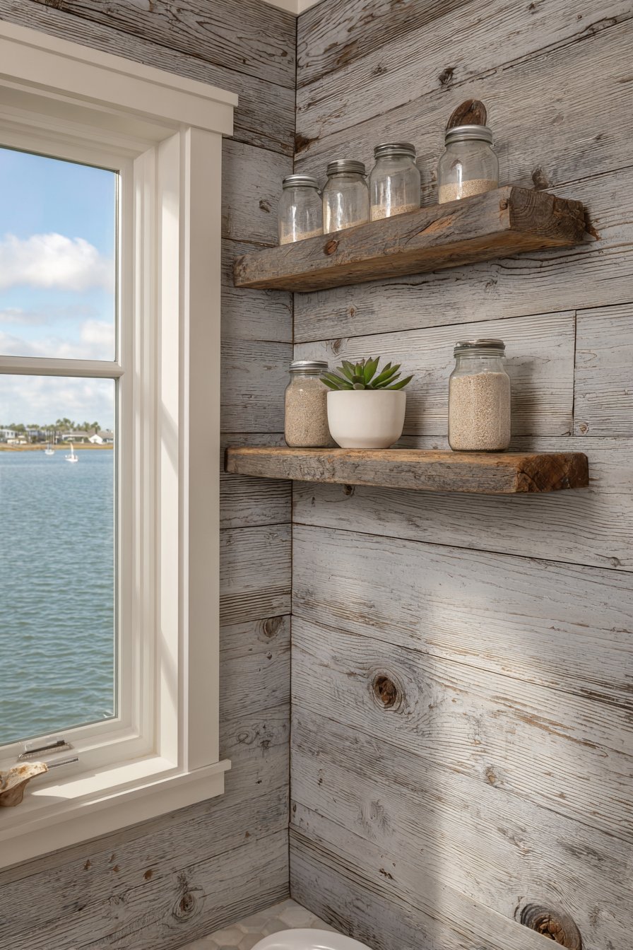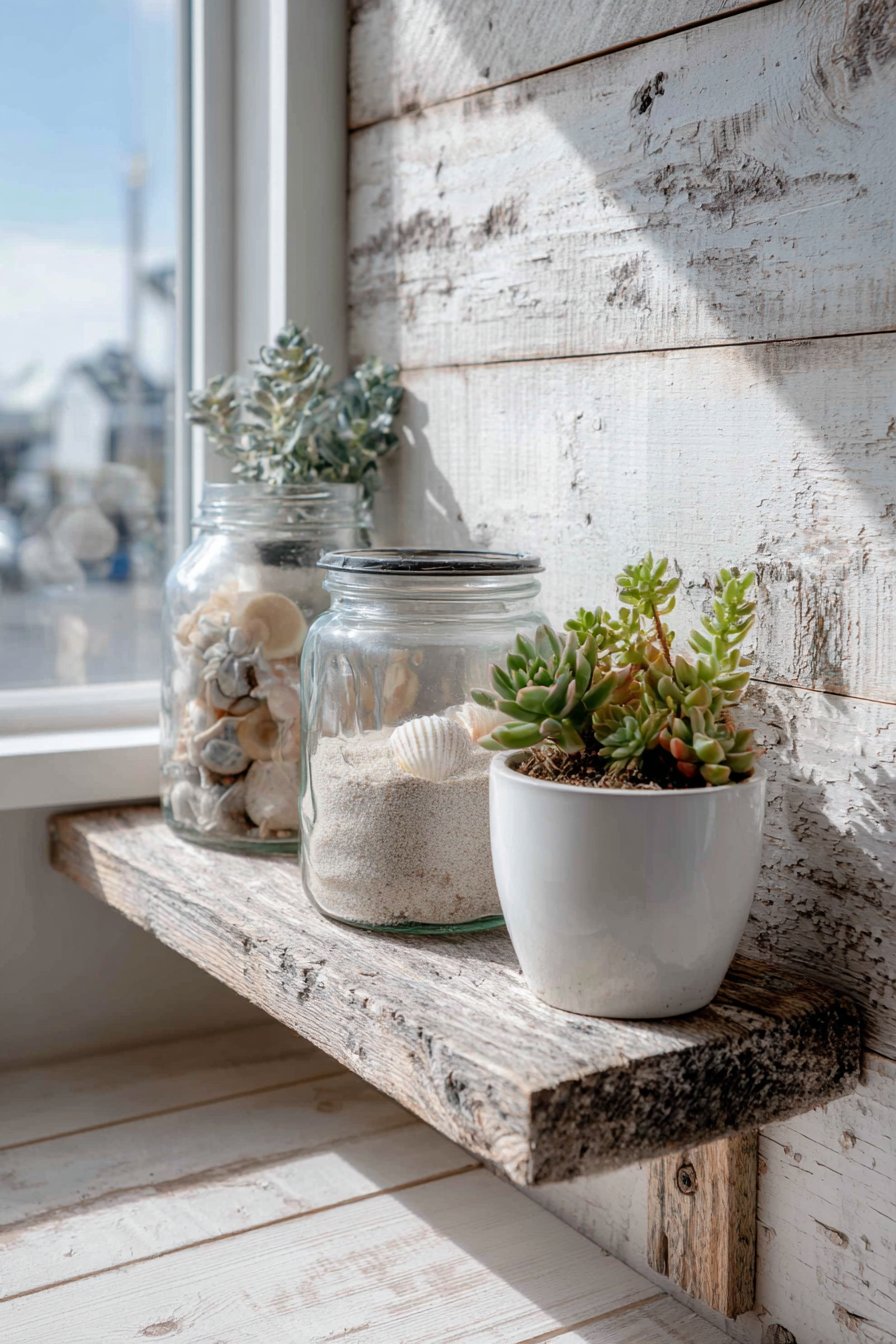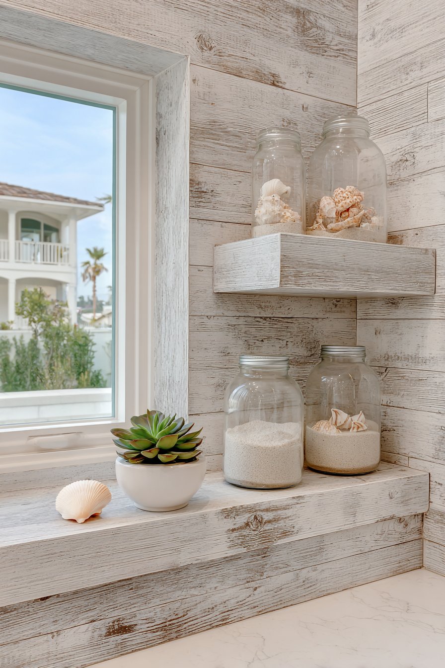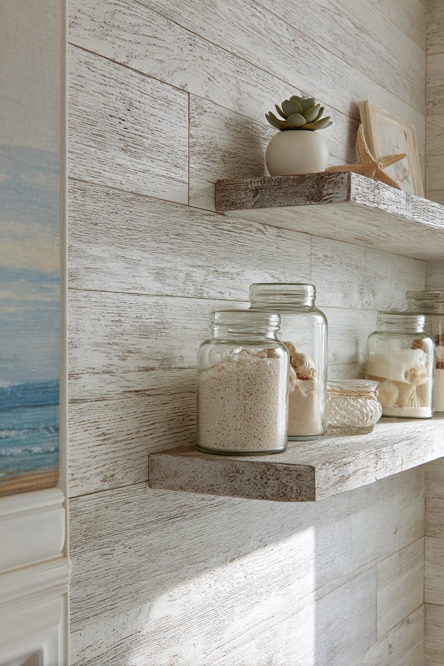 The reclaimed wood shelf adds another layer of authentic coastal character—its weathered surface and varied grain patterns tell stories of previous uses and weathered exposure. The glass jars filled with sand and shells transform collected beach treasures into curated displays, while the succulent introduces living greenery that thrives in bathroom humidity. This combination of architectural shiplap, rustic shelving, and thoughtful accessories creates a richly layered coastal aesthetic that feels collected over time rather than purchased all at once from a single store.