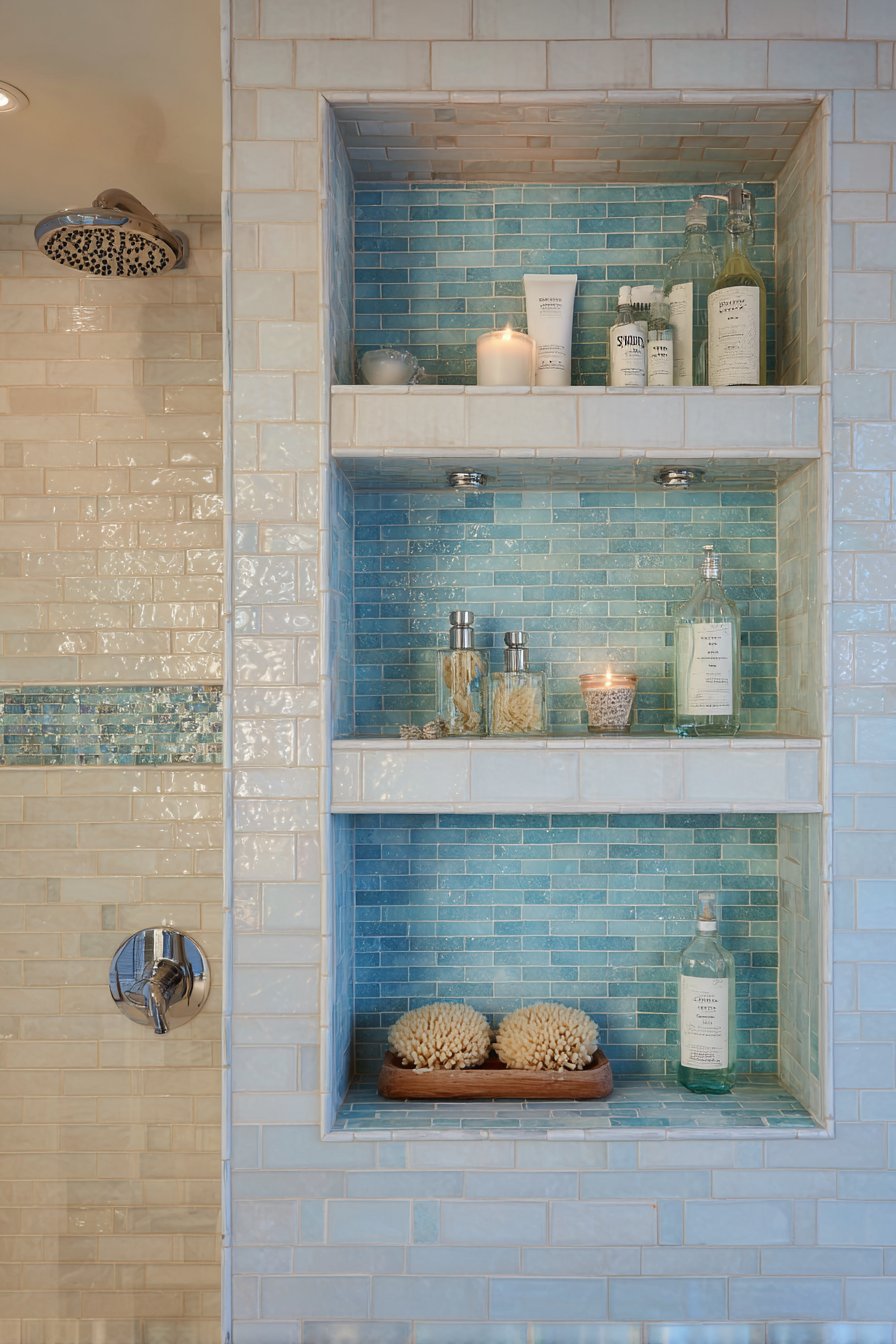 - Build storage into the shower walls during construction to avoid aftermarket additions that protrude into the bathing area