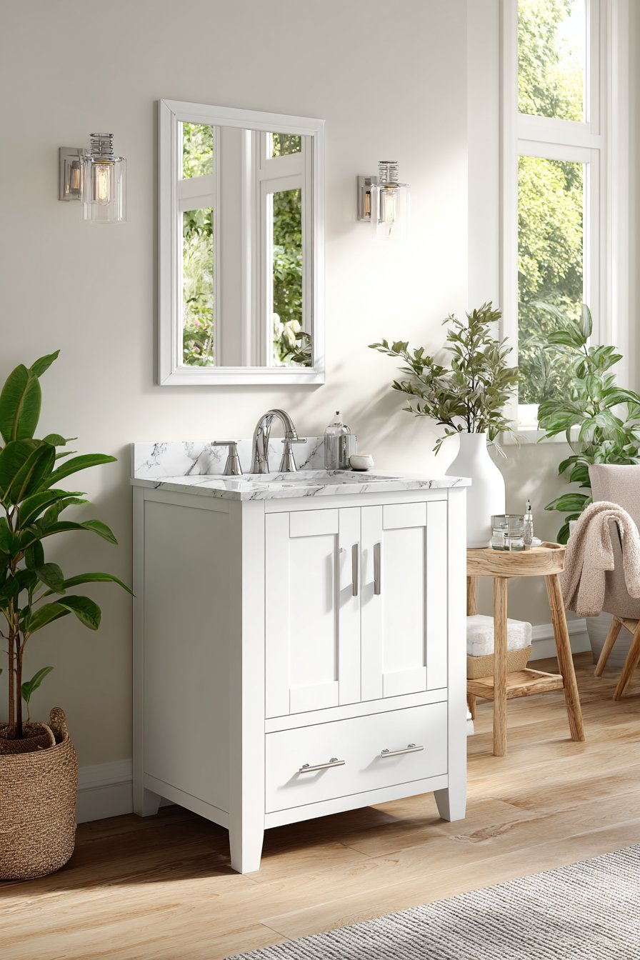 This small coastal bathroom idea showcases a 24-inch white shaker-style vanity that proves you don’t need expansive dimensions to create significant visual impact. The compact cabinet features soft-close drawers with brushed nickel cup pulls that coordinate perfectly with other fixtures throughout the bathroom, demonstrating the importance of cohesive hardware selection. A white marble countertop with delicate gray veining supports a chrome single-handle faucet, the natural stone’s cool elegance elevating the humble vanity to luxury status.
