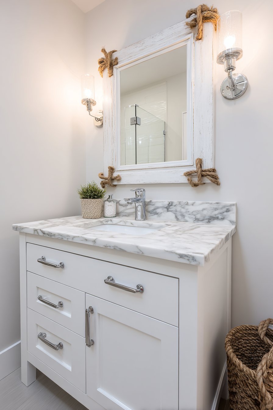 Above the vanity hangs a white-framed rectangular mirror distinguished by coastal rope detail wrapped artistically around its top edge—a subtle nautical reference that adds personality without resorting to obvious maritime clichés. Wall-mounted sconces with clear glass shades flank the mirror at face height, providing the even, shadow-free illumination essential for grooming tasks while adding architectural symmetry to the composition. The shaker-style cabinet doors with their simple recessed panels represent timeless design that won’t appear dated in coming years.