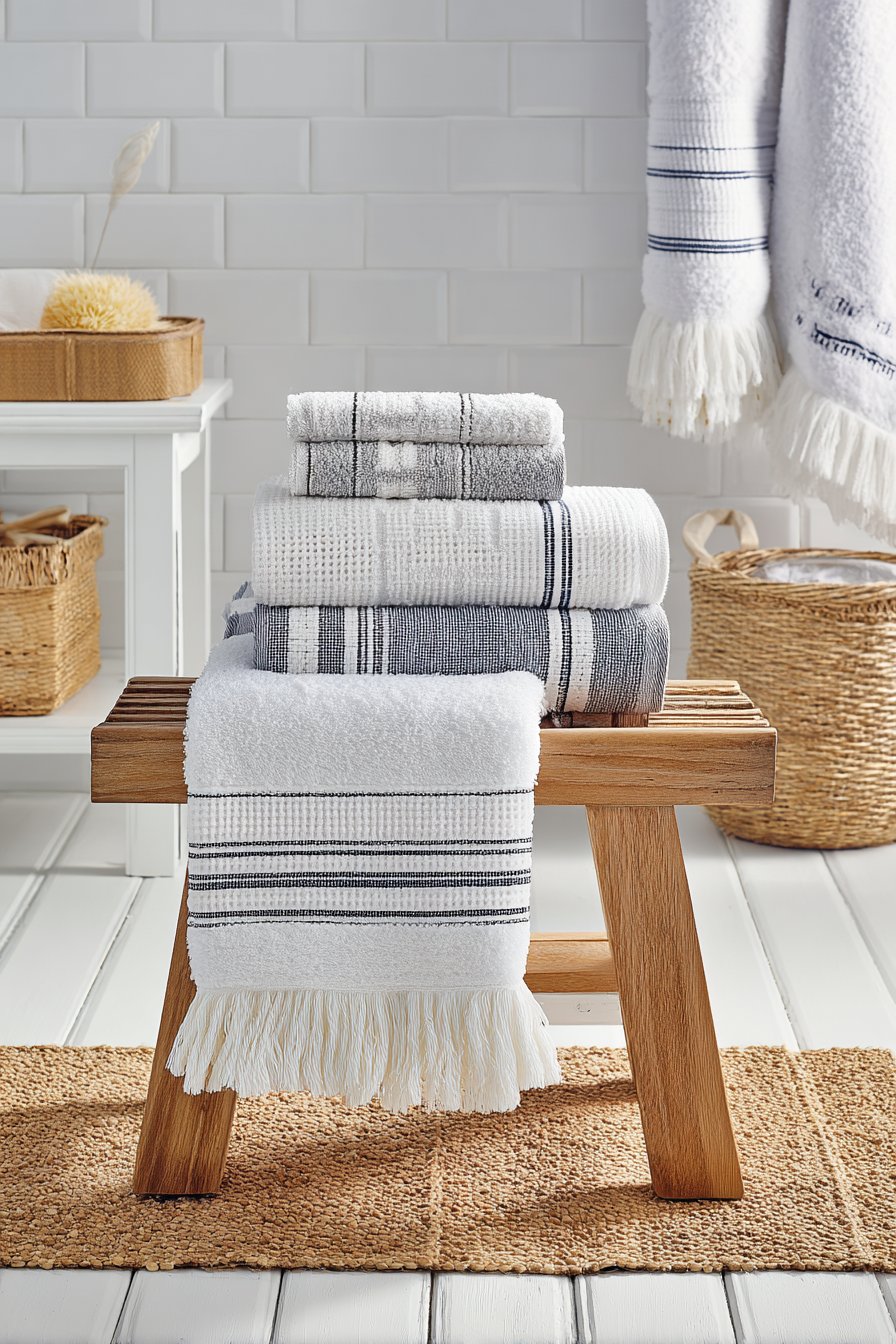 - Display accent towels on furniture pieces like stools to add layers beyond wall-mounted bars