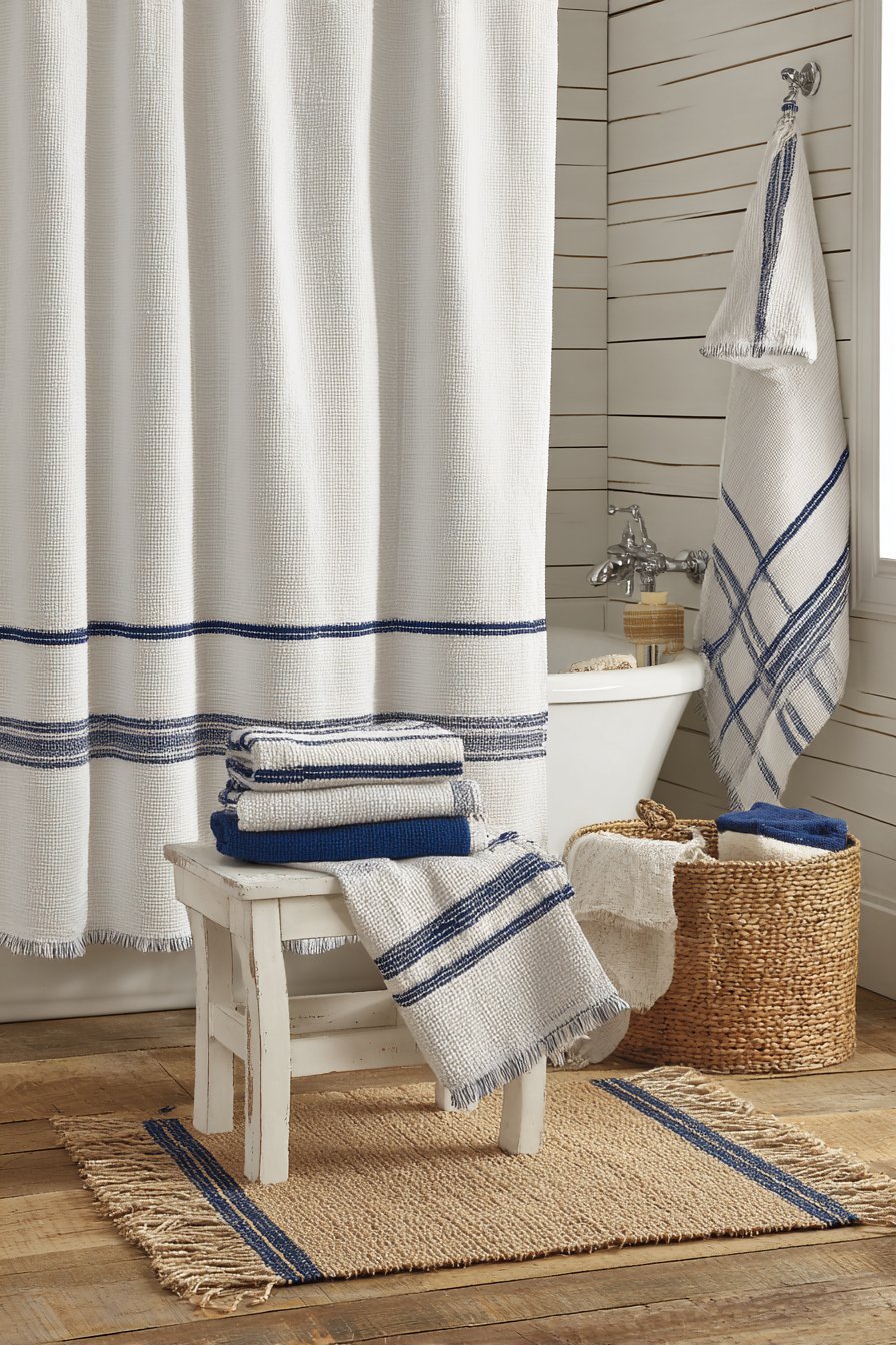 The varying textures across these fabrics—the dimensional waffle-weave, smooth cotton stripes, rough jute, and slightly textured shower curtain—create interest that keeps the predominantly white and navy scheme from appearing flat or boring. This textile layering demonstrates an important design principle: when working with limited color palettes, texture becomes your tool for creating visual richness. The chrome towel bars provide functional mounting while their reflective finish adds subtle sparkle that catches light like sun on water.