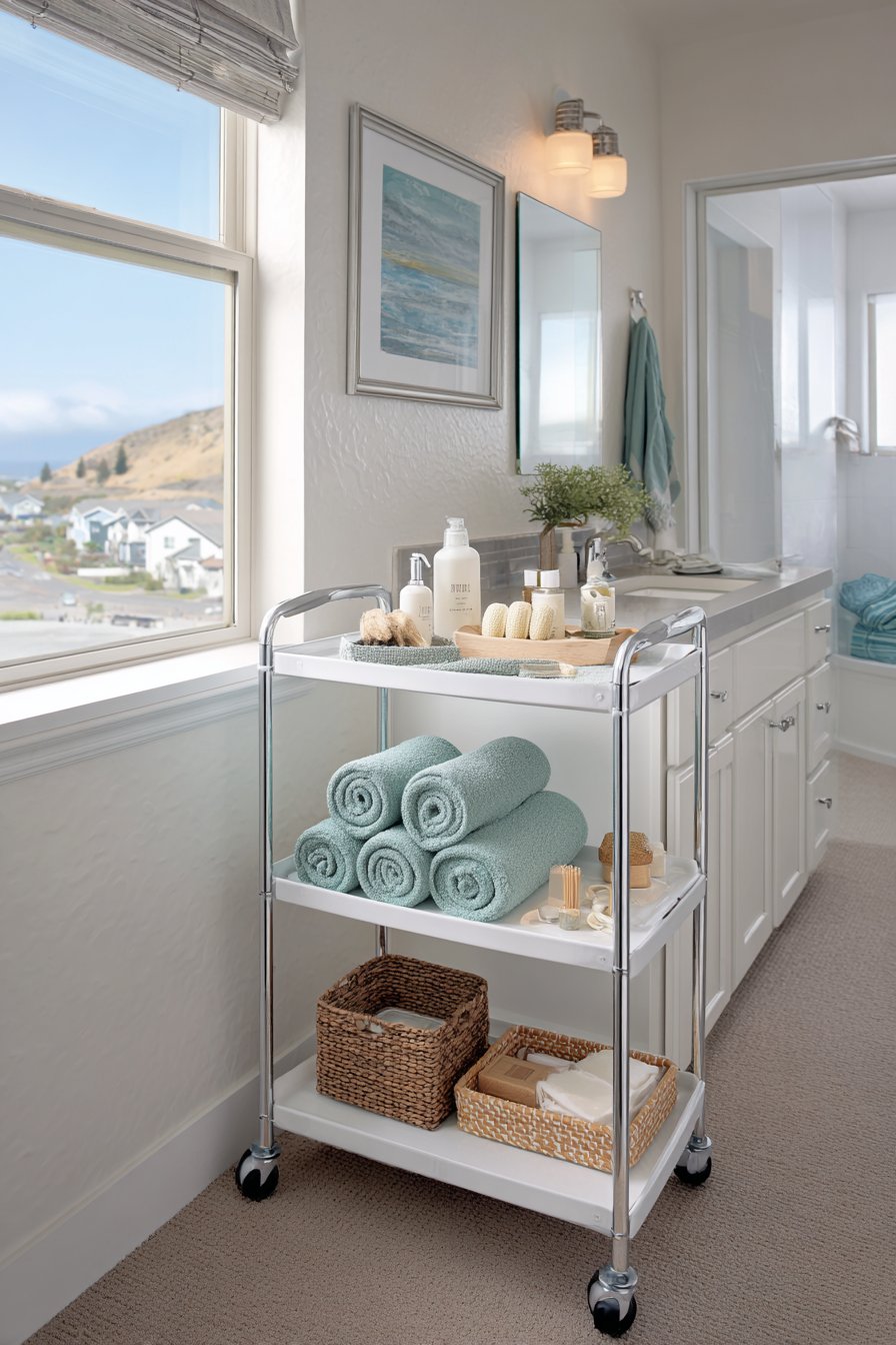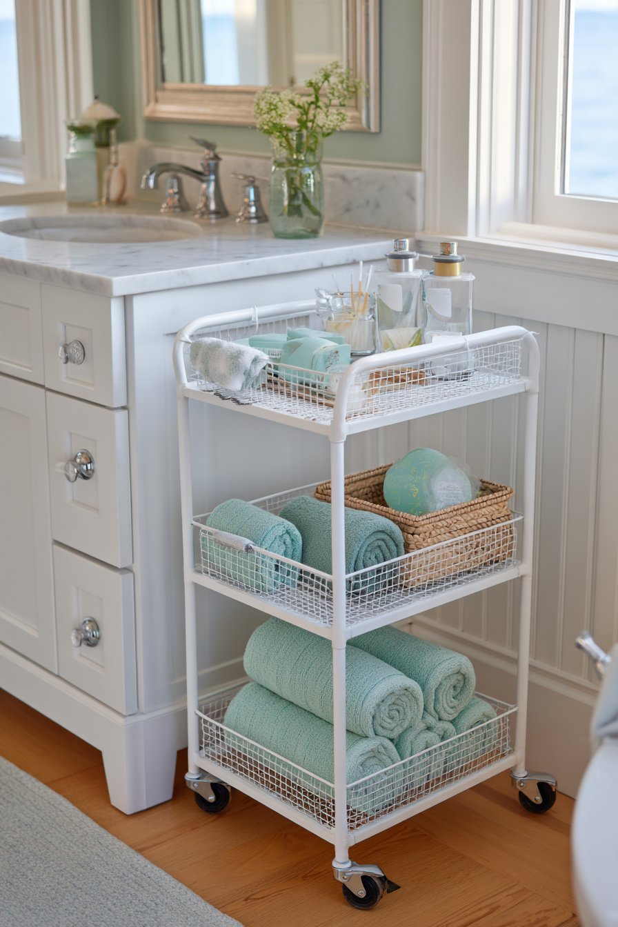A white three-tier rolling cart positioned beside the vanity demonstrates how mobile storage can provide flexibility and functionality in small coastal bathrooms where built-in cabinetry may be limited. The cart holds neatly organized toiletries on its top tier, rolled hand towels in seafoam green on the middle level, and small woven baskets containing cotton swabs and other essentials on the bottom. The chrome frame provides subtle shine while maintaining an open, airy appearance that doesn’t visually clutter the small space.
