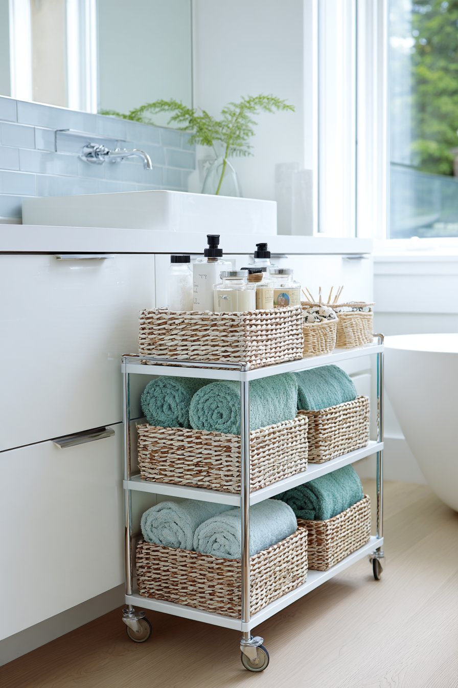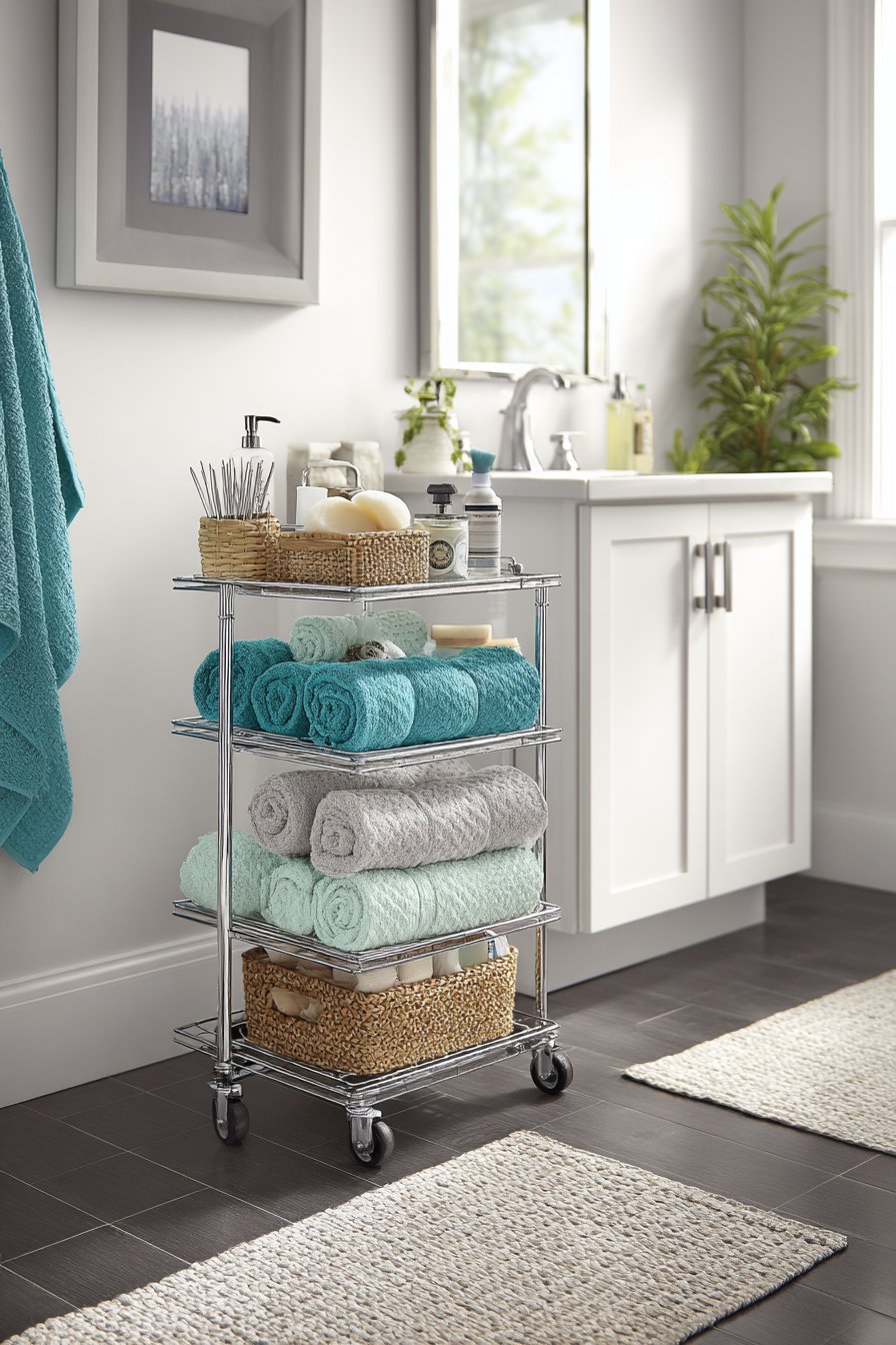 - Use rolling carts in small bathrooms to gain flexible storage without permanent installation