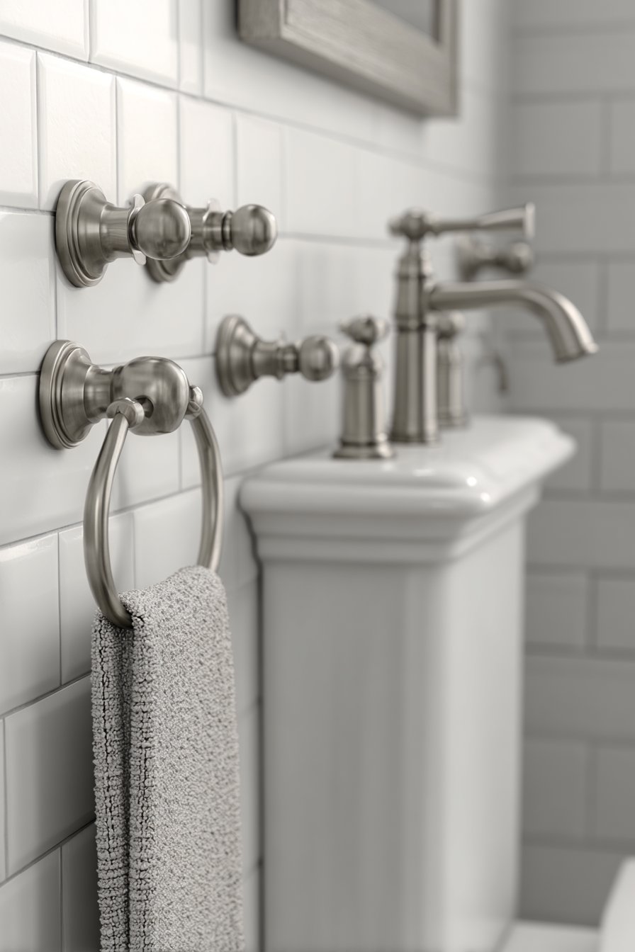 White subway tile backsplash and white countertop allow the brushed nickel fixtures to stand out as jewelry-like accents, their warm metallic tones adding sophistication against the predominantly white palette. The brushed finish offers practical advantages beyond aesthetics—it shows fingerprints and water spots less readily than polished finishes, maintaining its attractive appearance with minimal maintenance. The consistent finish across all hardware creates visual harmony that signals intentional design rather than random fixture selection.