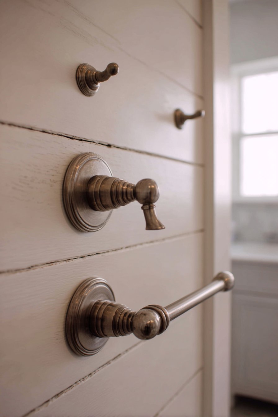 The careful selection and coordination of brushed nickel hardware throughout this small coastal bathroom—including widespread faucet, towel bars, toilet paper holder, and robe hooks—demonstrates how consistent finishes create visual cohesion that makes spaces feel professionally designed. Mounted against white shiplap walls, the hardware’s subtle brushed texture provides sophisticated contrast without the high-glare shine of polished chrome. A detail-focused view reveals the quality craftsmanship in each piece, from the precision of the faucet’s construction to the smooth finish on the towel bar.