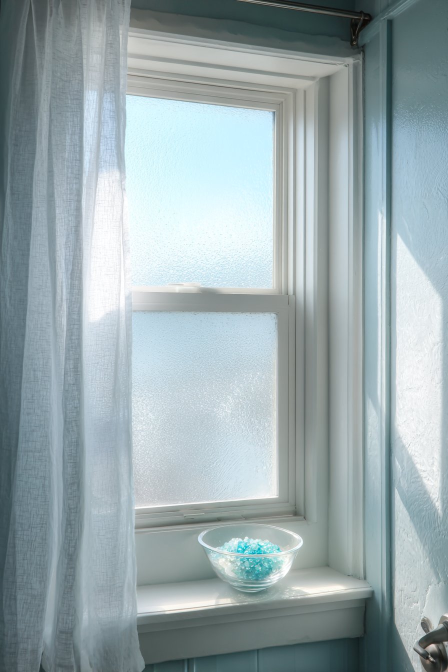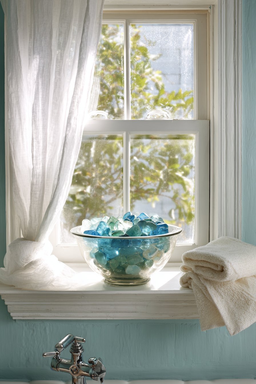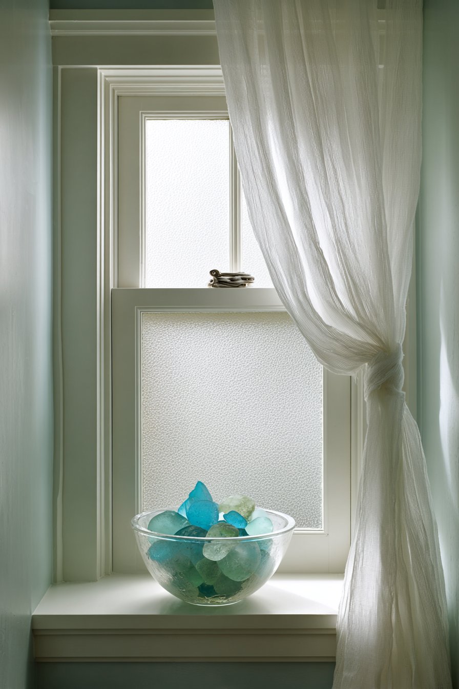 A white-framed casement window with thoughtful detailing transforms a purely functional element into a coastal focal point in this small bathroom. The frosted lower pane provides essential privacy while the clear upper section admits natural light and frames sky views. The window sill becomes a miniature coastal gallery displaying smooth beach glass pieces in blues and greens, arranged artfully in a clear glass bowl that allows light to pass through the translucent treasures. A sheer white linen curtain on a simple chrome rod can be drawn across the window when additional privacy is desired.