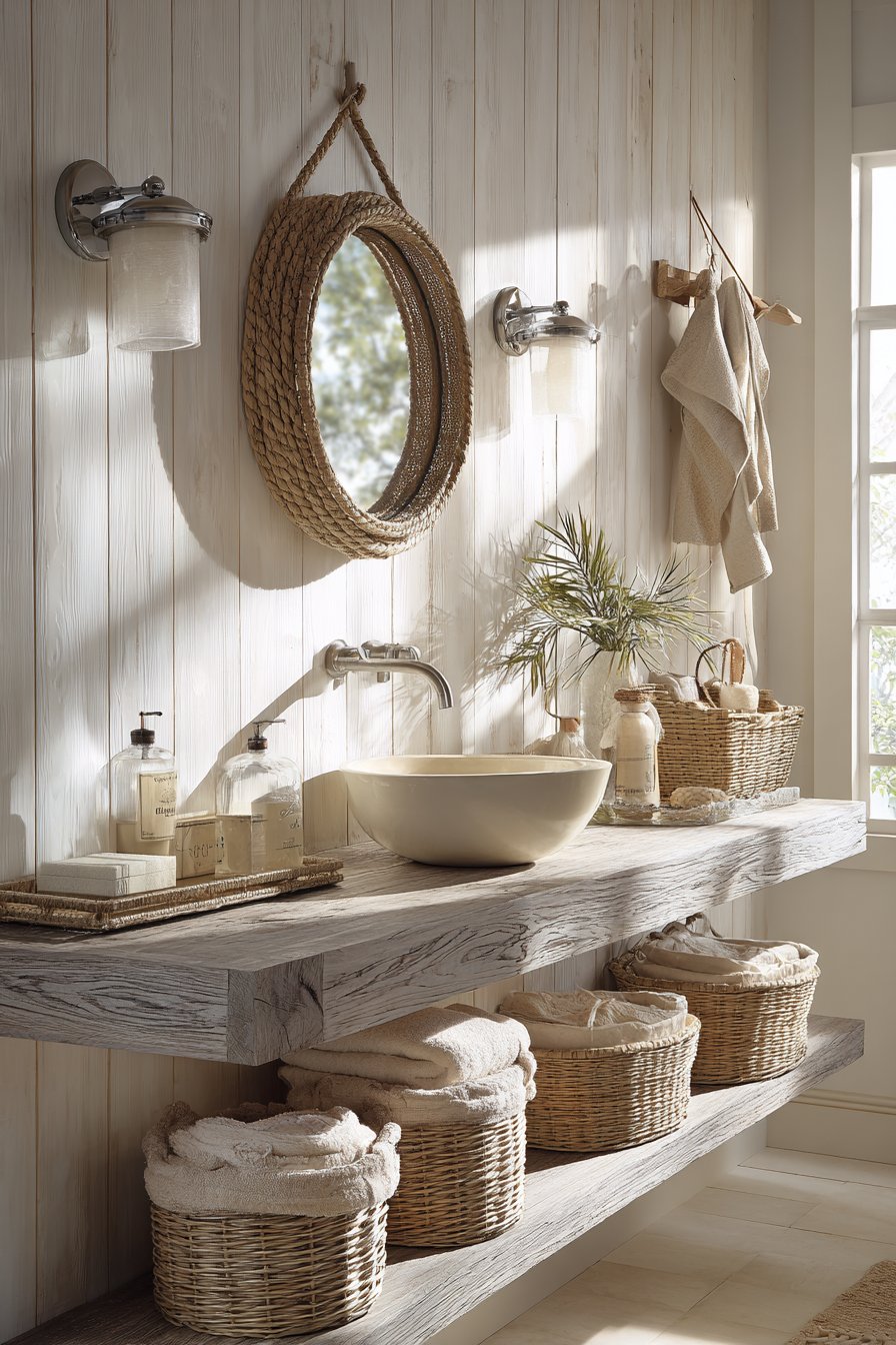 Natural materials featured throughout these designs—weathered wood, marble, jute, linen, rope—connect bathrooms to coastal environments while adding the textural variation that keeps neutral color schemes interesting. These organic materials bring warmth that prevents all-white bathrooms from feeling sterile or cold, creating spaces that invite relaxation rather than clinical efficiency. The emphasis on authentic materials rather than synthetic imitations ensures these bathrooms will age gracefully, developing character over time rather than showing wear.