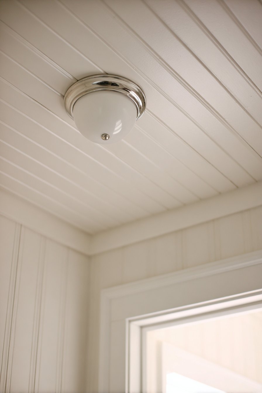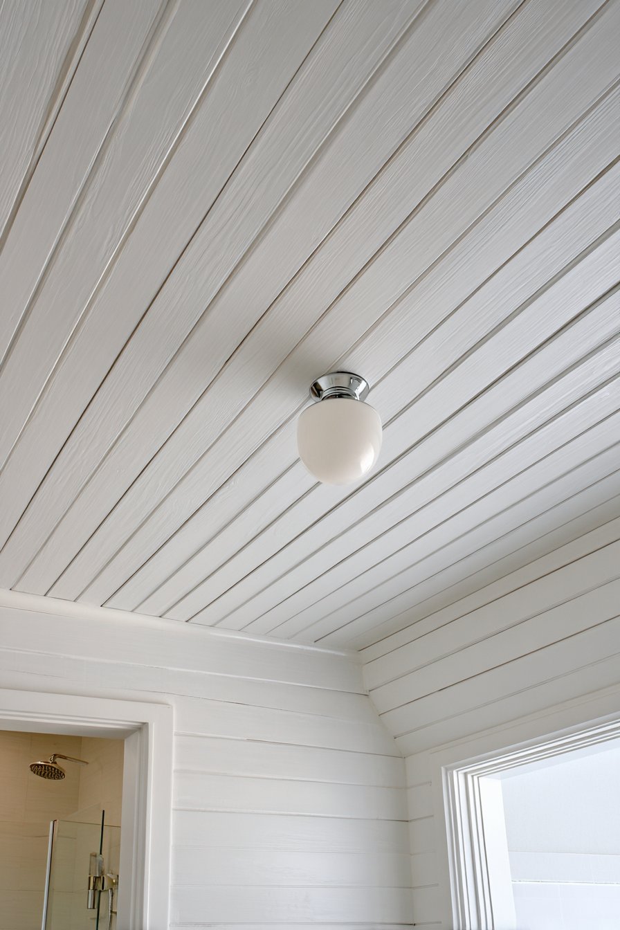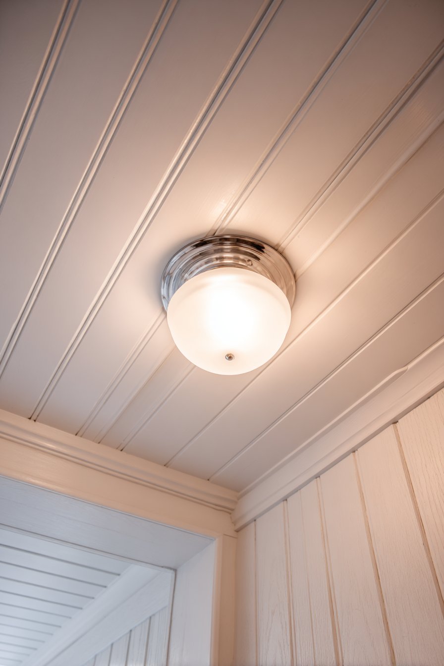 The flush-mount fixture represents smart planning for small bathrooms with standard ceiling heights—pendant lights or chandeliers that hang down would create head-bumping hazards and visually lower the ceiling, while this flush design provides necessary illumination without sacrificing precious vertical clearance. The white glass shade diffuses light evenly across the planked ceiling, emphasizing the wood grain texture and creating the kind of general ambient lighting that makes small spaces feel welcoming rather than cave-like.