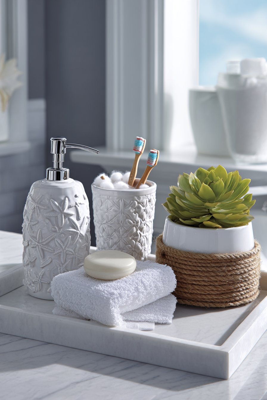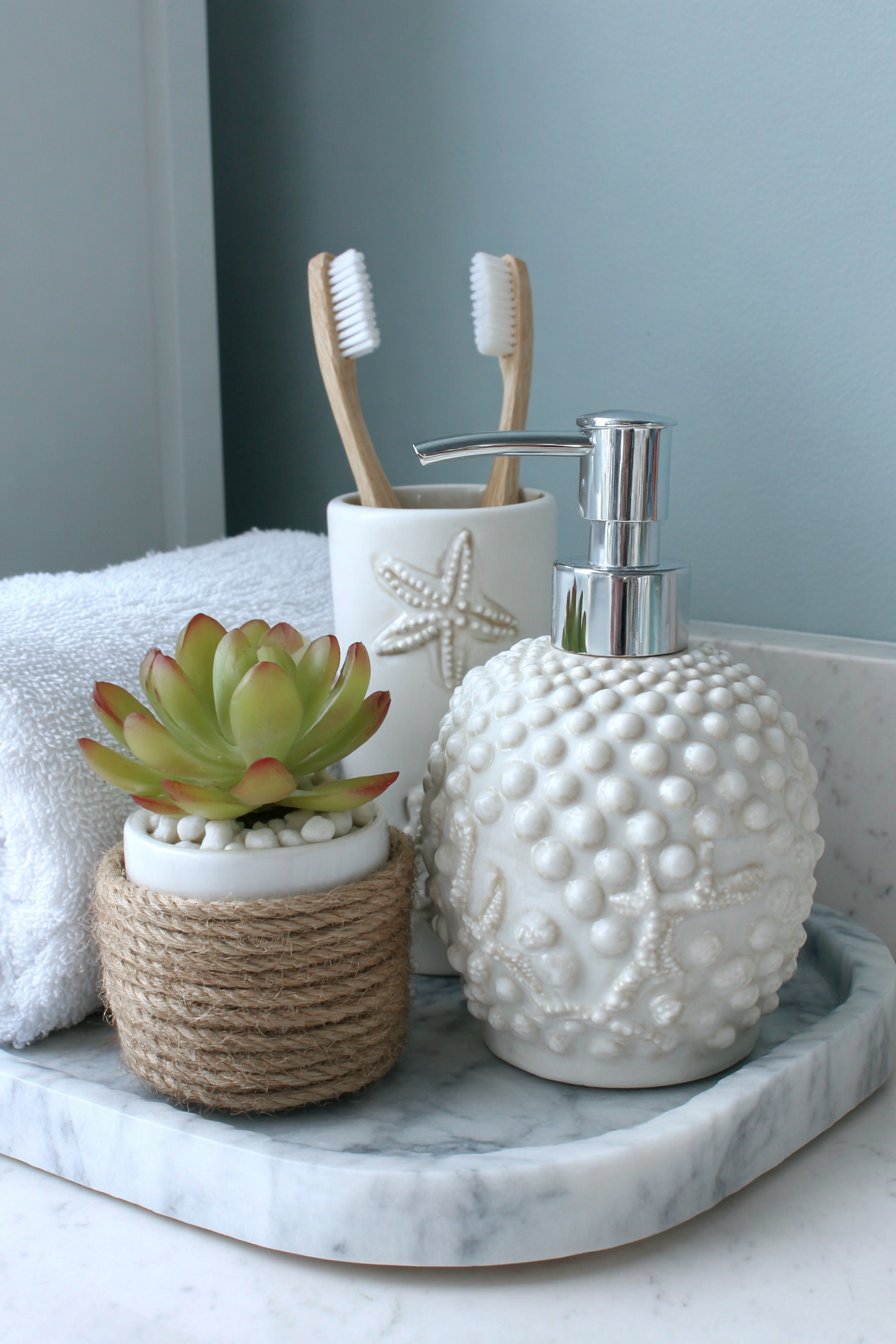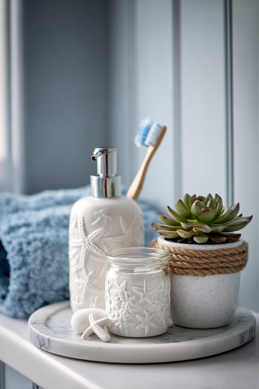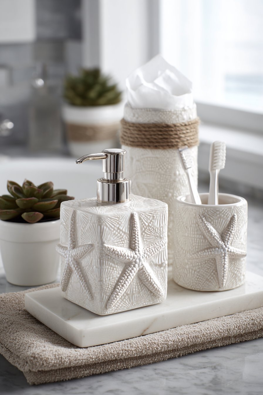 The final small coastal bathroom idea focuses on the power of carefully curated accessories to establish and reinforce your design theme. A white ceramic soap dispenser embossed with a delicate starfish pattern sits alongside a coordinating toothbrush holder and cotton ball jar, all arranged on a white marble tray that contains and organizes these essentials. A small potted succulent in white ceramic provides a living element that purifies air and adds organic form. The natural rope-wrapped tissue box cover completes the coordinated look.