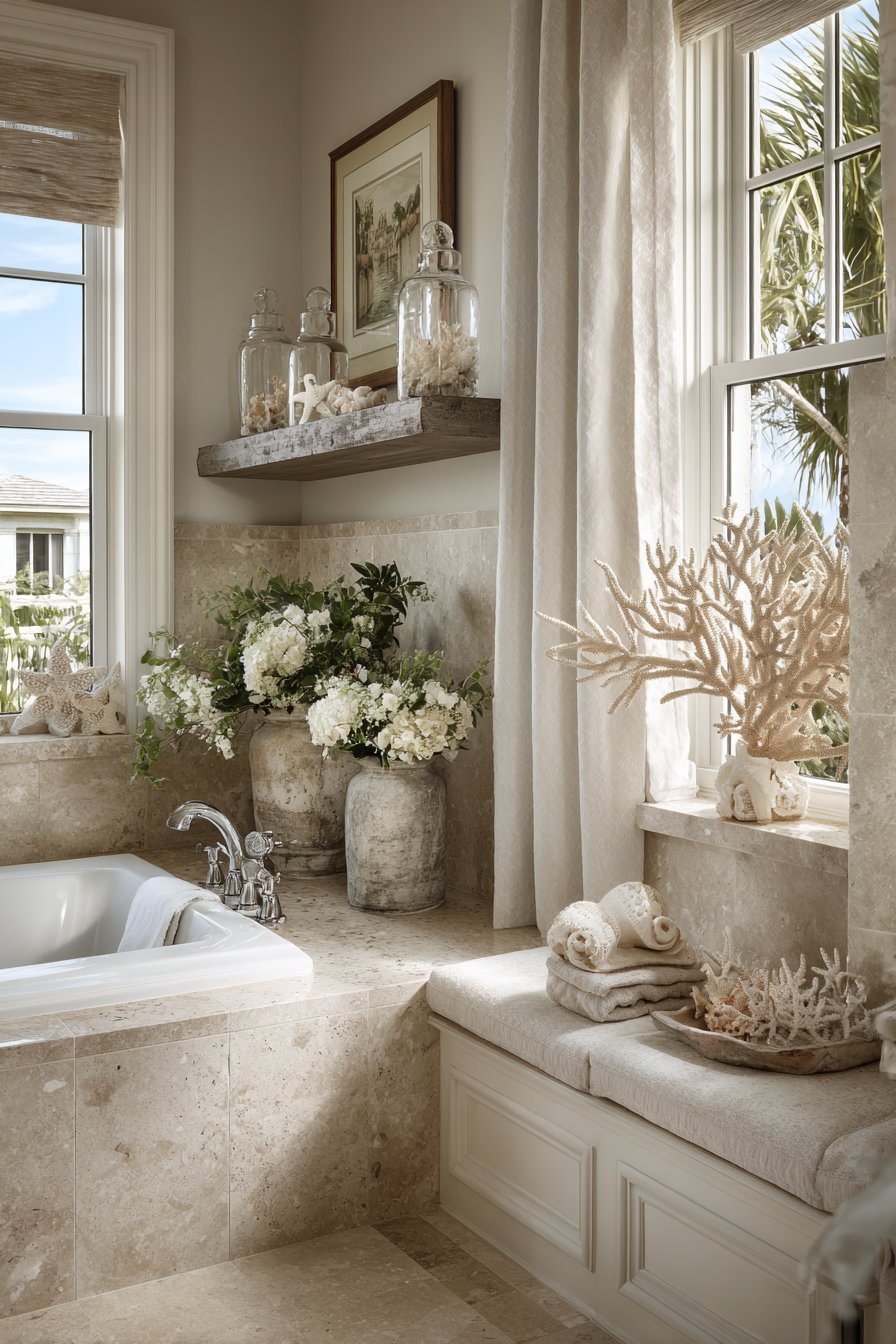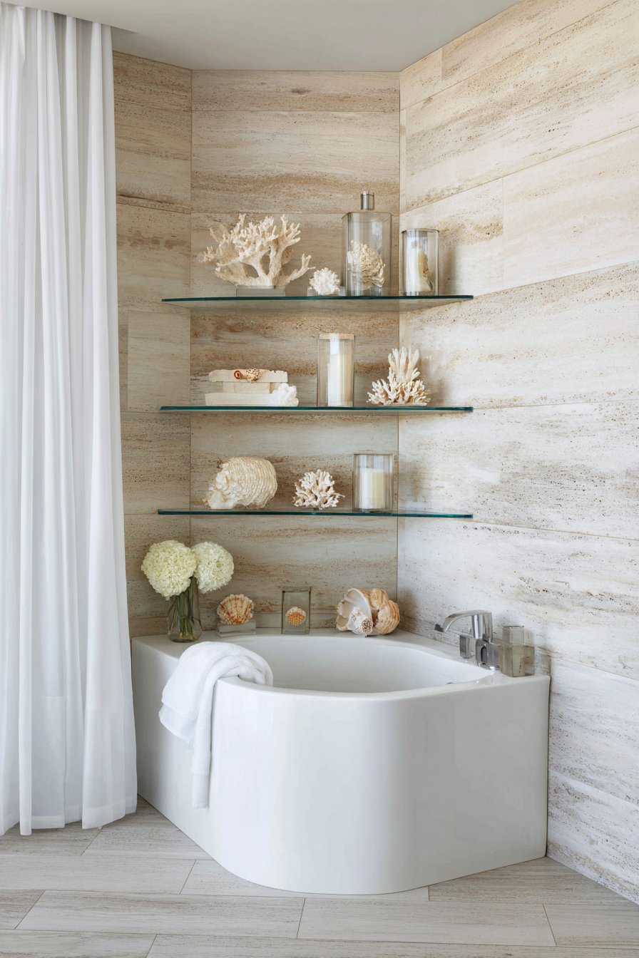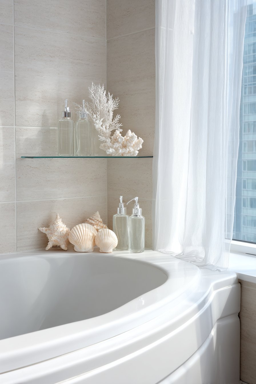 A narrow floating shelf mounted within easy reach of the tub provides the perfect perch for coastal accessories including preserved coral specimens and glass bottles filled with collected shells—personal treasures that tell stories of beach walks and ocean adventures. The sheer white linen curtain drawn across the window maintains privacy while still allowing natural light to filter through, creating that characteristic coastal luminosity that makes small spaces feel airy and open. This delicate balance between privacy and light is crucial in small bathrooms where windows are often the primary source of natural illumination.