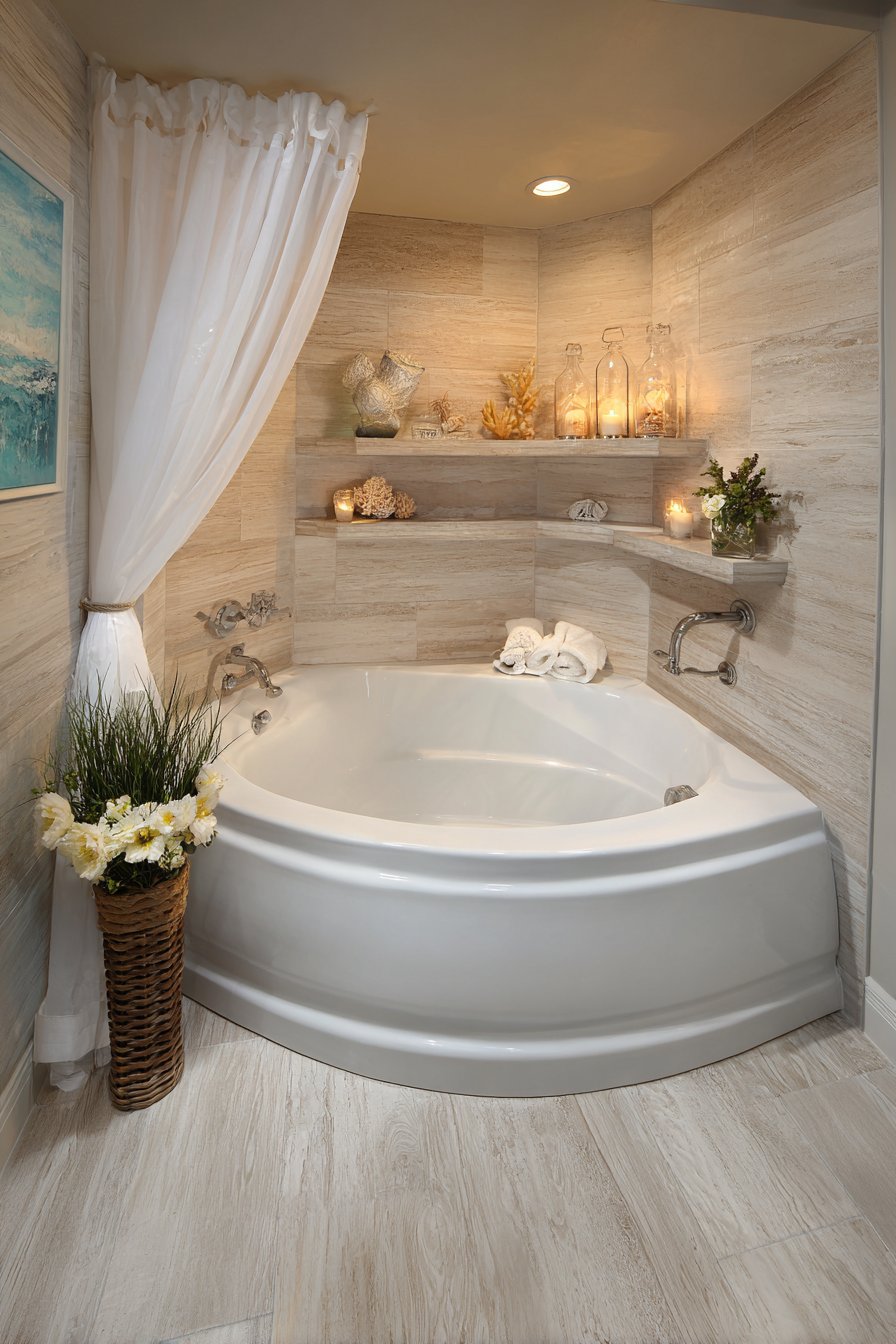 - Install corner tubs in small bathrooms to maximize usable floor space while maintaining soaking capacity