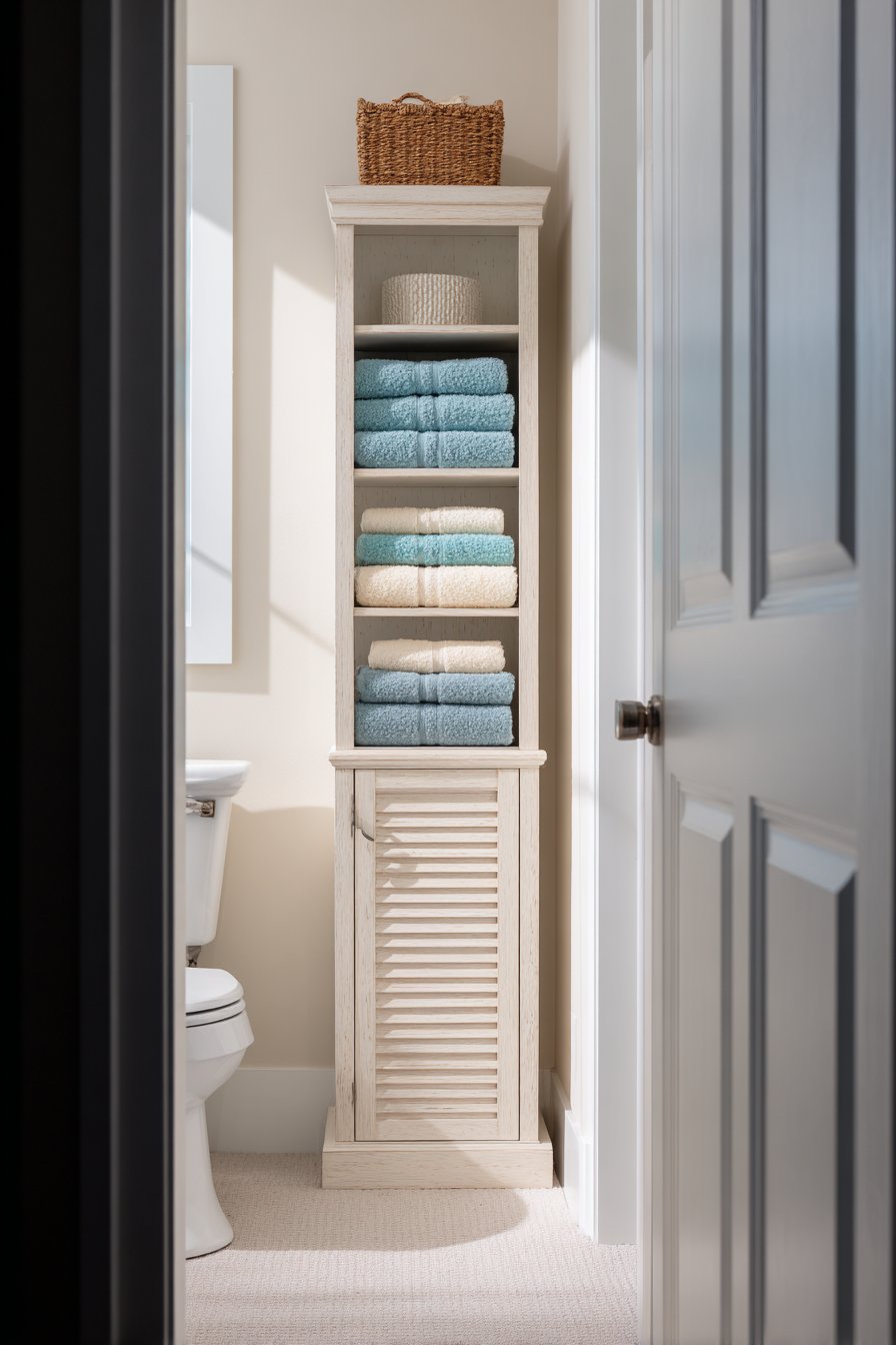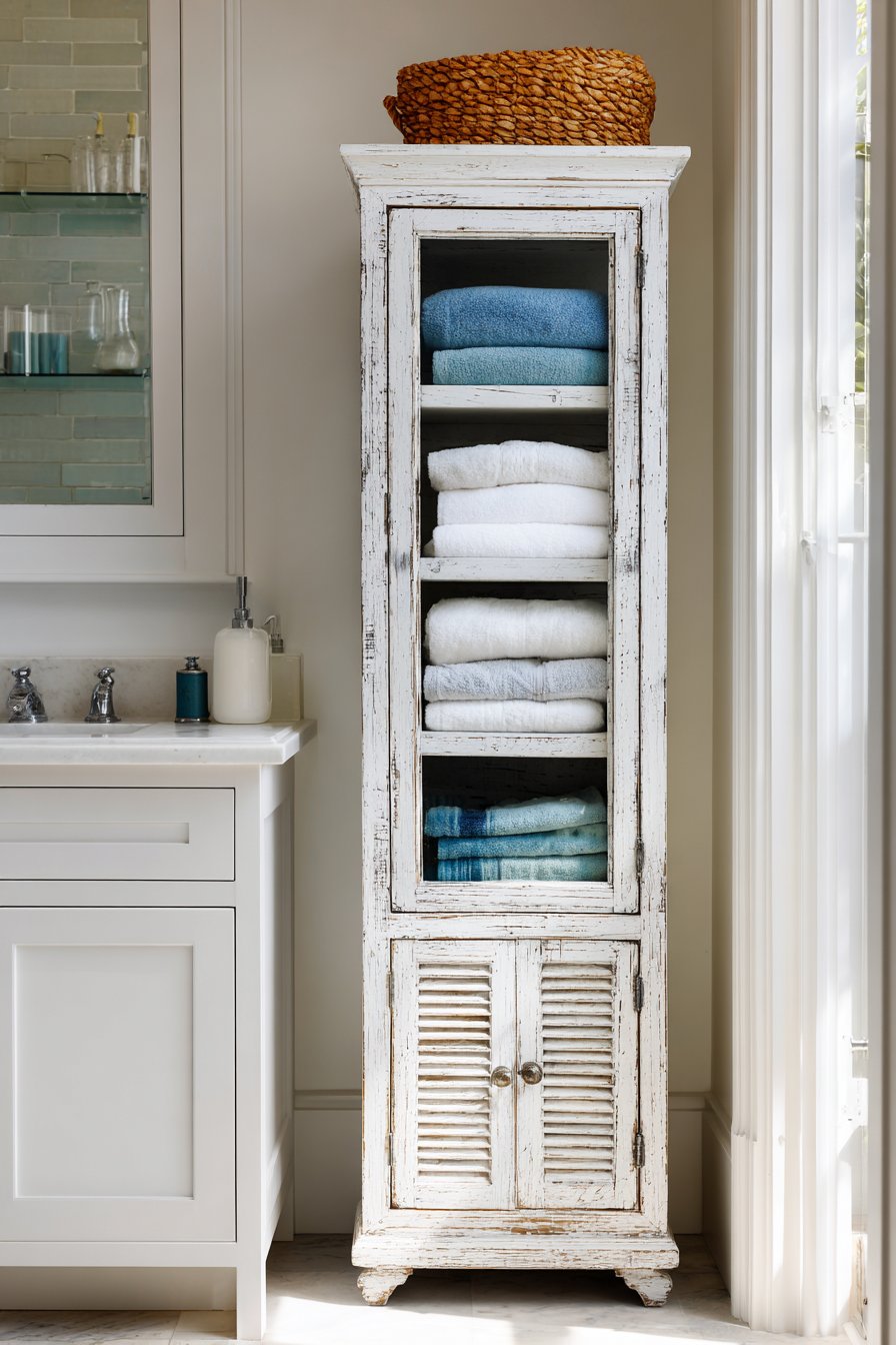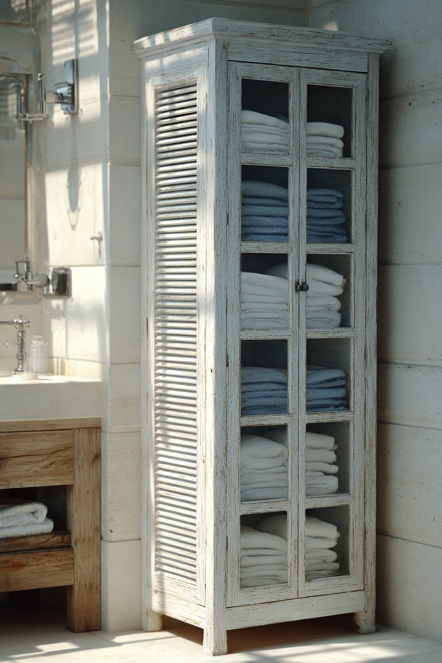When floor space is at a premium, the solution lies in looking upward, as demonstrated by this small coastal bathroom idea featuring a tall narrow cabinet in distressed white wood with louvered doors reminiscent of classic beach house shutters. This vertical storage powerhouse fits perfectly into a slim wall niche, proving that even the narrowest spaces can accommodate functional cabinetry when you choose appropriately scaled pieces. The glass-paneled sections allow you to display folded towels in ocean blues and crisp whites, turning practical storage into an attractive design element that reinforces the coastal color scheme.