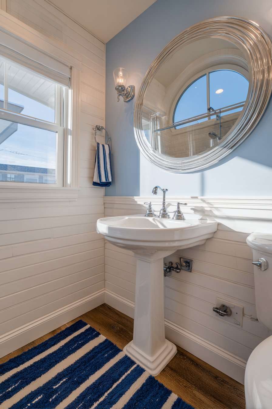 The pedestal sink’s classic form takes up minimal floor space while its polished chrome fixtures add subtle reflective shine that enhances the room’s brightness. A porthole-style medicine cabinet serves double duty as both practical storage and a distinctive nautical focal point, its circular shape breaking up the rectangular lines that dominate most bathrooms. This unexpected geometric variation adds visual interest while staying true to authentic maritime design elements found in actual ships and historic beach cottages.