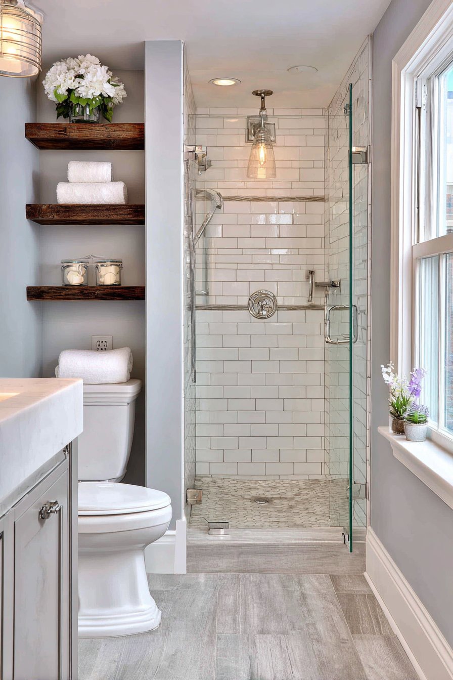 The compact glass-enclosed shower occupies a corner position, its white subway tile interior creating bright contrast against the gray walls. This tonal variation prevents the monochromatic scheme from feeling flat or monotonous, demonstrating how different values of the same color family can create depth and dimension. Recessed shelving built between wall studs provides storage without protruding into the limited space—a crucial consideration in small bathrooms where every inch of clearance affects movement and functionality.
