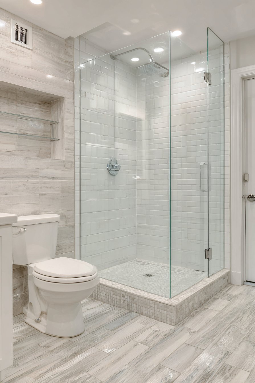 - Use continuous flooring from bathroom into shower to eliminate visual breaks