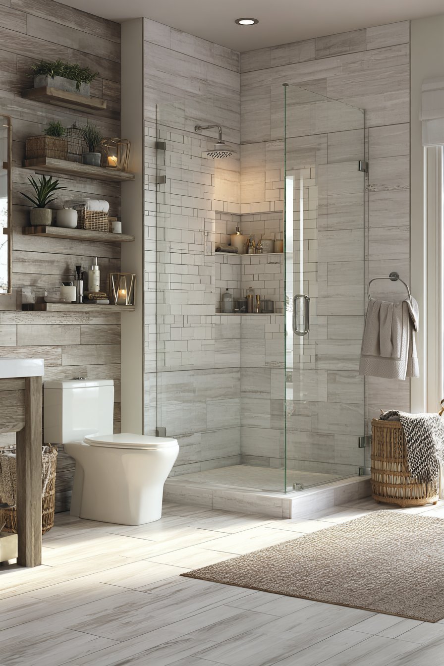 - Incorporate living plants that thrive in bathroom humidity like succulents or air plants