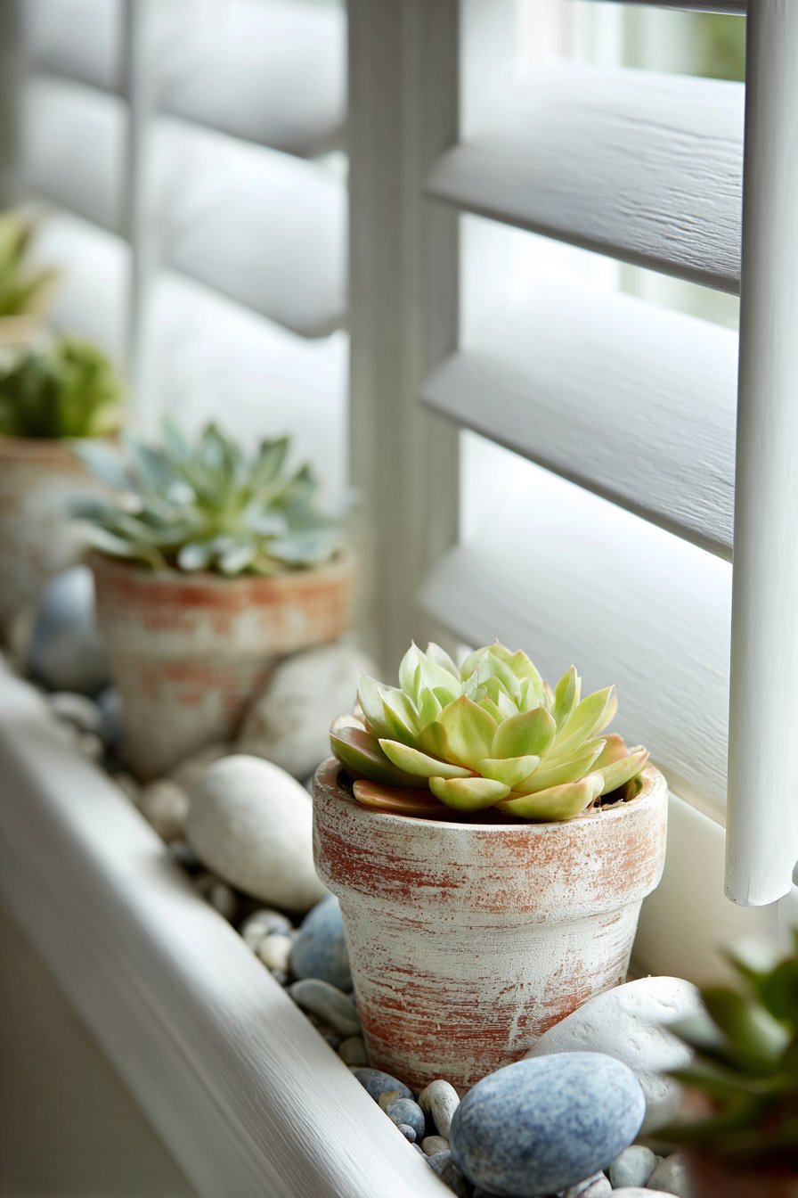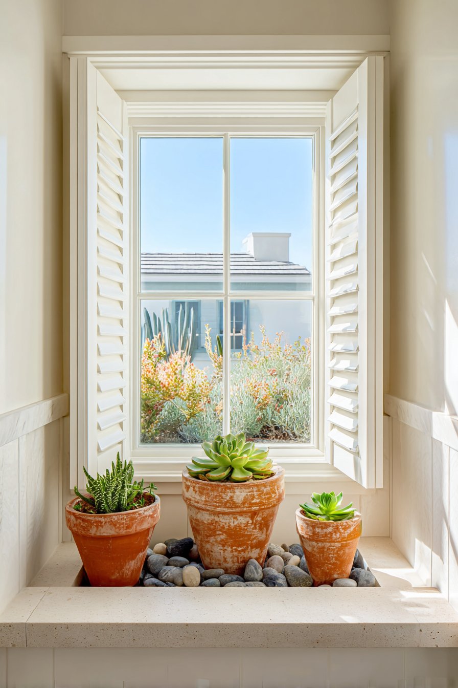 By treating the window as a focal point rather than covering it completely with curtains or shades, this design maximizes the connection between indoor and outdoor spaces—a hallmark of successful coastal interiors. The succulents on the sill require minimal maintenance while adding living greenery that purifies air and introduces organic shapes. The beach stones represent free, personal decor that carries memories and meaning, proving that the best coastal accessories don’t come from stores but from beaches you’ve walked and waters you’ve waded through.