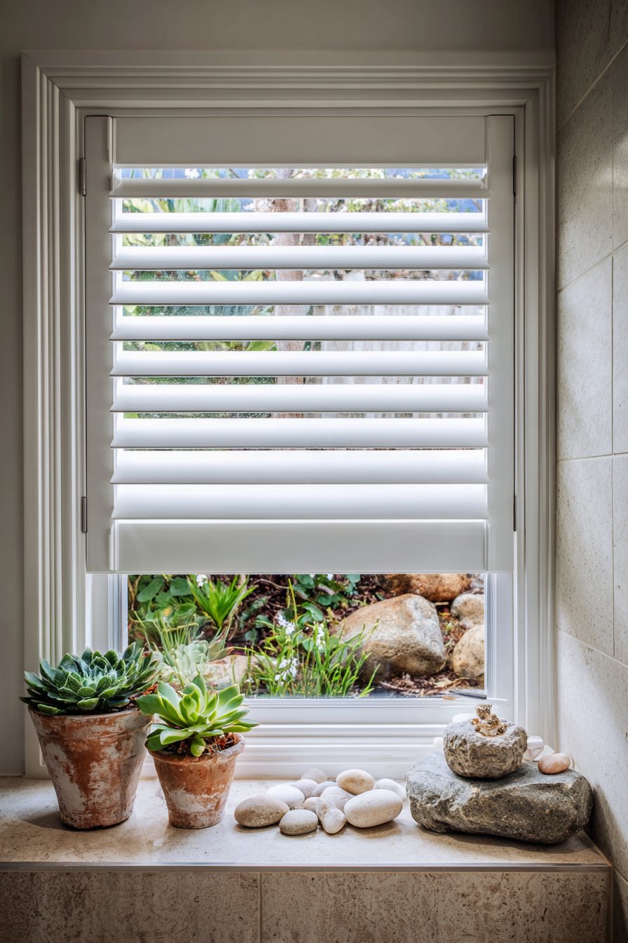 The adjustable louvers on the plantation shutters offer flexibility that’s particularly valuable in bathrooms—you can angle them to admit light while maintaining privacy, close them completely during use, or open them fully to frame the outdoor view. This versatility makes plantation shutters an excellent investment for small coastal bathrooms where the window often represents the primary light source. The crisp white finish of the shutters enhances brightness while their substantial construction adds architectural weight that elevates the entire space.