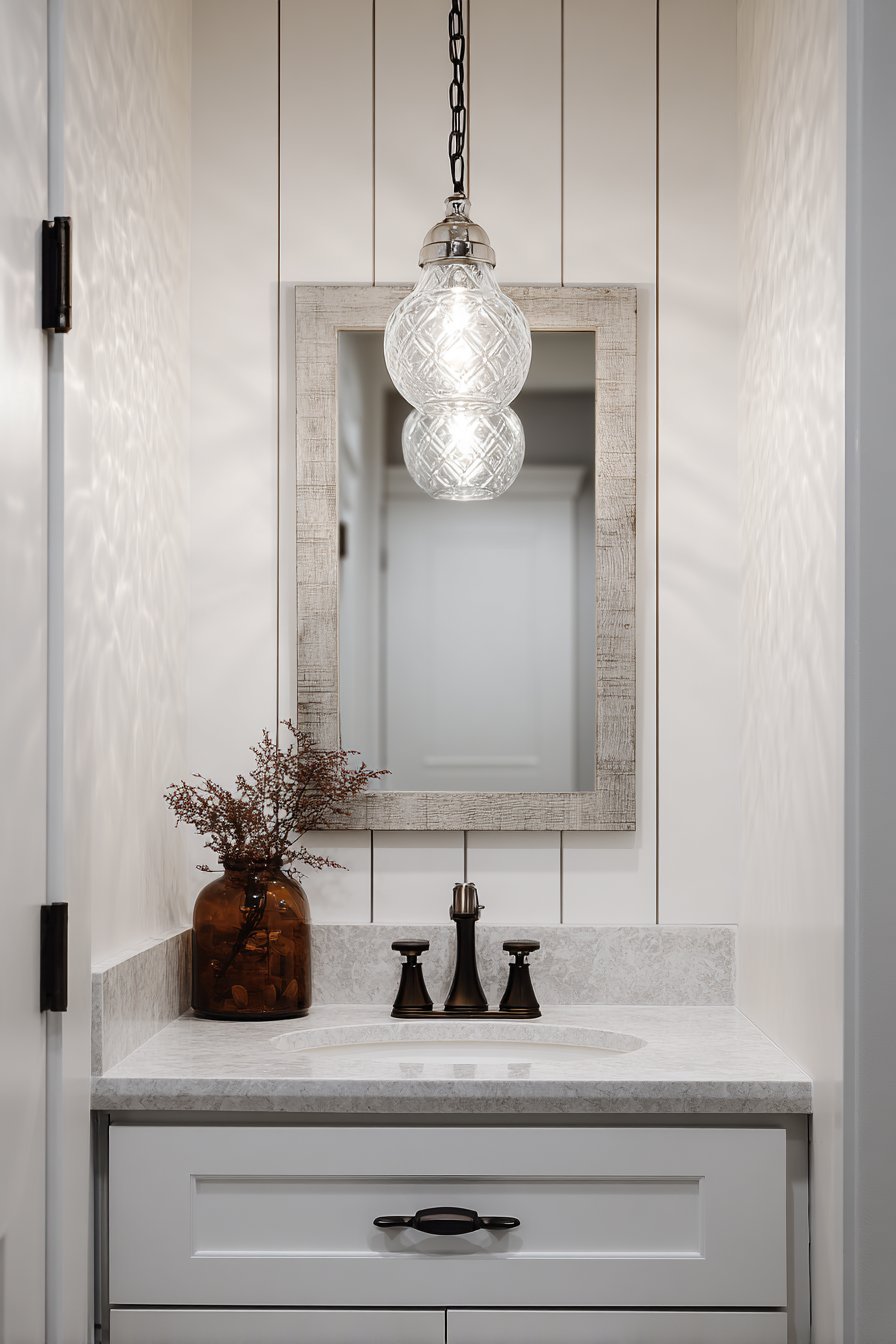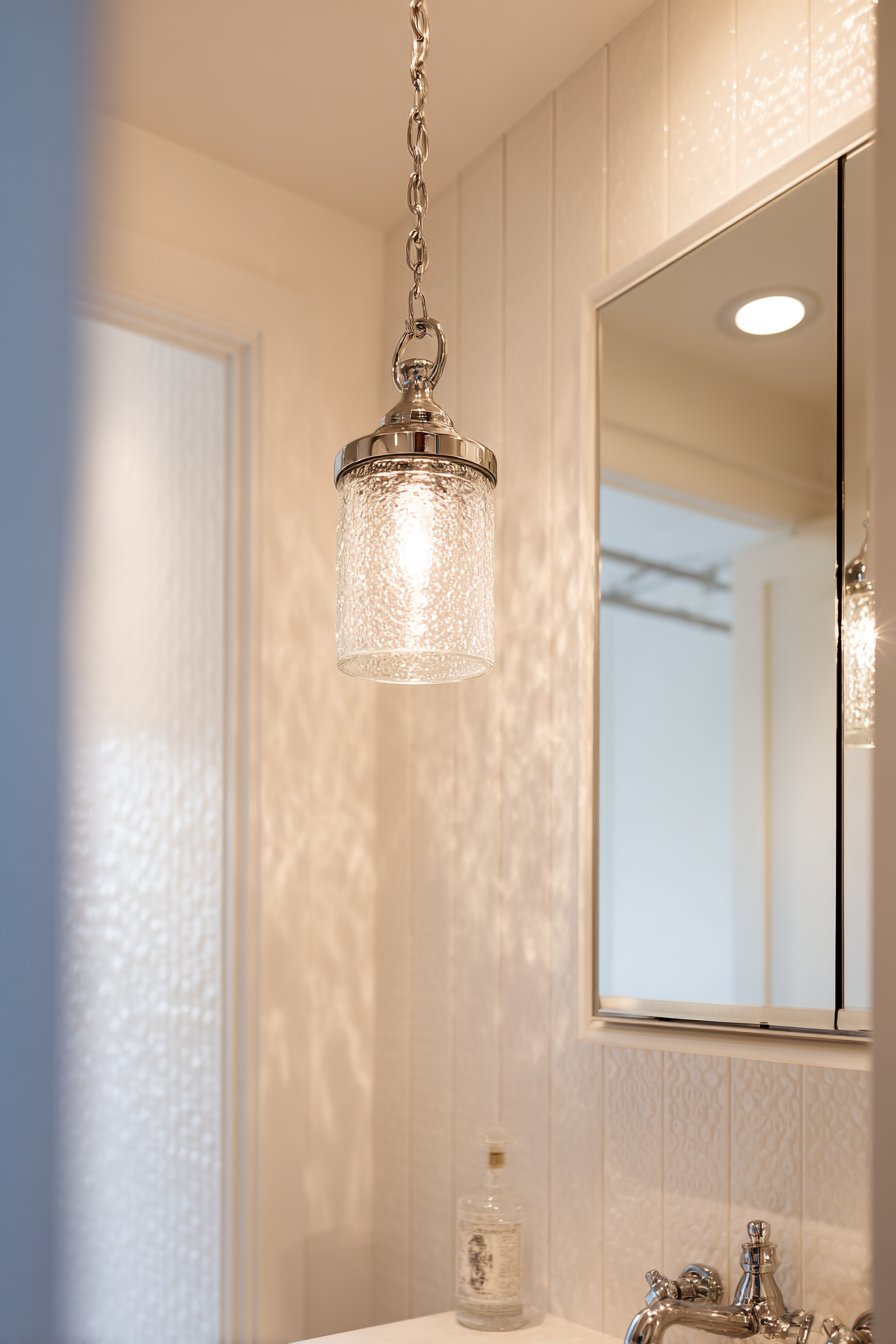 Effective lighting design separates mediocre bathrooms from exceptional ones, as evidenced by this small coastal space featuring a vintage-inspired chrome and glass pendant light suspended above a narrow vanity. The seeded glass shade references old ship lanterns while casting intriguing light patterns across white beadboard walls, creating visual interest beyond simple illumination. A medicine cabinet with integrated LED strip lighting provides focused task lighting exactly where it’s needed for grooming activities, while the soft shadows created by the layered approach add depth and dimension to the compact room.