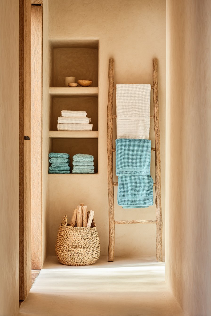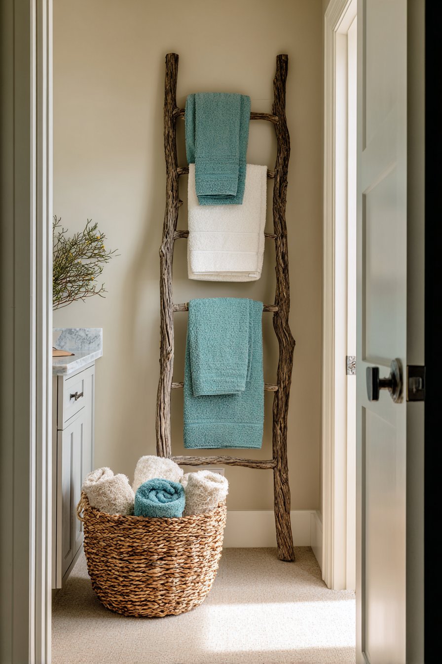 The pale sandy beige walls provide a neutral backdrop that allows the natural wood tones of the ladder to stand out while maintaining the light, airy feeling essential to successful small coastal bathroom design. This approach to towel storage transforms a purely functional necessity into a decorative element—the carefully chosen towels in coordinating colors become part of the room’s visual composition rather than items that need hiding. The varying textures of waffle-weave cotton, smooth standard towels, and woven basket materials create tactile interest that engages multiple senses.