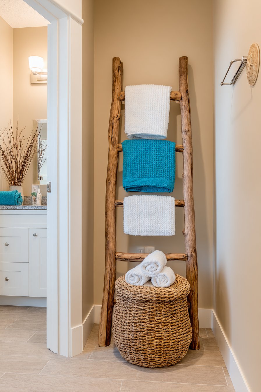 A wall-mounted ladder shelf crafted from natural driftwood-toned wood brings both storage and sculptural appeal to this small coastal bathroom, its four rungs providing designated spots for white waffle-weave towels and turquoise hand towels to hang in organized display. The ladder design capitalizes on vertical space without consuming precious floor area, making it ideal for small bathrooms where traditional linen closets aren’t available. A woven basket positioned on the floor below the ladder’s base holds neatly rolled washcloths, completing the storage solution while adding textural contrast.