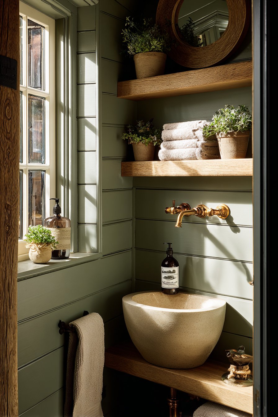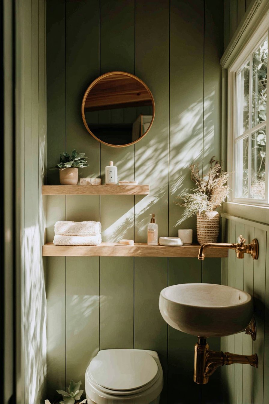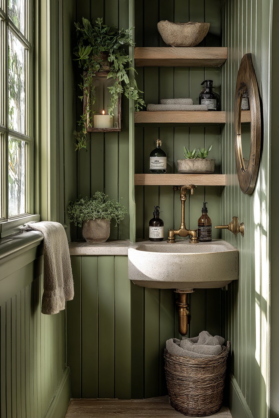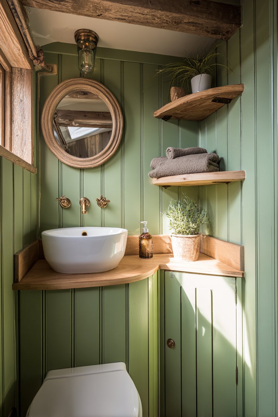 A compact corner sink with vintage-style brass faucet demonstrates how careful fixture selection can maximize floor space while contributing to the overall design narrative. The warm metallic finish of the brass creates a beautiful contrast against both the green and white surfaces, adding a touch of elegance without overwhelming the cottage simplicity. Above the sink, a round mirror framed in natural wood introduces organic warmth and softens the angular geometry of the corner placement.