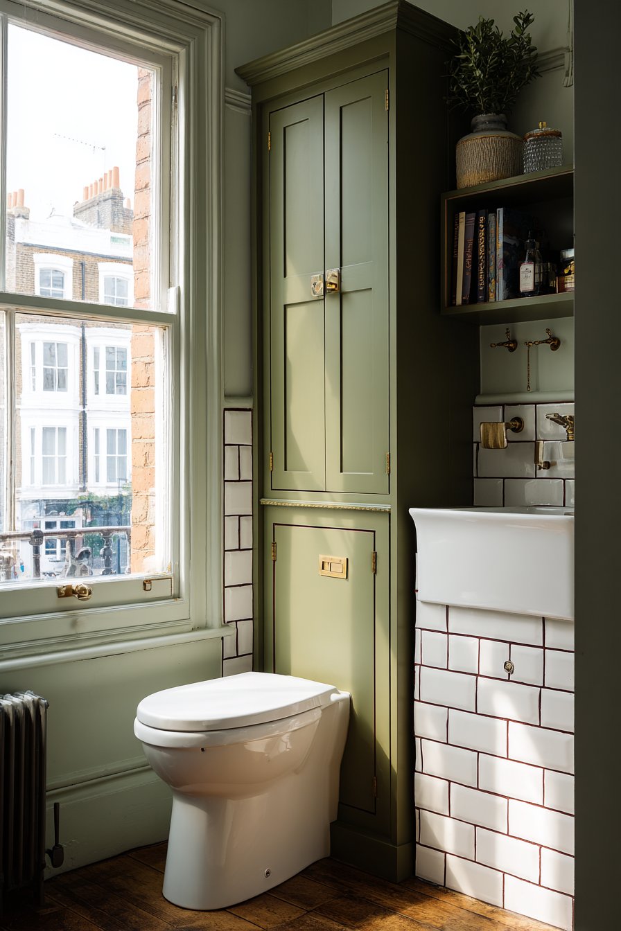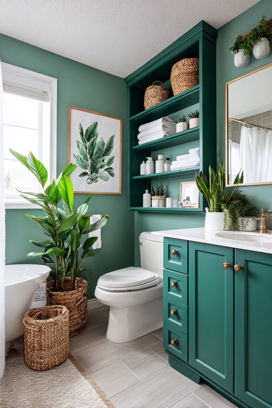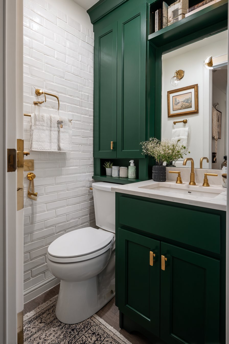 Floor-to-ceiling storage cabinets in deep forest green flank the toilet in this space-maximizing design that proves small bathrooms can offer substantial storage when vertical space is fully utilized. These tall, narrow cabinets extend from floor to ceiling, drawing the eye upward and emphasizing height rather than the room’s limited width. The forest green color—a rich, dignified hue with depth and gravitas—adds sophistication while the substantial storage capacity they provide keeps countertops and floors clear of clutter.