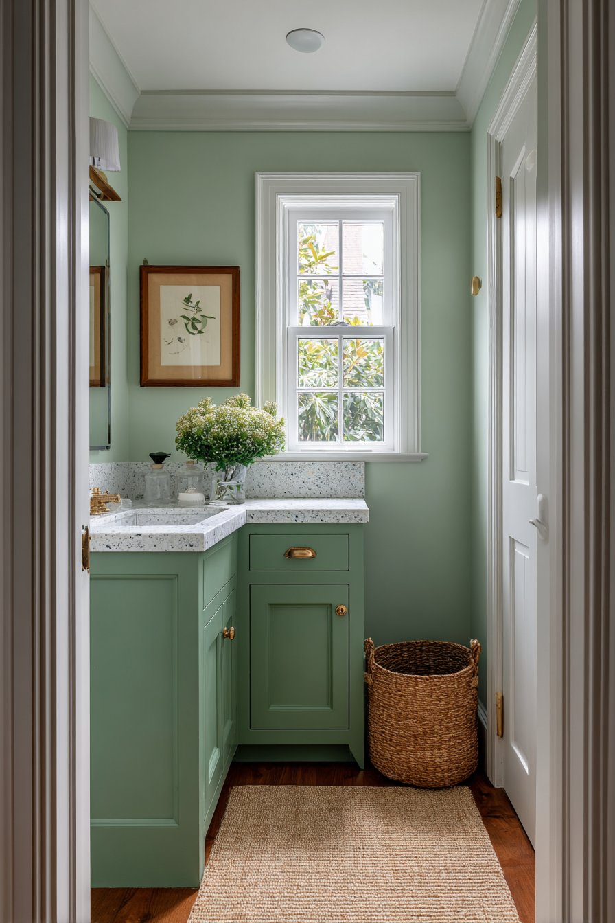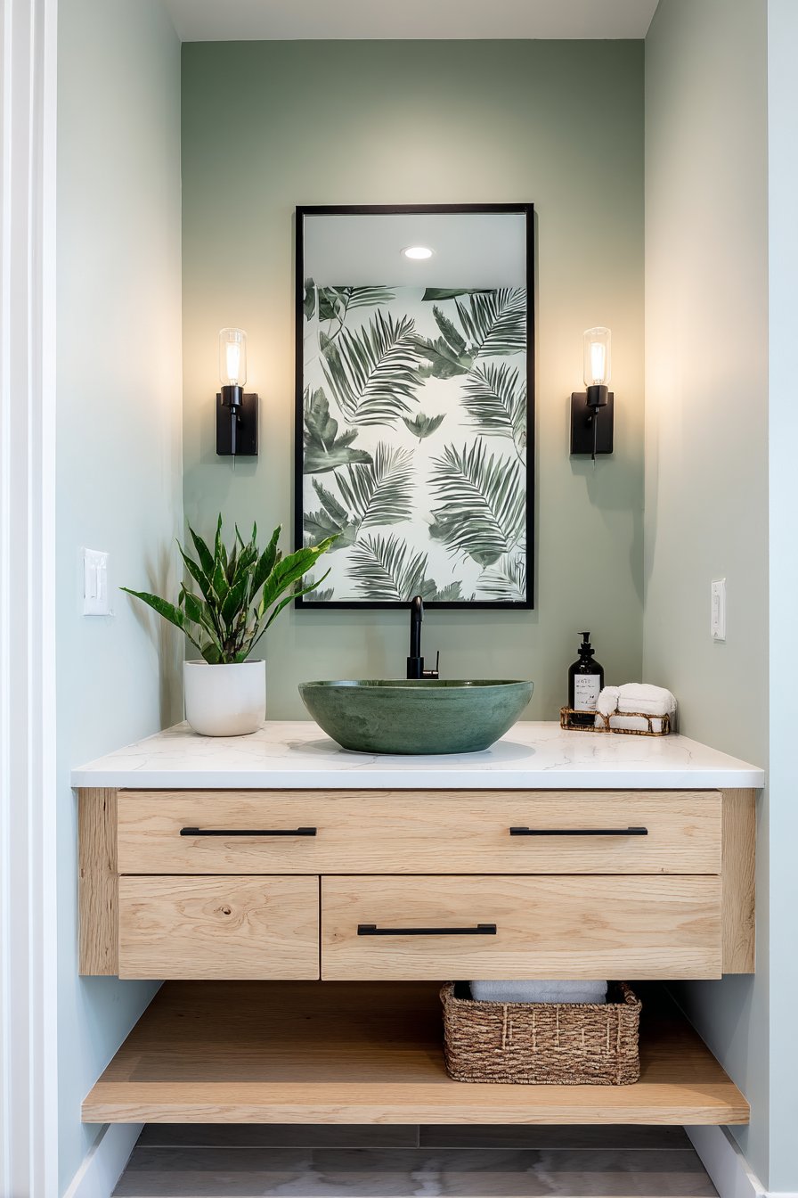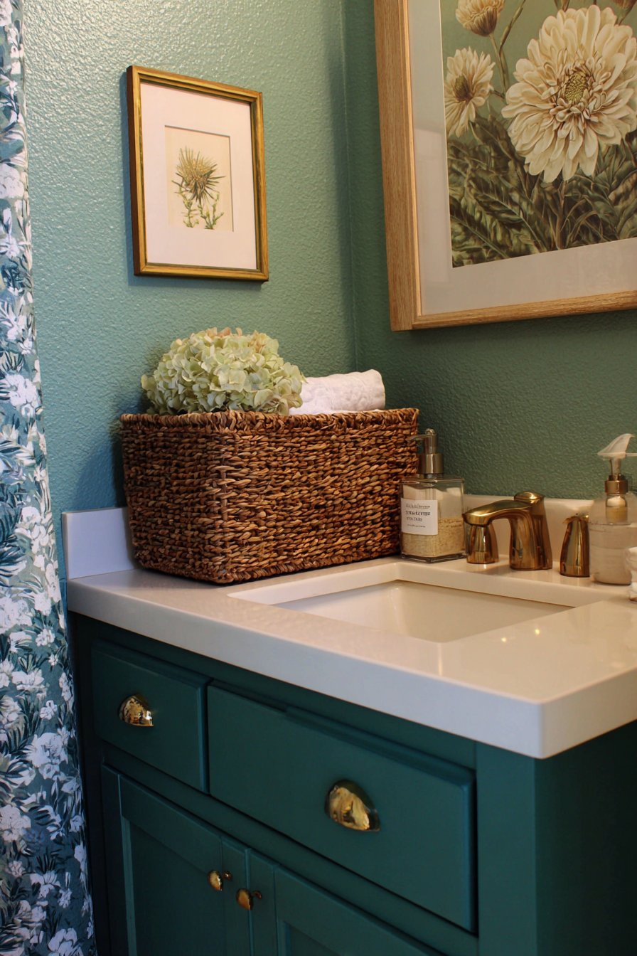 Walls painted in coordinating seafoam green extend the color story while keeping the overall feel light and airy. This lighter wall color prevents the deep teal vanity from overwhelming the space, creating a pleasant color gradient from darker lower elements to lighter upper areas. A woven seagrass basket provides practical storage for extra toiletries while introducing natural texture that softens the painted surfaces. A small framed botanical print adds personality and reinforces the nature-inspired green theme without requiring significant investment.