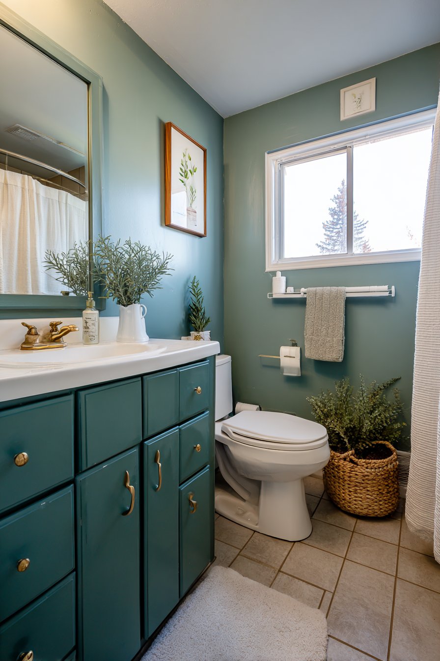 Sometimes the most impactful bathroom transformations come from simple, budget-conscious updates, as demonstrated in this design featuring a DIY painted vanity in deep teal green. This approach proves that you don’t need expensive renovations to achieve dramatic results—a weekend project with quality paint and new hardware can completely transform the look and feel of your bathroom. The deep teal color brings richness and personality to what might have been a builder-grade standard vanity, instantly elevating the space.