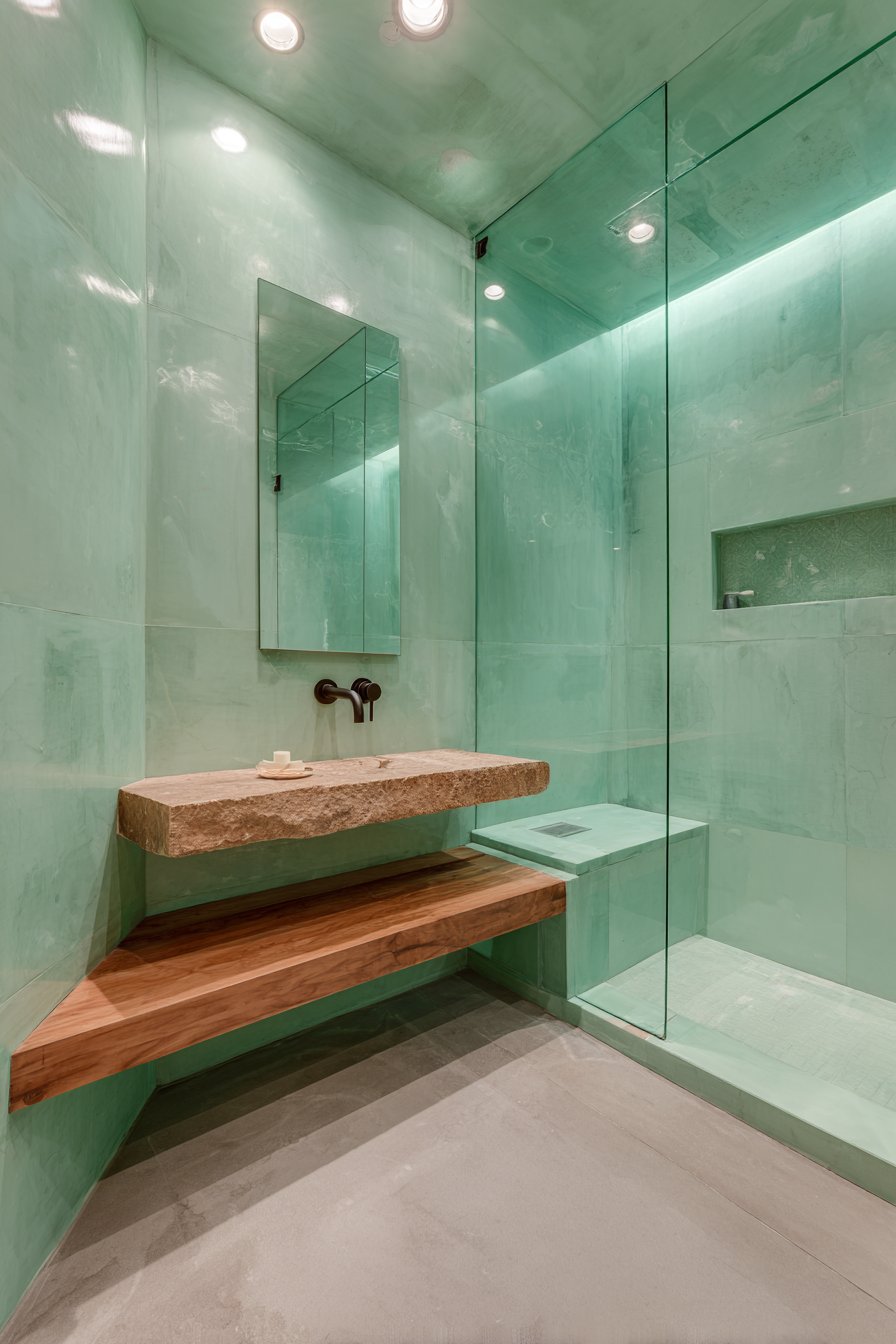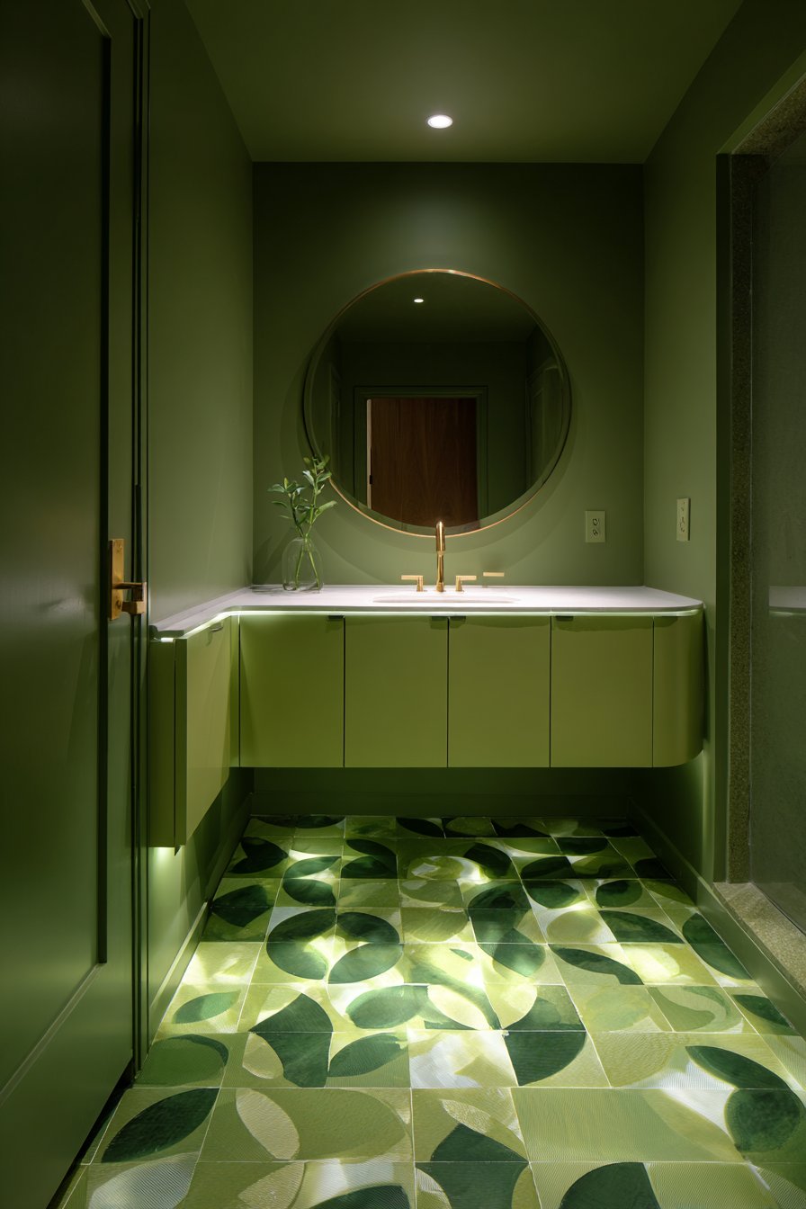 The floating vanity design serves multiple practical purposes beyond its aesthetic appeal. By keeping the floor visible beneath the cabinet, it creates an impression of more square footage and makes cleaning significantly easier. The white oak material brings warmth and natural texture that prevents the bold color choices from feeling too stark or cold. Recessed lighting creates subtle highlights on the varied green surfaces and accentuates the natural wood grain, adding dimensional depth that makes the space feel more expansive.