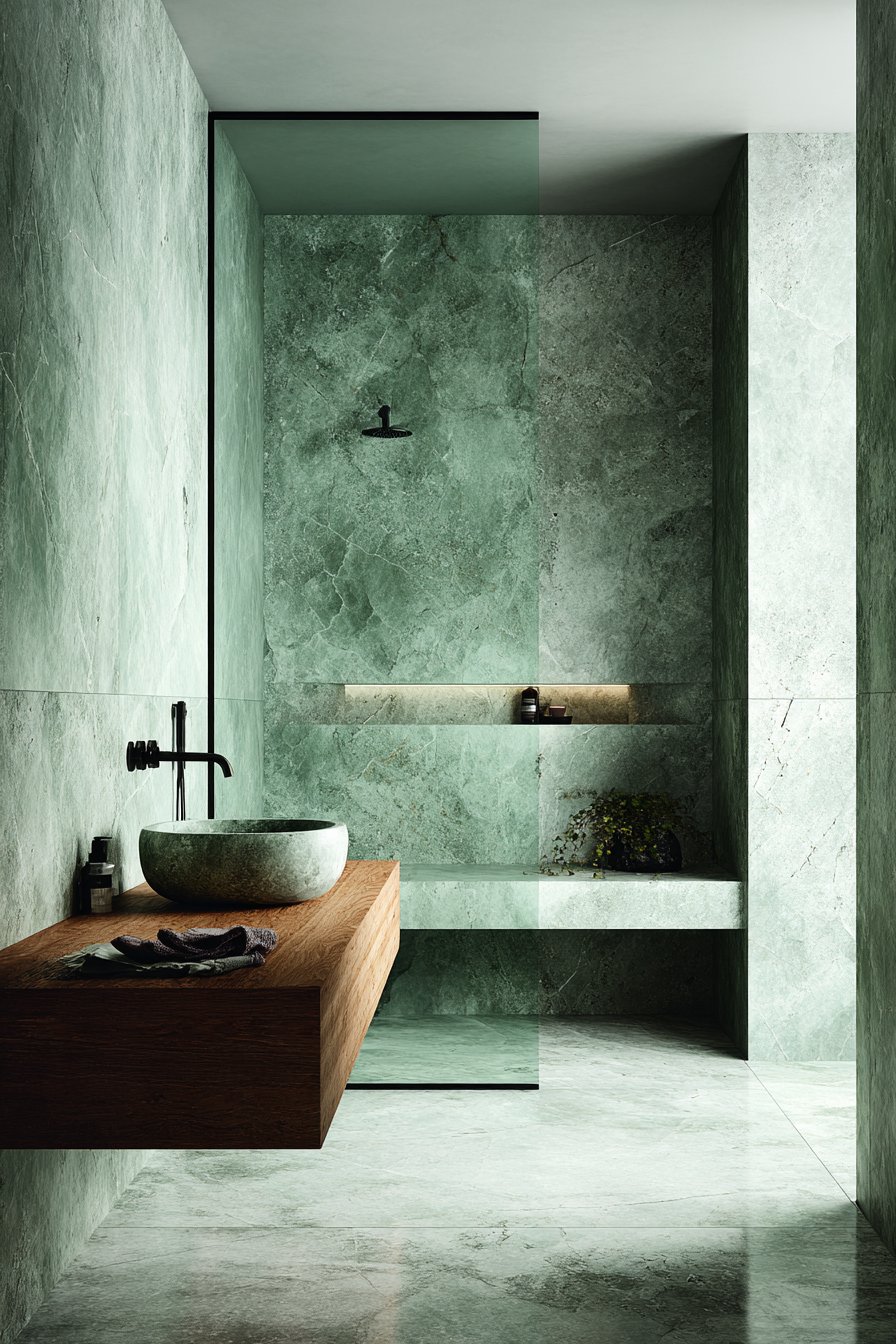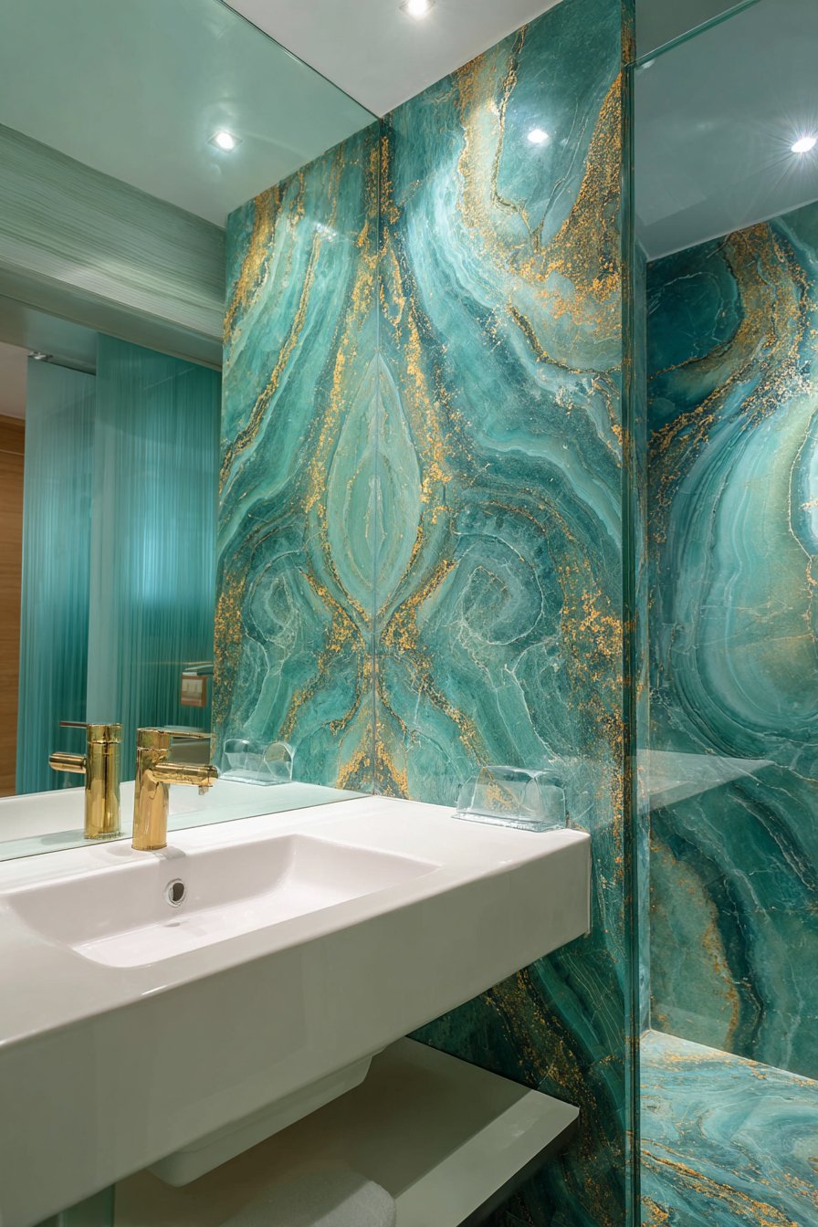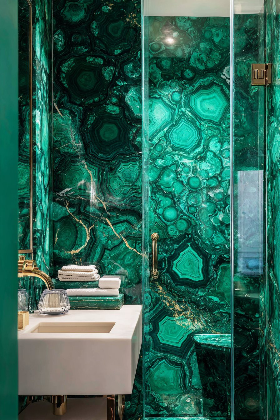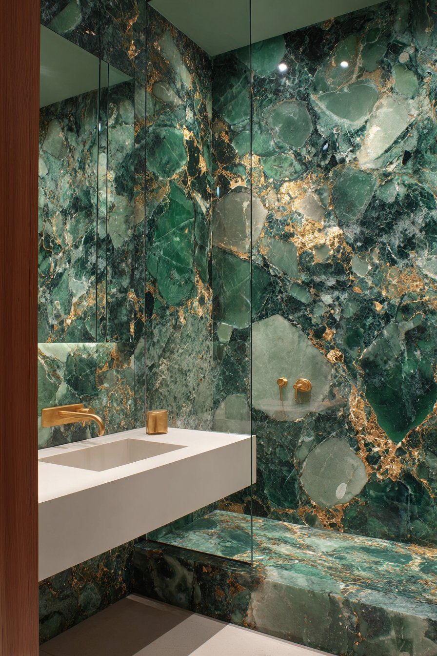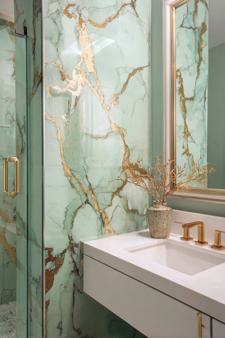 Dramatic book-matched green marble slabs covering the shower wall create an unmistakably luxurious focal point in this high-end bathroom design. Book-matching—cutting a stone slab in half and opening it like a book to create a mirror-image pattern—produces striking symmetrical veining that elevates marble from beautiful material to artistic installation. The green marble, with its characteristic white and gold veining, brings natural pattern and color variation that no manufactured material can truly replicate. Each slab tells a geological story millions of years in the making.