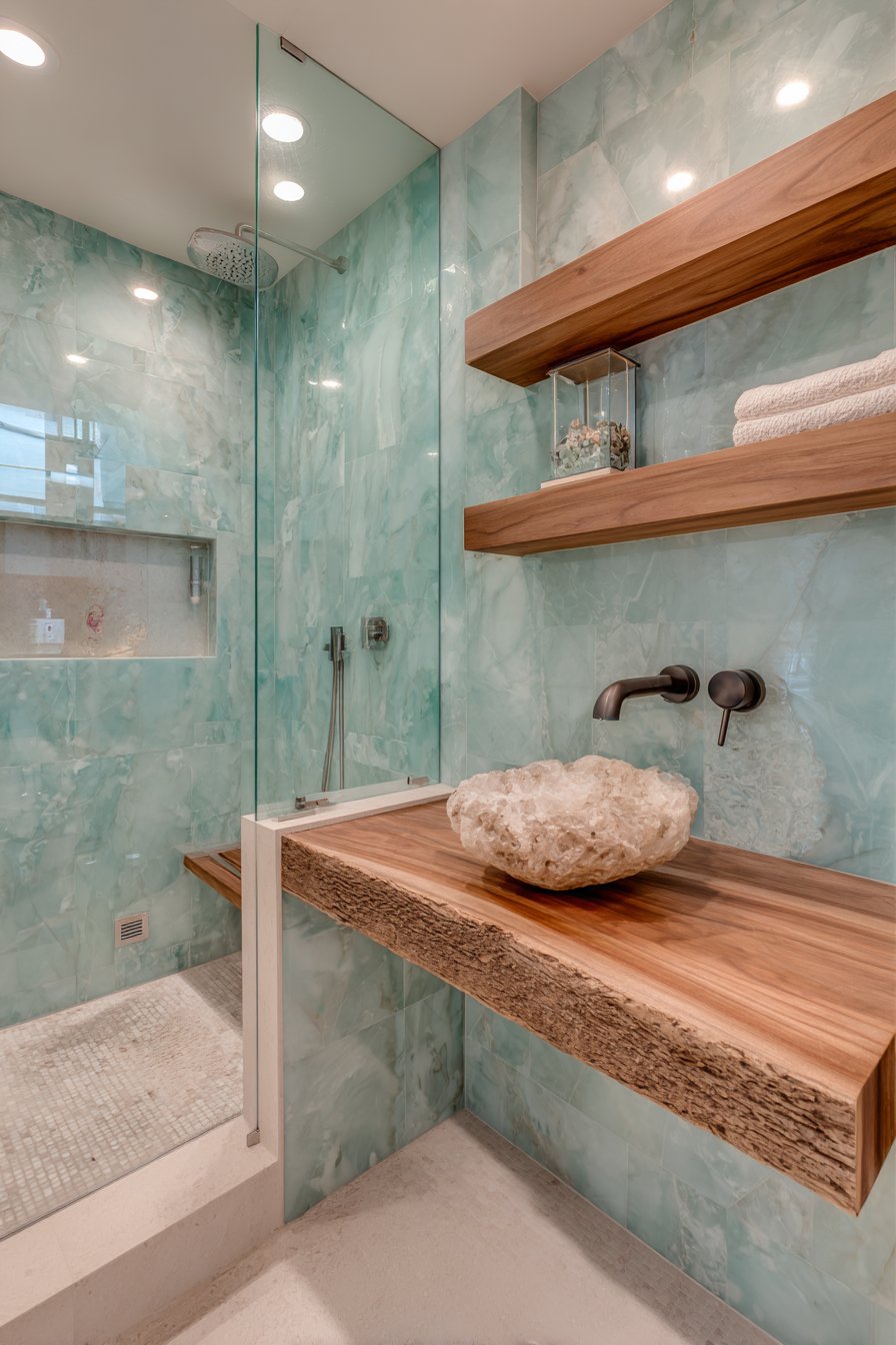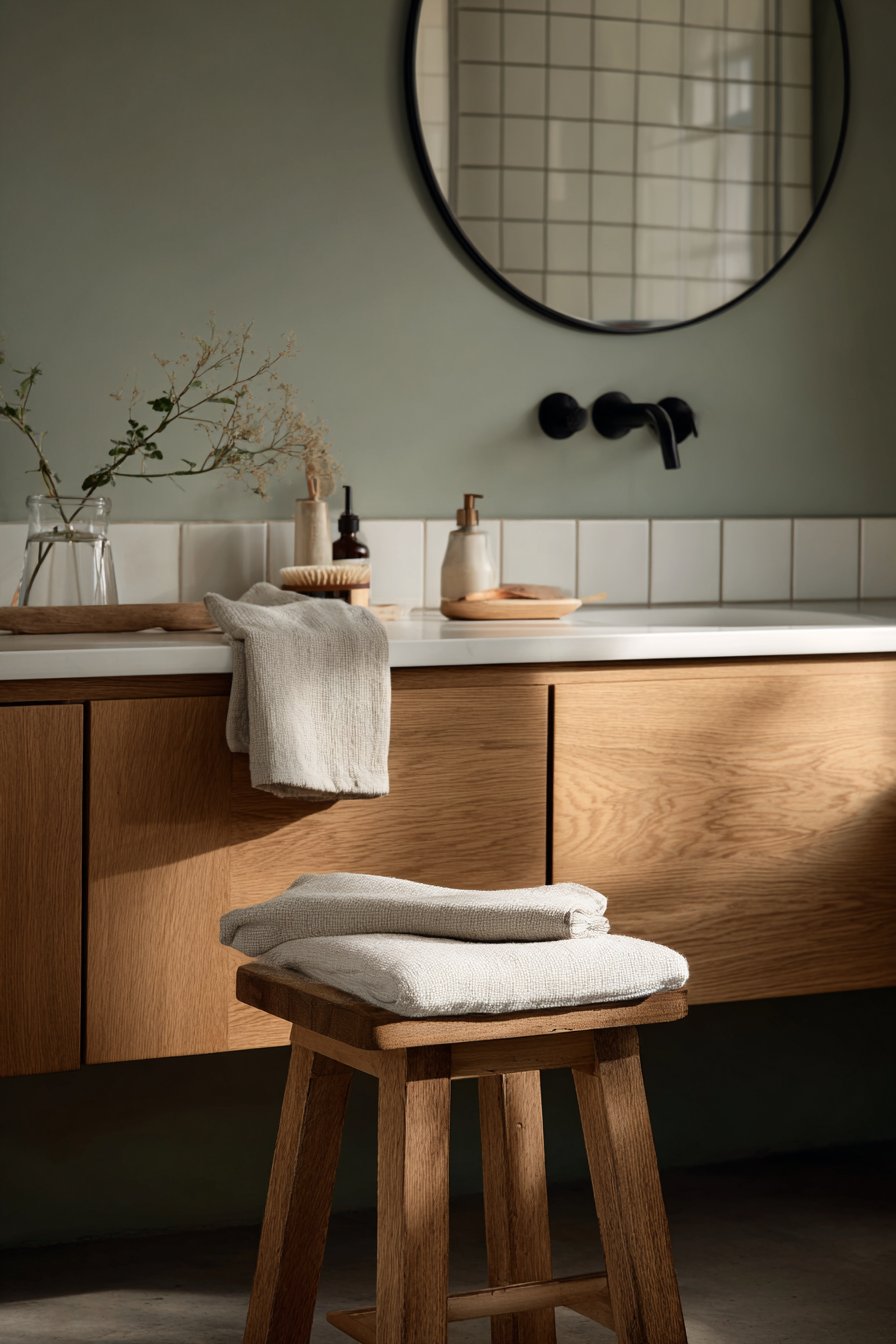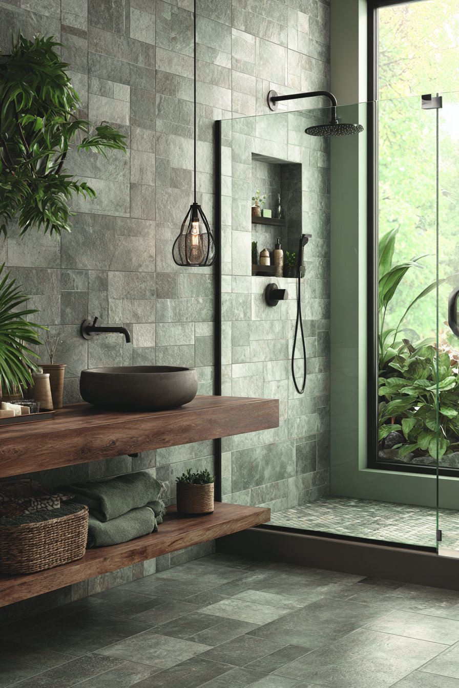 Open floating shelves in light oak extend the natural wood theme while providing essential storage that doesn’t visually clutter the space. These shelves display rolled towels in coordinating colors and small potted plants that reinforce the nature-inspired palette. The plants serve double duty, adding both decorative appeal and improving air quality in the enclosed space. Soft natural lighting filtering through a small window creates gentle shadows that enhance the textured wall surfaces, giving depth and dimension to what might otherwise feel flat.
