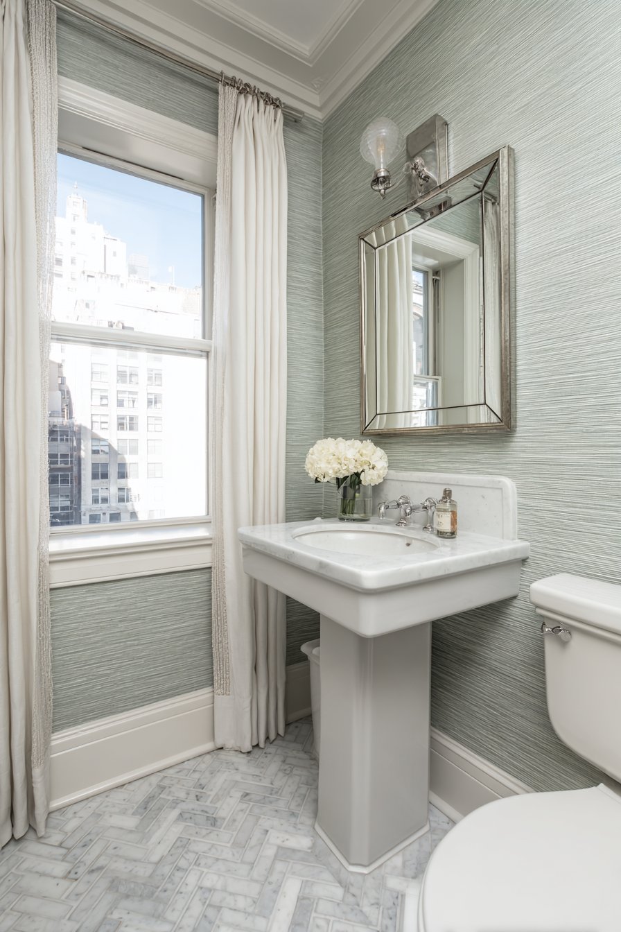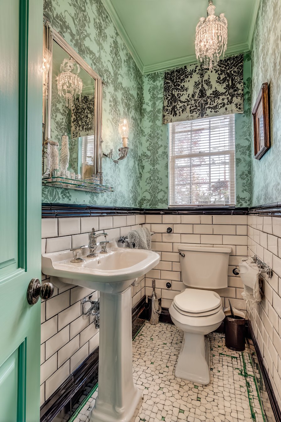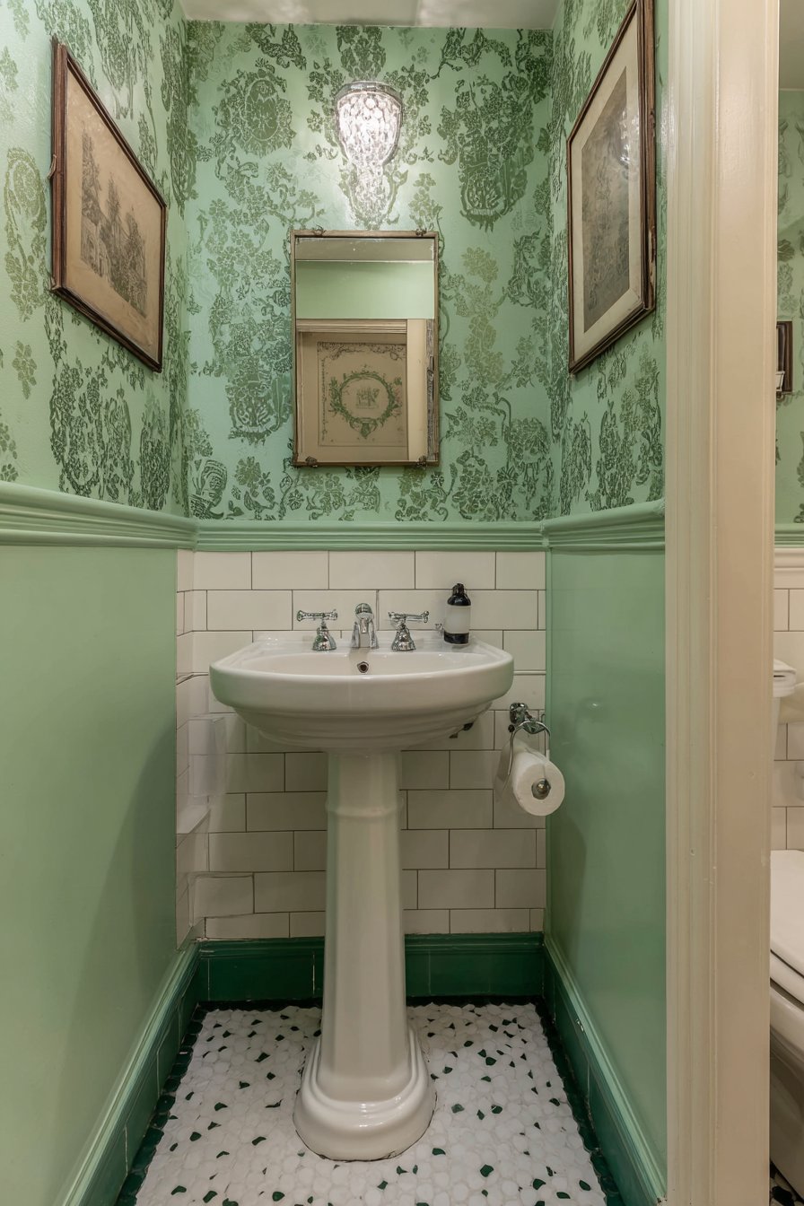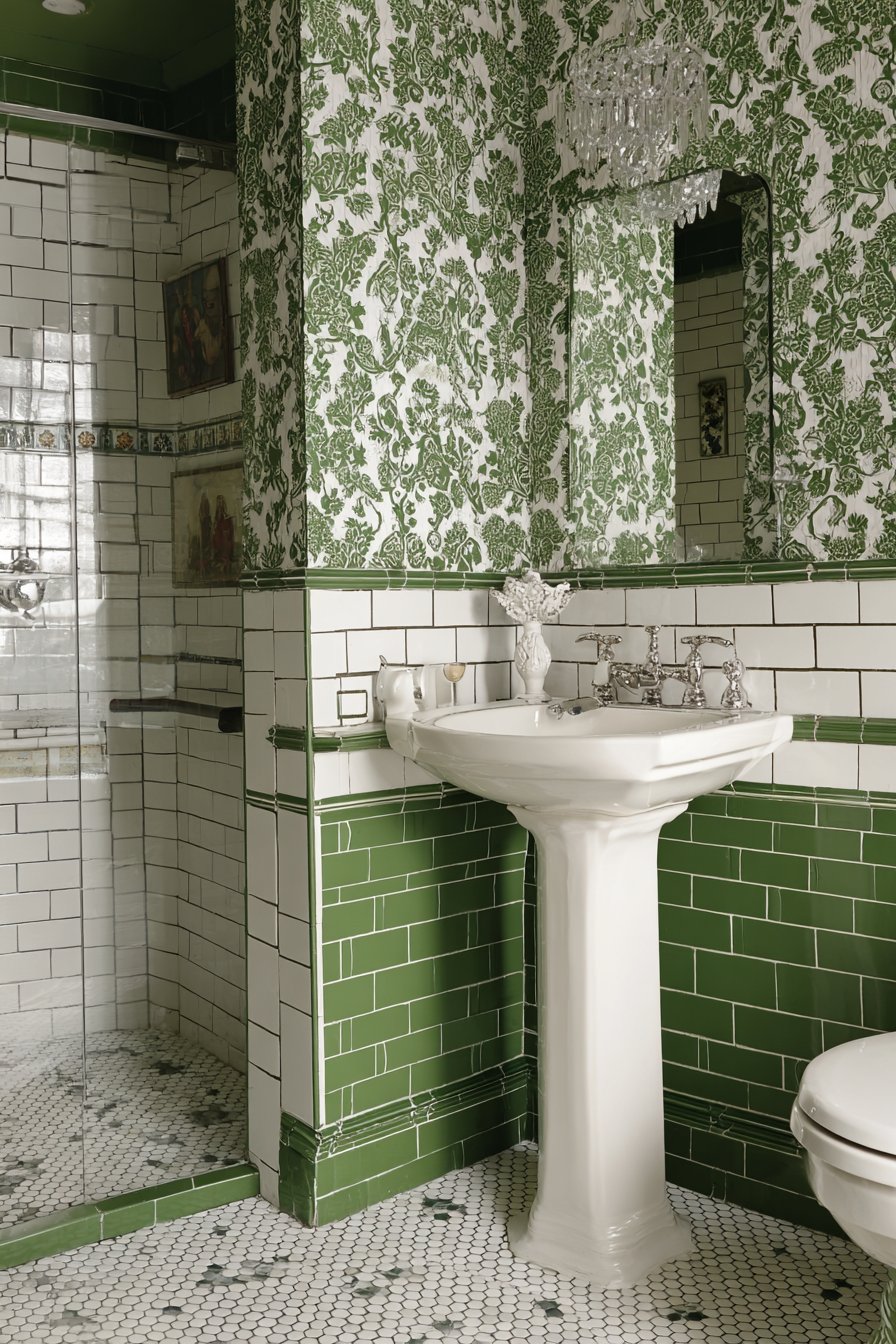 Herringbone marble floor tiles in white with pale green veining complete the sophisticated material palette, their diagonal pattern adding movement and visual interest at floor level. The herringbone layout is particularly effective in small rooms because the zigzag pattern creates dynamic visual energy that prevents the space from feeling static or boring despite its compact size. The marble’s natural veining subtly echoes the green tones in the wallpaper, creating cohesive color flow from floor to ceiling.