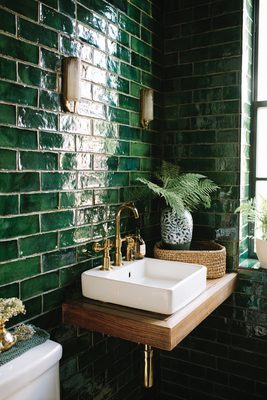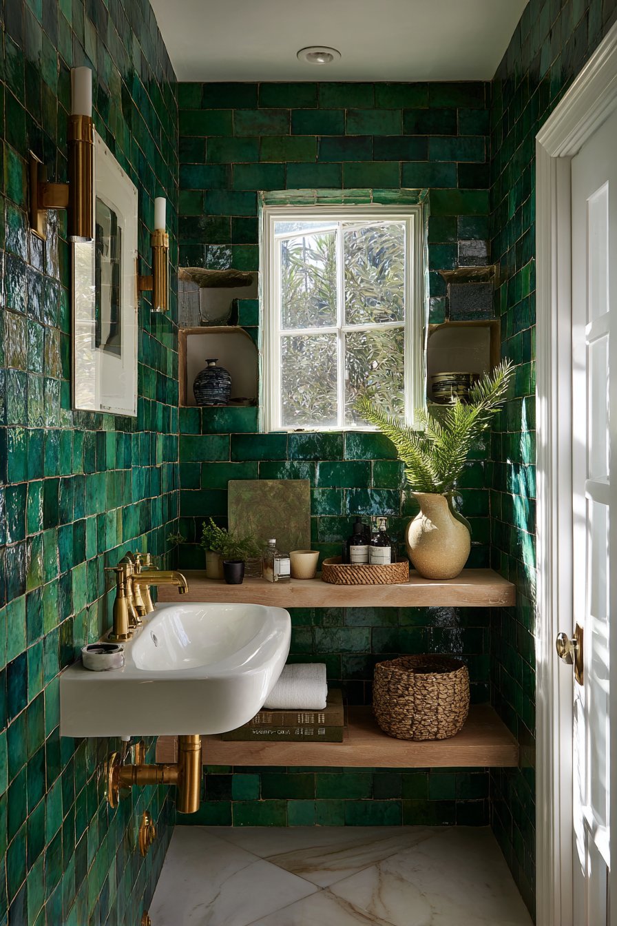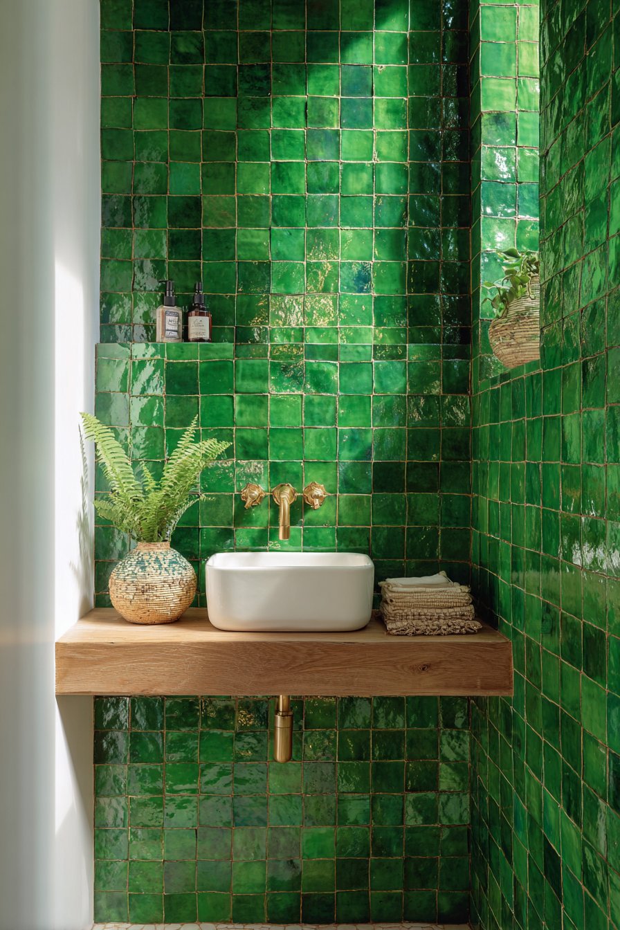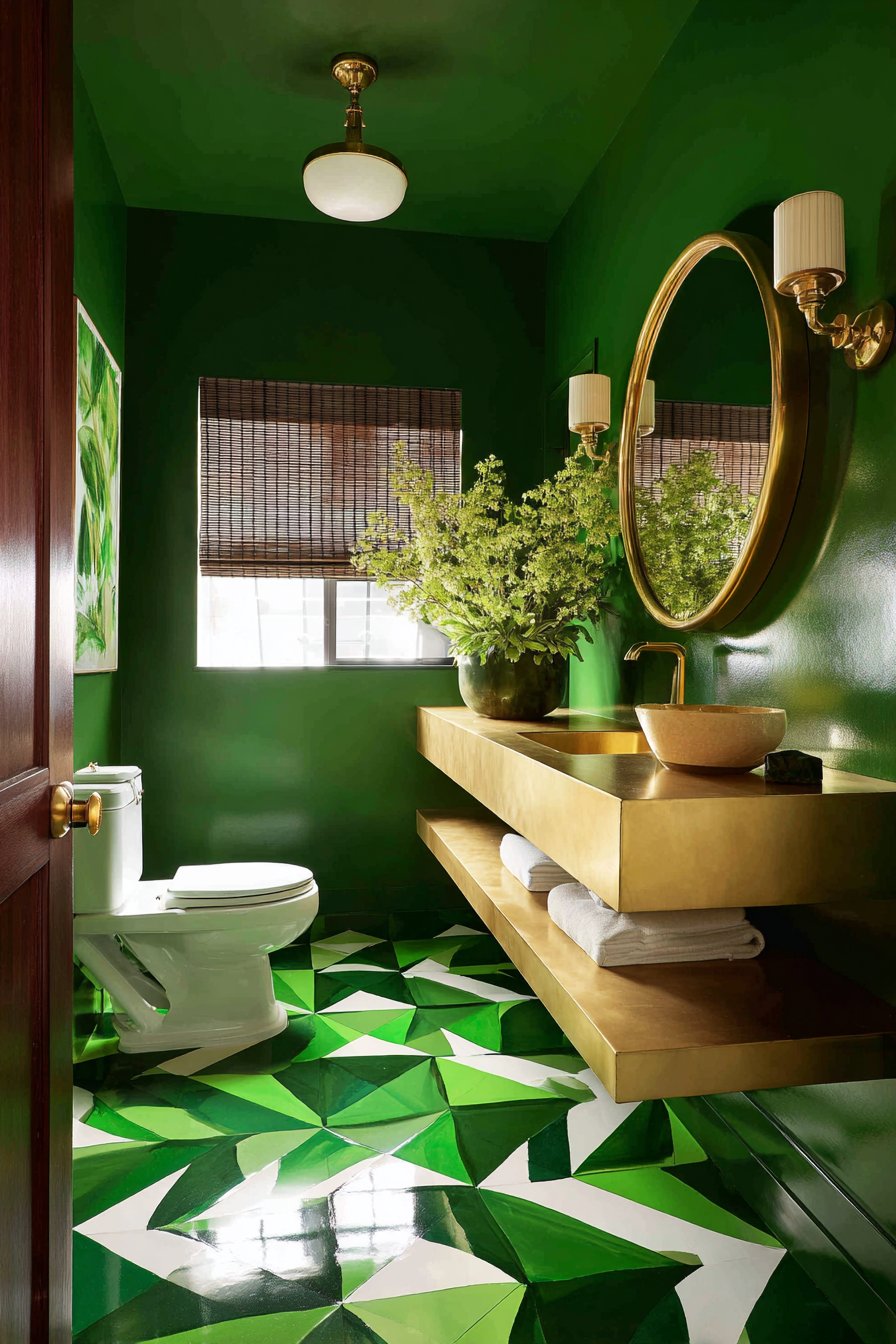 - Choose brass or bronze fixtures to add warmth against cool-toned greens