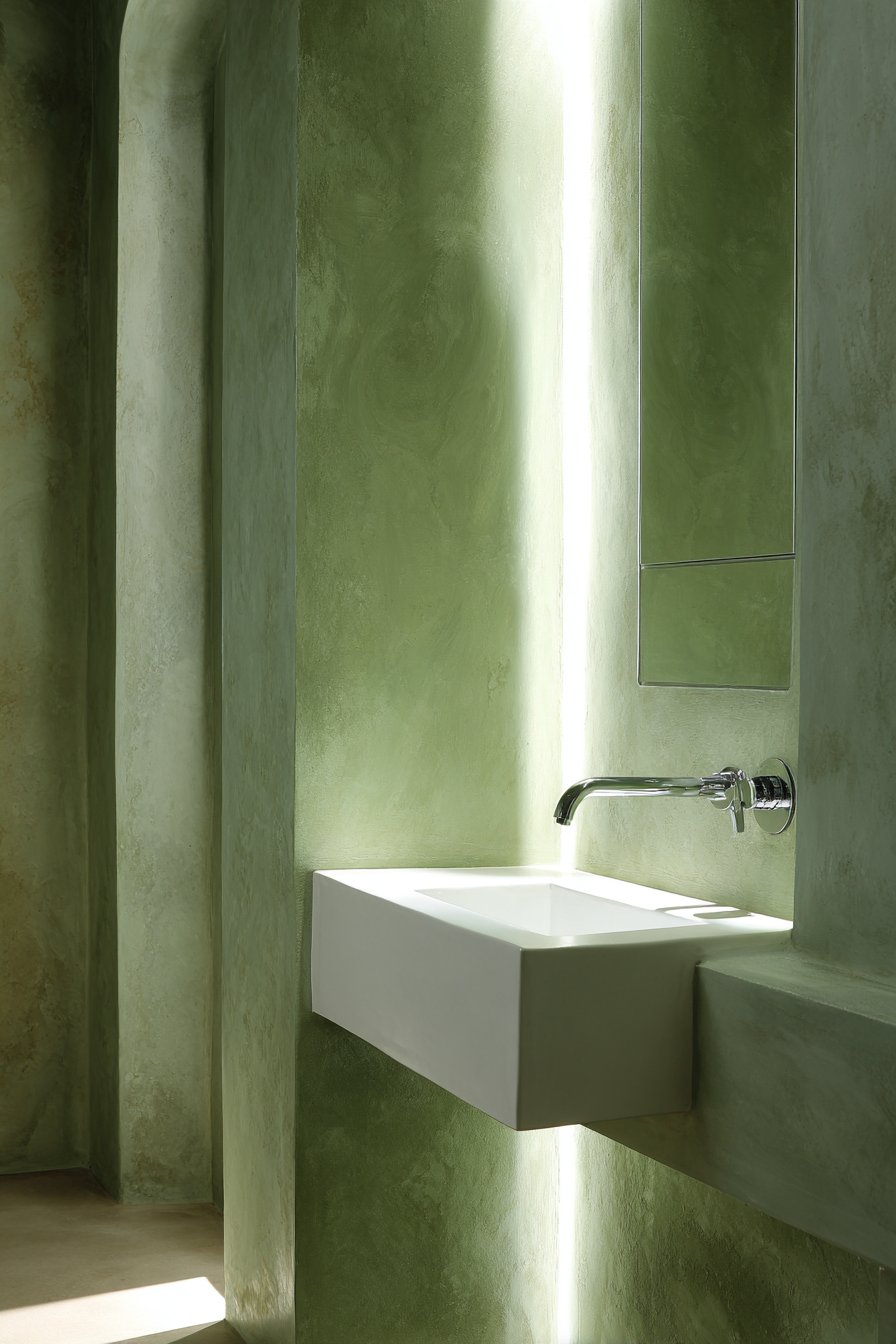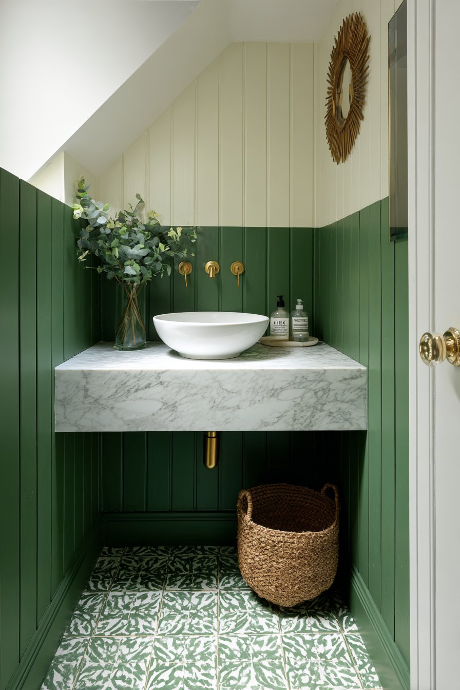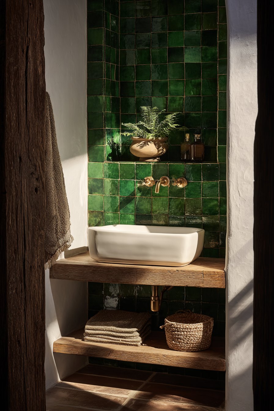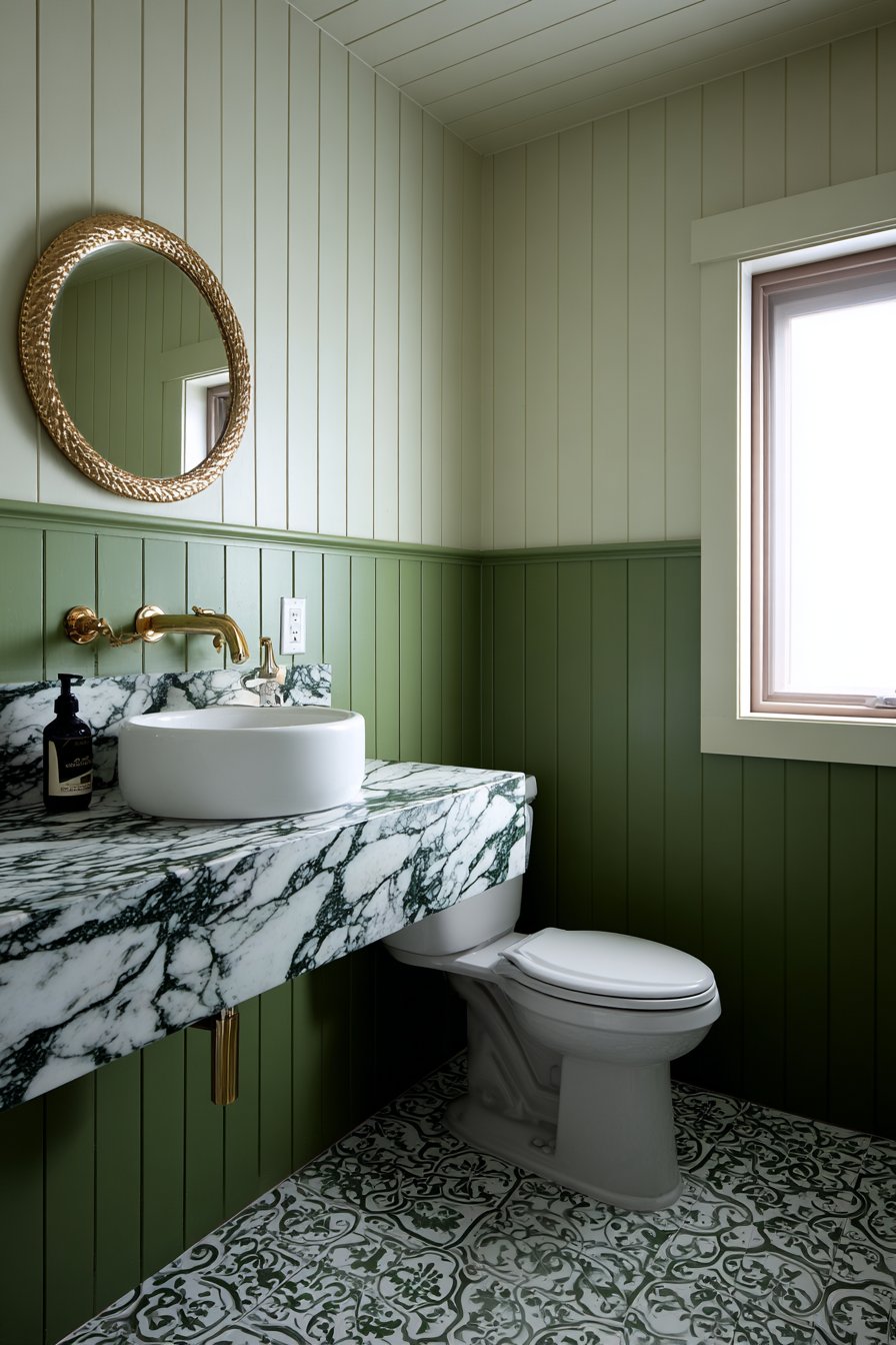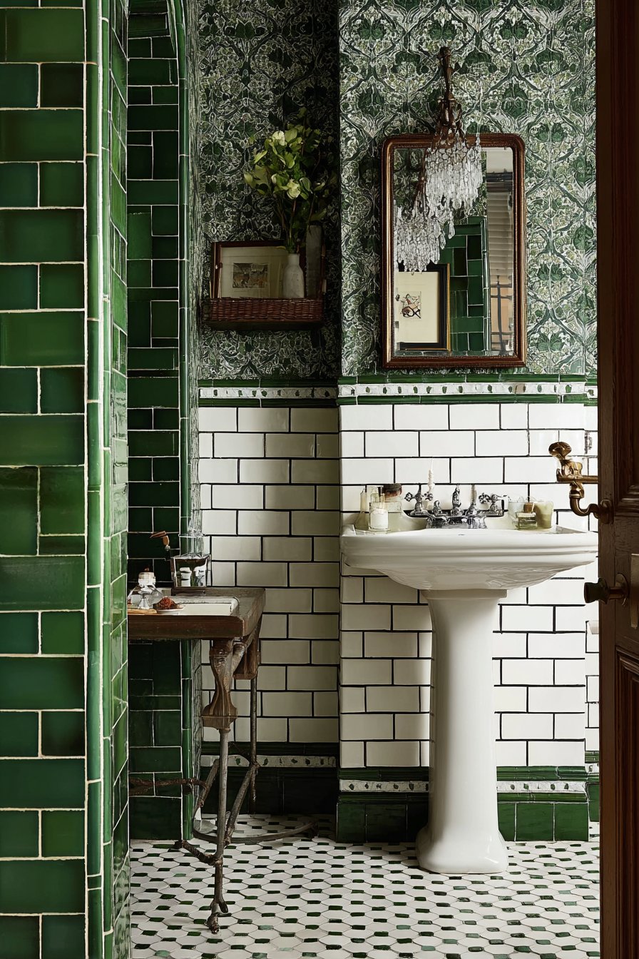 - Choose brass or bronze fixtures to add warmth against cool-toned greens
