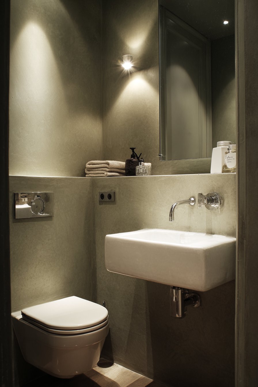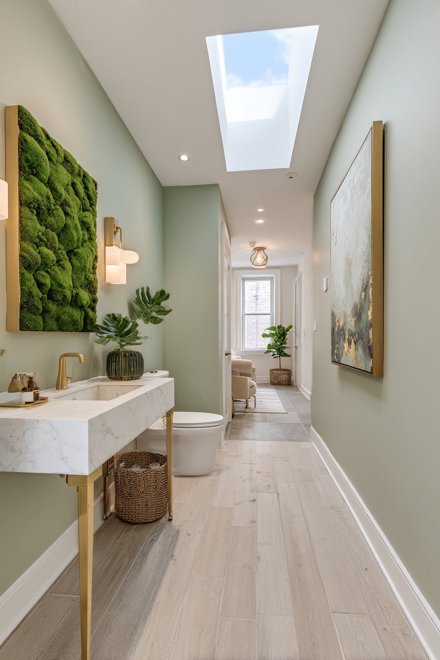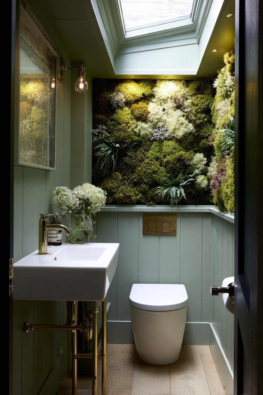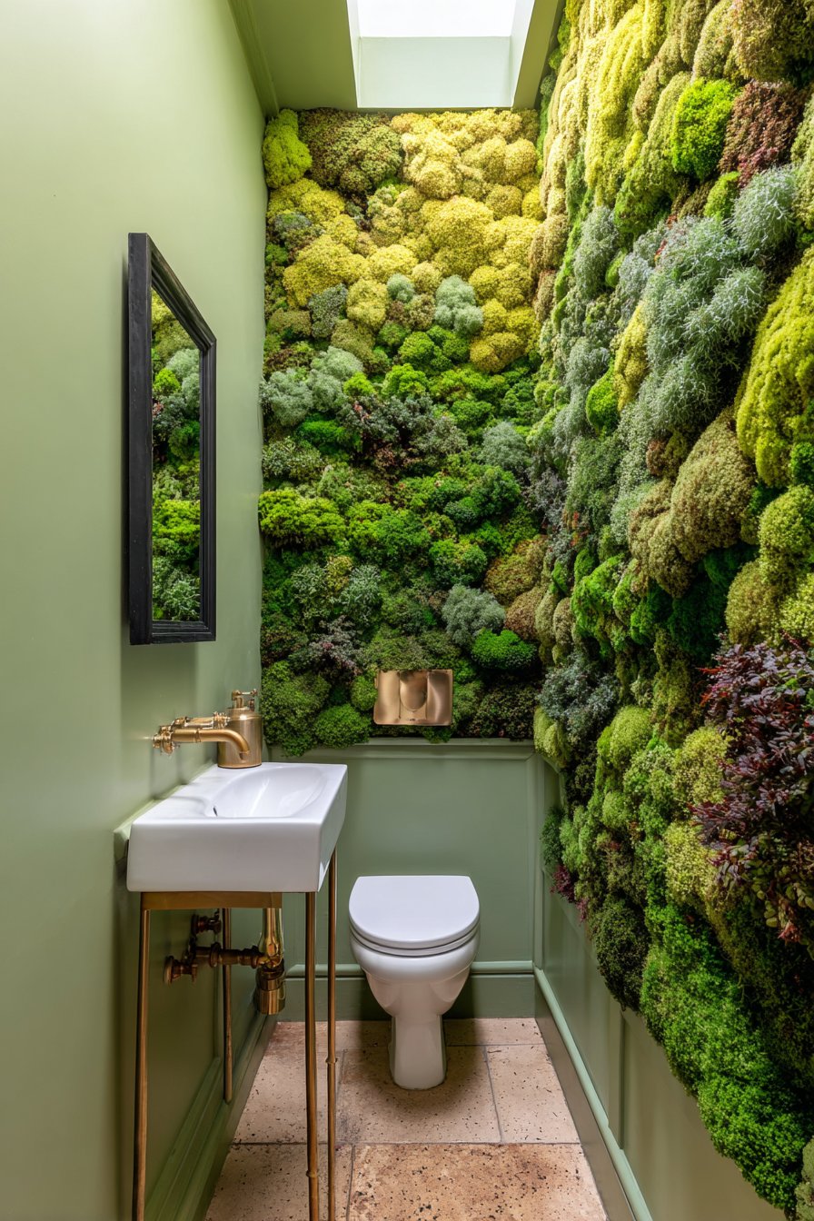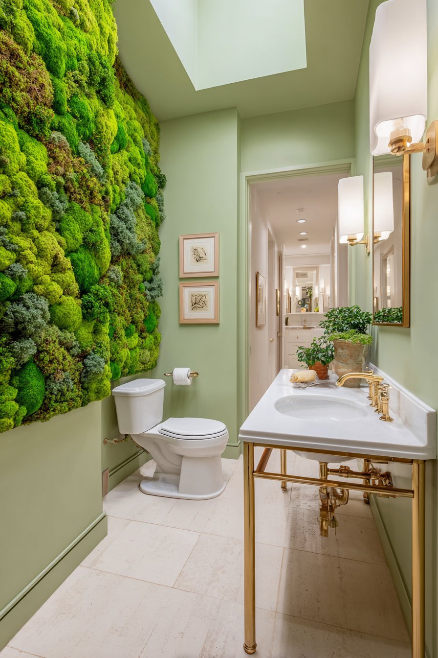 Pale sage green painted walls provide a perfect backdrop that allows the moss installation to stand out without competing visually. The soft, muted wall color recedes slightly, pushing the textured moss forward as the room’s focal point. White fixtures throughout the space create crisp contrast and maintain brightness, preventing the green tones from making the compact space feel dark or enclosed. This strategic use of white acts as a palette cleanser, giving the eye places to rest between areas of color and texture.