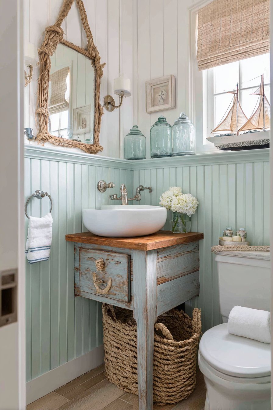 A white vessel sink sits atop a weathered wood vanity that appears sun-bleached and time-worn, as if salvaged from a beachside cottage. This deliberately aged aesthetic adds character and story to the space, making it feel collected over time rather than recently installed. Rope drawer pulls provide nautical detail that reinforces the coastal theme while adding textural interest. These small but thoughtful touches demonstrate how accessories and hardware can significantly contribute to establishing and maintaining a cohesive design theme.