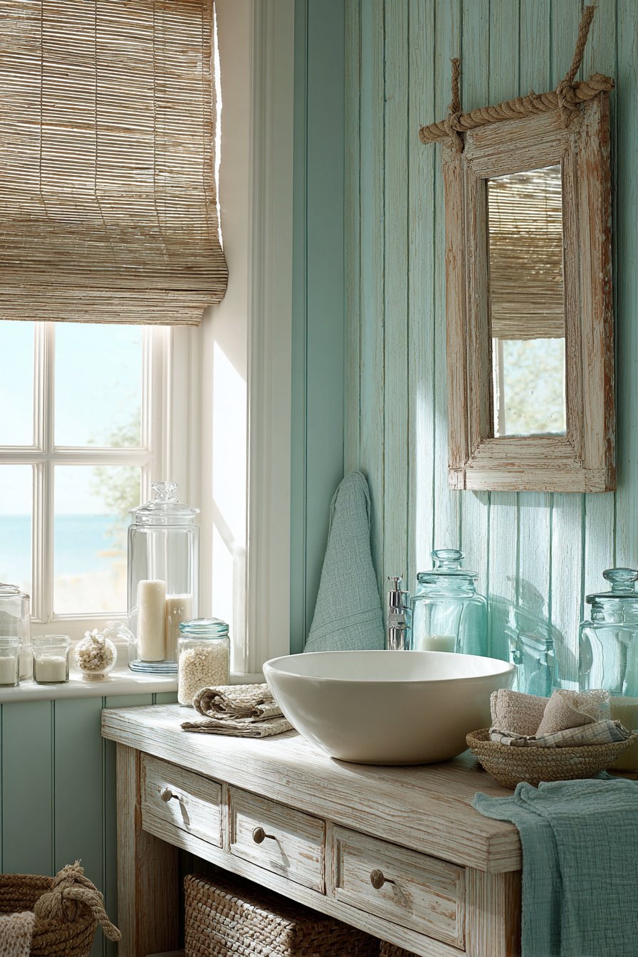 Light bamboo Roman shades filter natural light softly, creating dappled illumination that evokes the way sunlight filters through beach grass and palm fronds. The natural bamboo material brings organic texture while its warm honey tones complement the weathered wood vanity. Nautical-themed accessories—perhaps a rope-framed mirror, glass jar storage filled with shells or sand, or vintage boat cleats used as towel hooks—complete the coastal narrative without feeling kitschy or overly themed.