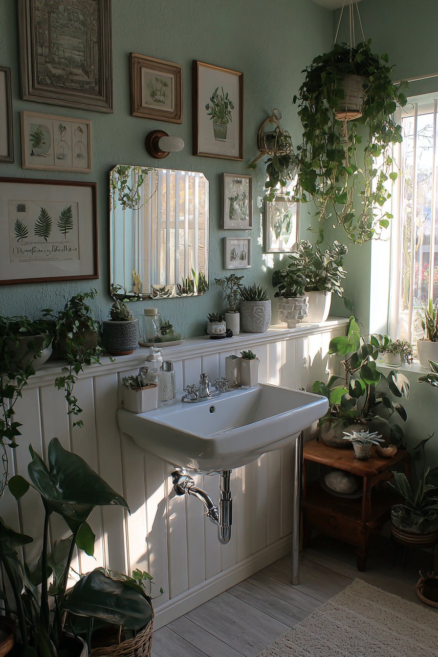 Real potted plants including a hanging pothos and countertop succulents bring the botanical theme to life with actual living specimens. The pothos, with its trailing vines and heart-shaped leaves, adds vertical interest and softness while thriving in bathroom humidity. Succulents require minimal care while providing sculptural form and additional green tones. Natural light from a nearby window illuminates both the framed botanical art and the living plants, creating a cohesive nature-inspired environment that promotes calm and well-being.
