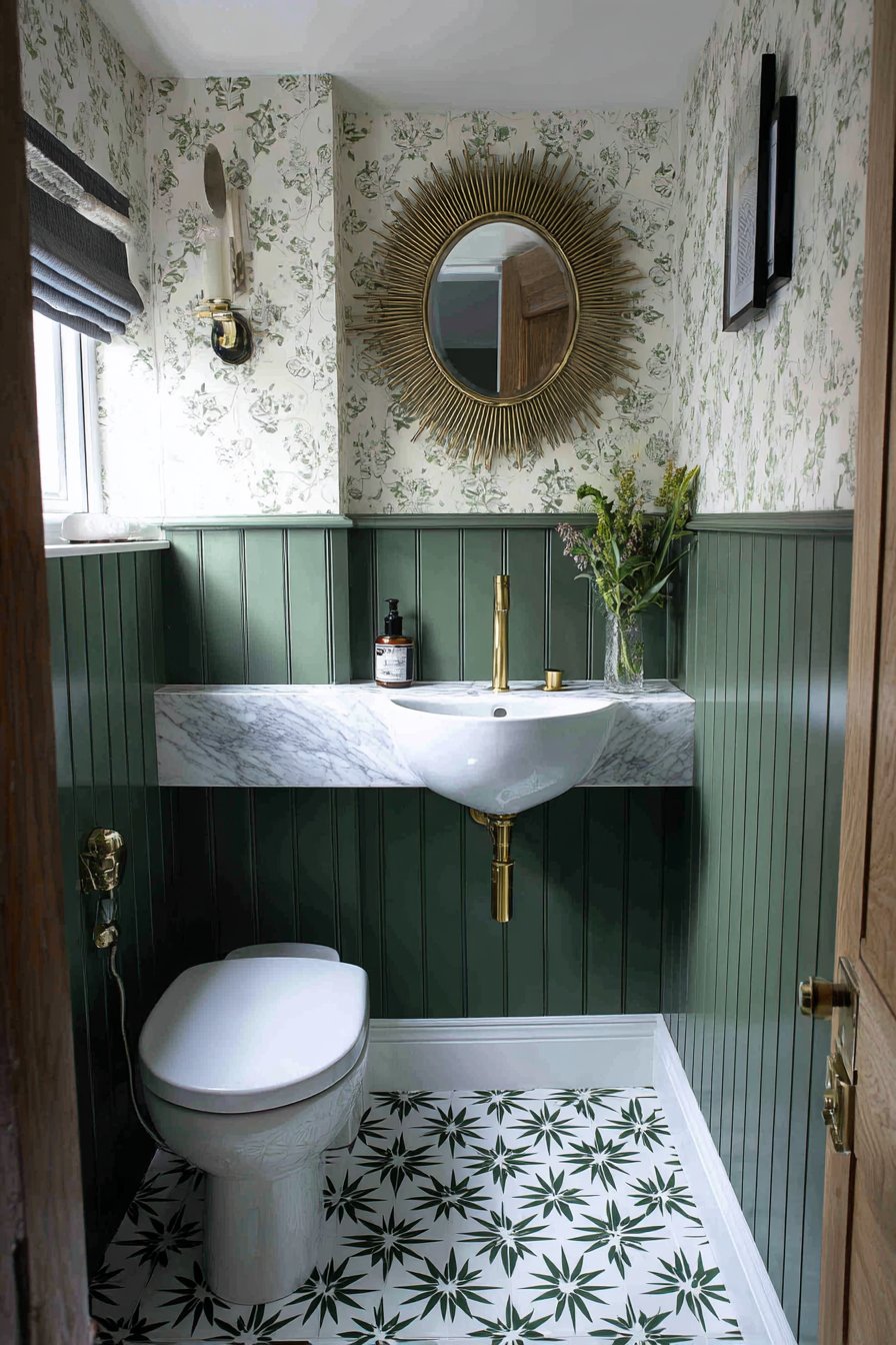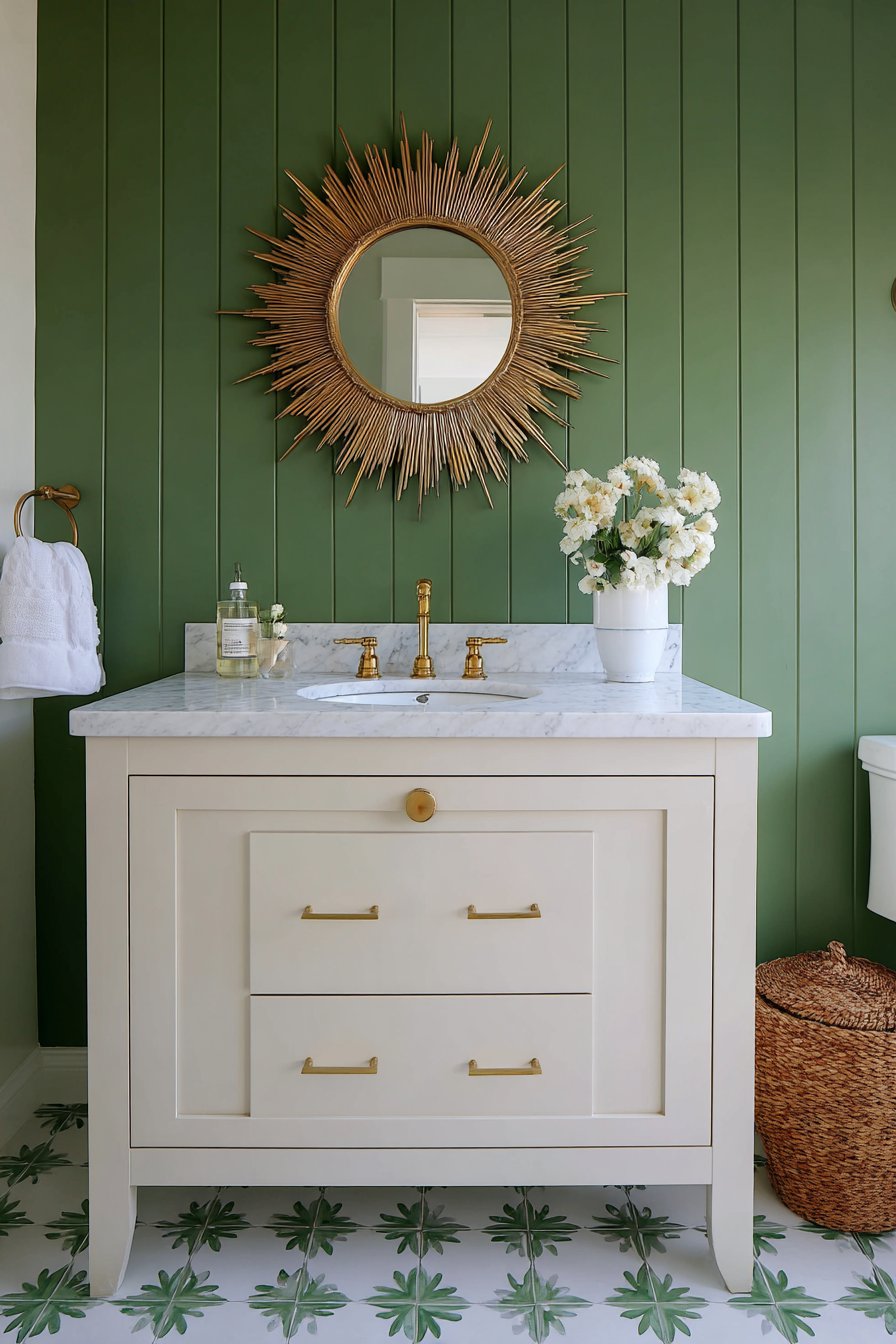 Gold fixtures and a dramatic sunburst mirror add vintage glamour that elevates the two-tone walls from simple to sophisticated. The sunburst mirror, with its radiating rays, creates a focal point that draws attention and adds dimensional sculptural interest to the wall. White and green patterned floor tiles in an encaustic style complete the vintage-inspired look while introducing pattern at ground level. The patterned tiles add visual complexity that prevents the floor from disappearing and contributes to the overall richness of the design.