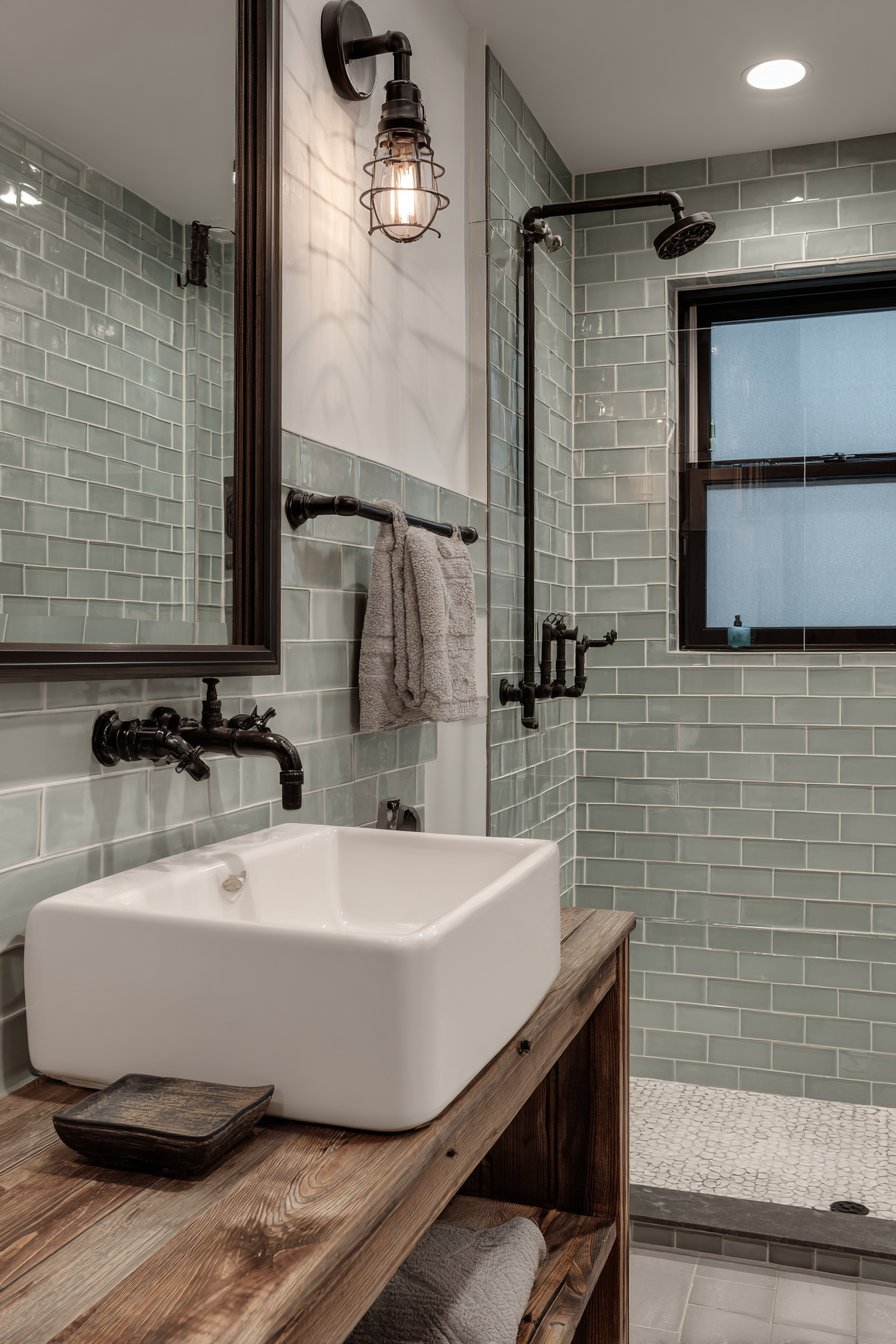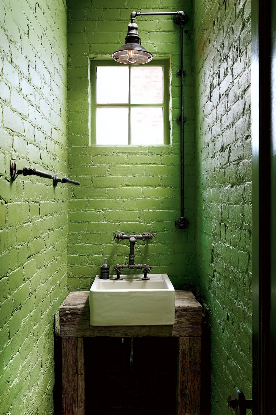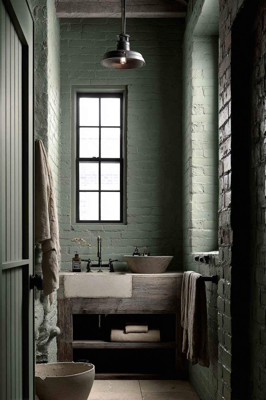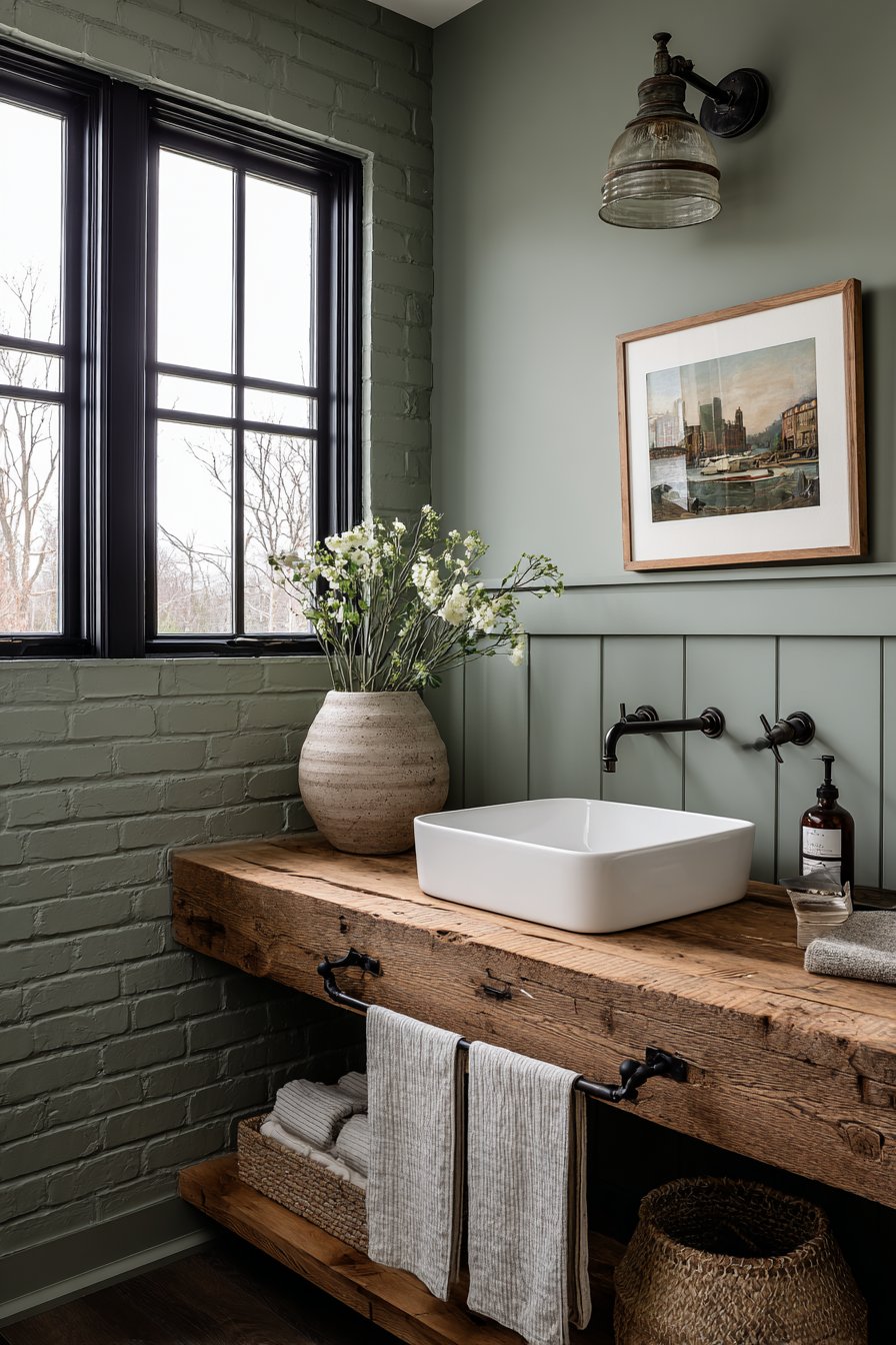 Painted brick walls in soft sage green create instant texture and character in this modern farmhouse bathroom that combines rustic elements with contemporary clean lines. The brick, visible beneath the paint, provides dimensional texture that adds visual interest and depth impossible to achieve with flat drywall. Painting rather than leaving brick exposed allows you to enjoy the textural benefits while controlling the color to fit your desired palette. The sage green paint color brings calming, nature-inspired tones while softening the brick’s inherent industrial edge.