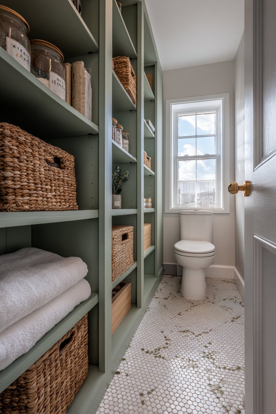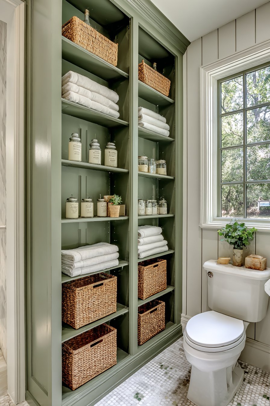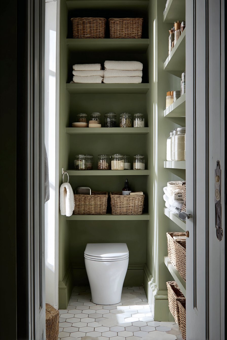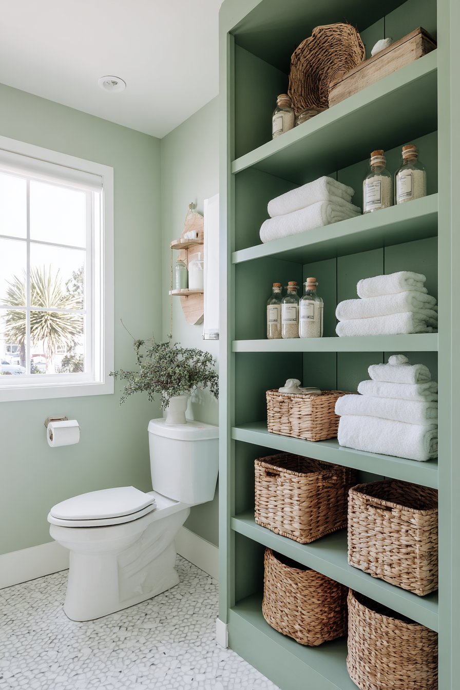 The shelving holds neatly organized white towels, woven baskets, and small glass jars with bathroom essentials, creating a display that’s both functional and visually appealing. The contrast between the muted green shelving and crisp white towels creates a spa-like freshness that feels professionally curated. Woven baskets introduce natural texture and provide concealed storage for items that don’t need to be displayed, maintaining the clean, organized appearance that’s essential in small spaces.