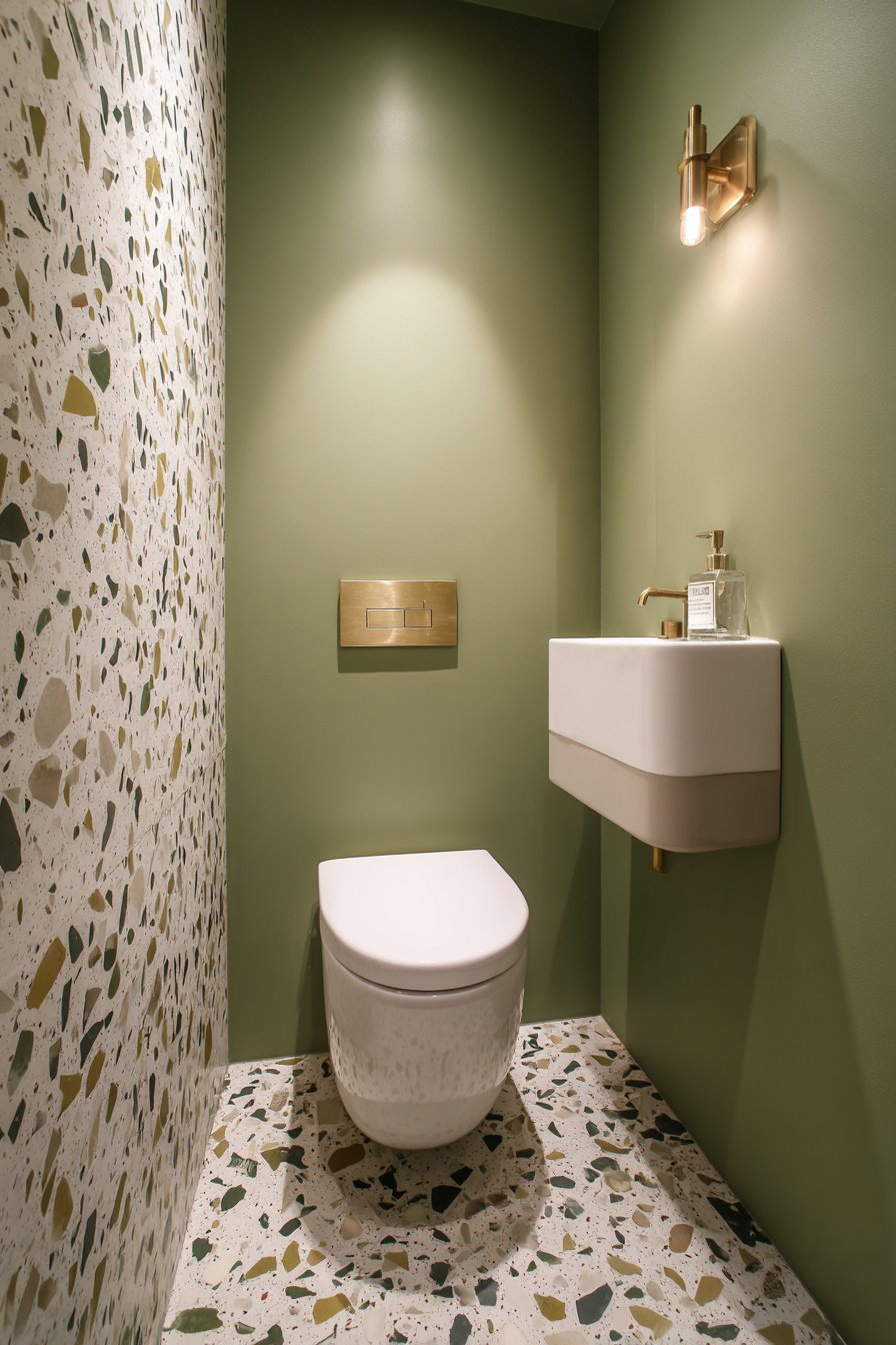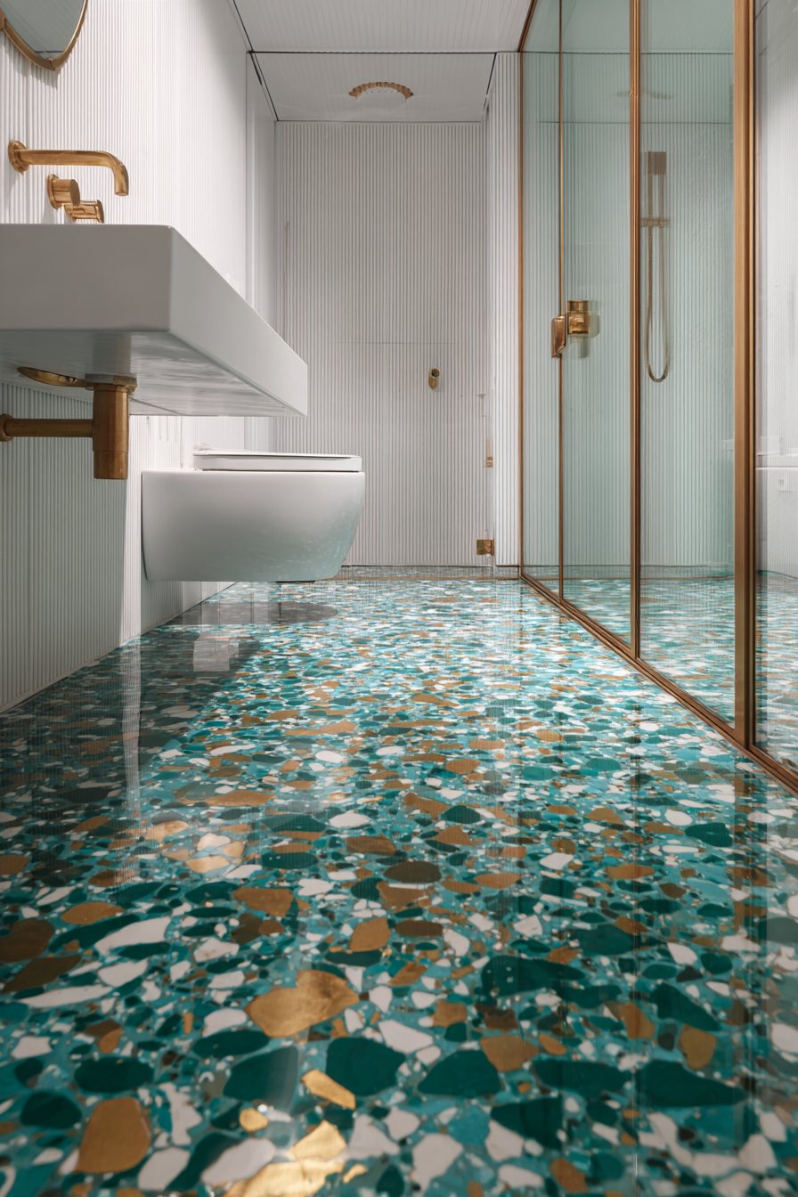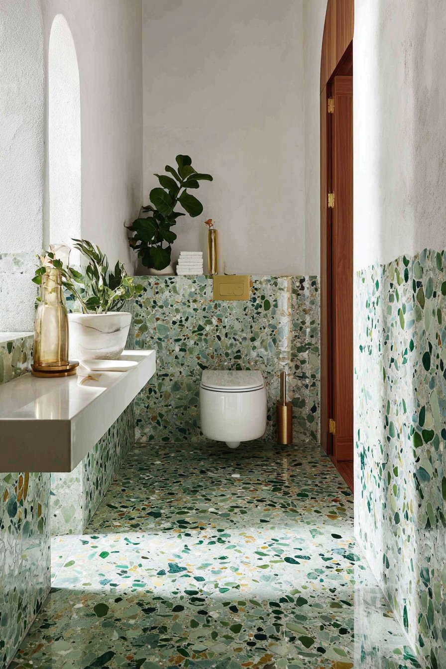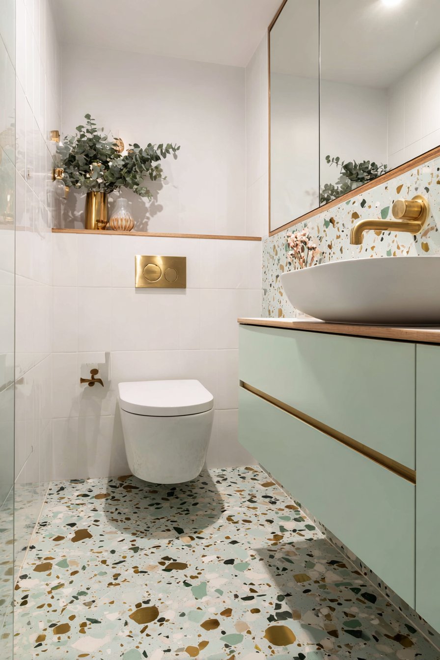 A striking terrazzo floor with green, white, and gold chips creates a custom speckled pattern that serves as the bathroom’s primary design feature. Terrazzo, an ancient flooring technique experiencing renewed popularity, allows for complete customization through chip color selection, creating truly unique floors. The green chips reinforce the color theme while white and gold chips add brightness and luxury, respectively. This three-color combination creates visual interest and complexity that rewards closer inspection, revealing new details each time you look.