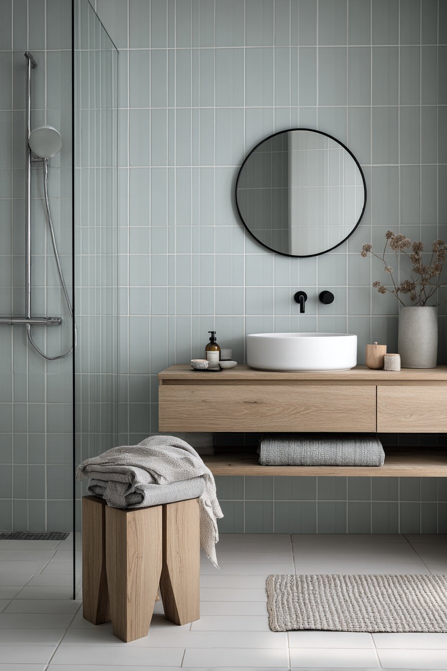 White subway tiles in the shower area reflect light and maintain brightness, essential considerations in Scandinavian countries where natural daylight can be limited. A small wooden stool—perhaps in birch or beech—holds a folded linen towel, introducing additional natural texture while serving a practical purpose. Soft natural Nordic lighting creates an airy, calm atmosphere that promotes the sense of hygge—the Danish concept of cozy contentment—that Scandinavian design seeks to cultivate. Every element in this bathroom has been carefully considered and reduced to its essential form, eliminating unnecessary decoration while maintaining beauty through honest materials and perfect proportions.