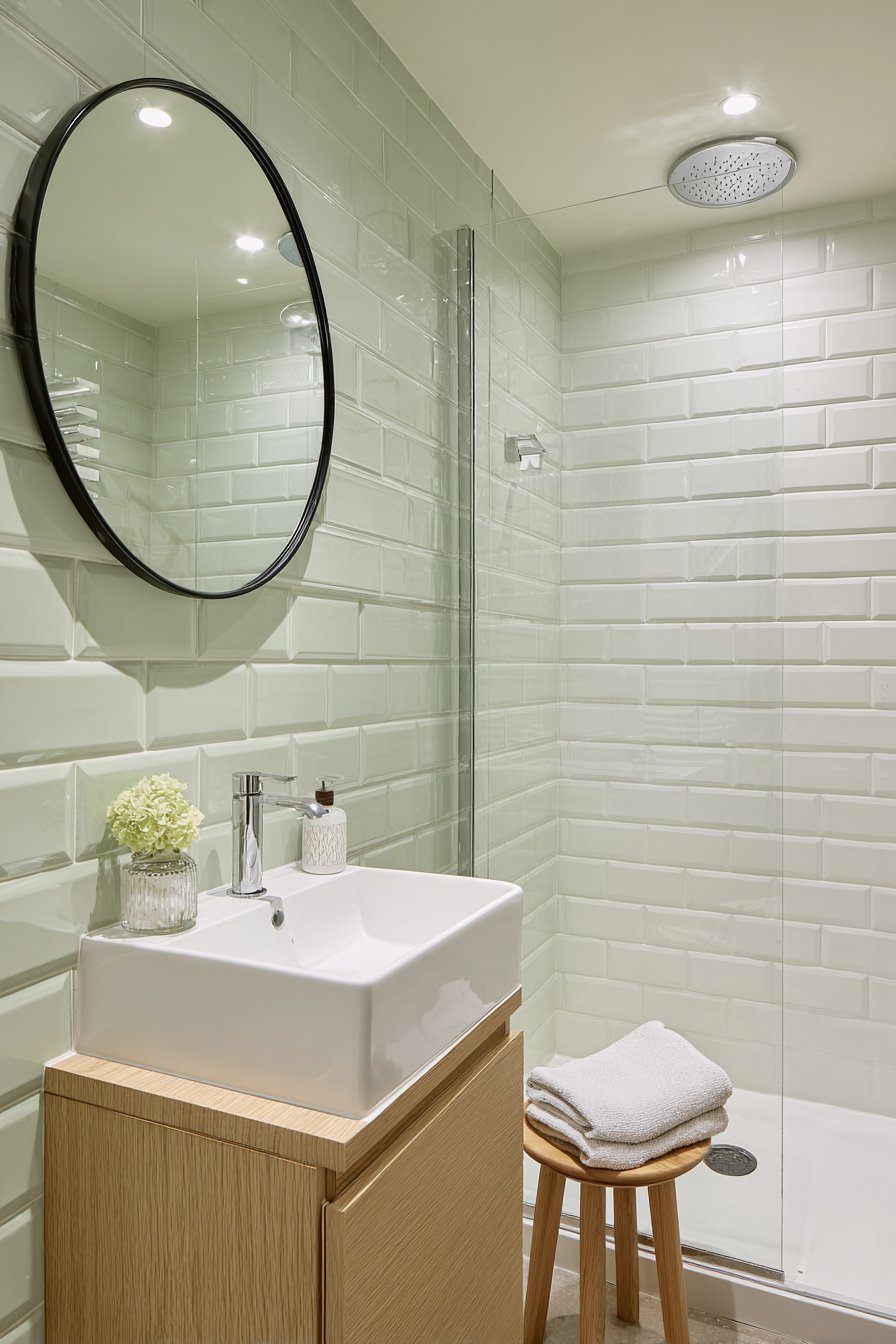 White grout lines between the tiles create subtle definition and prevent the olive green from becoming a solid, potentially overwhelming mass of color. This grout choice also keeps the overall feel lighter and more contemporary than darker grout would achieve. A seamless glass partition encloses the shower without creating visual barriers, maintaining sight lines across the entire bathroom and preventing the space from feeling chopped up or cramped.