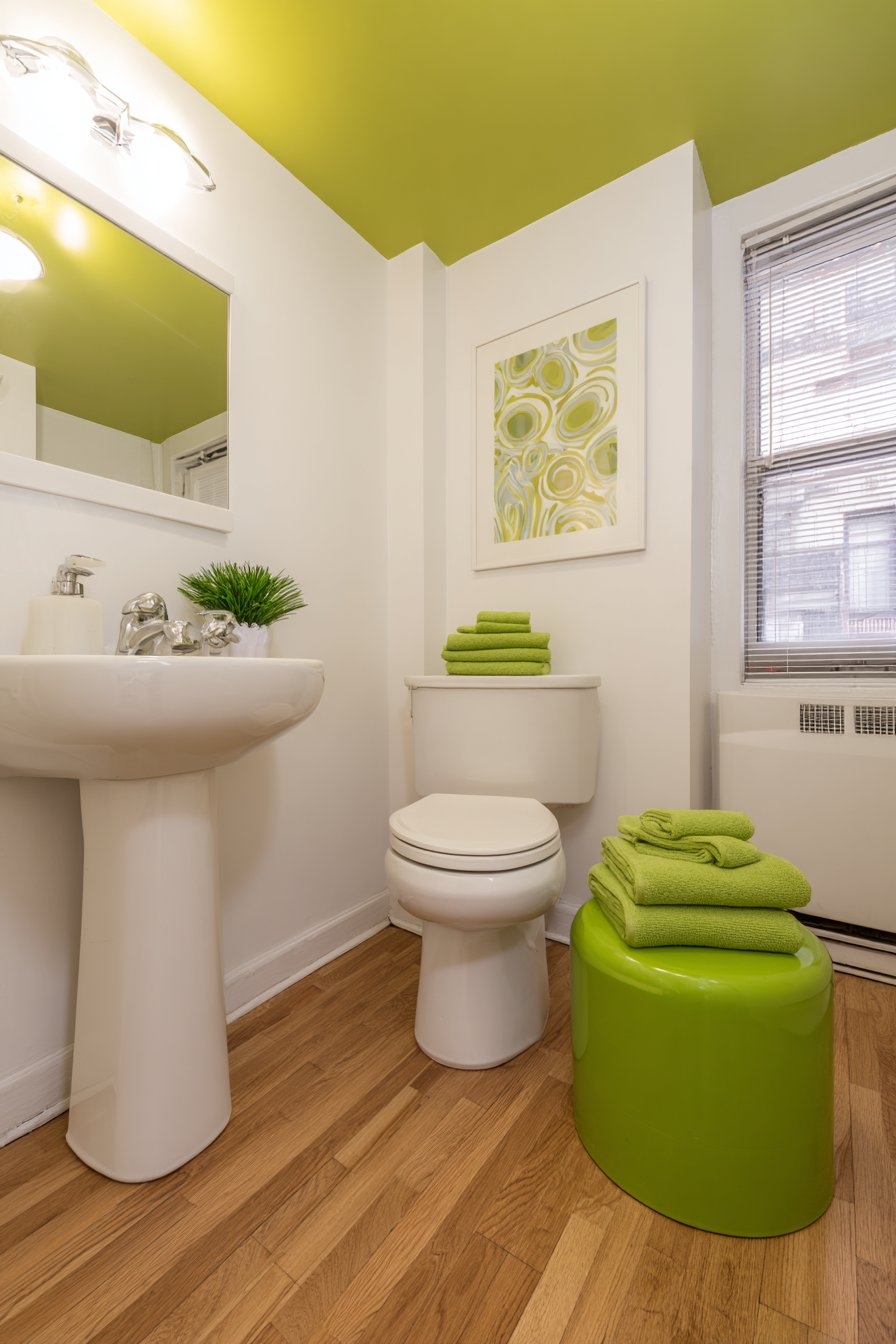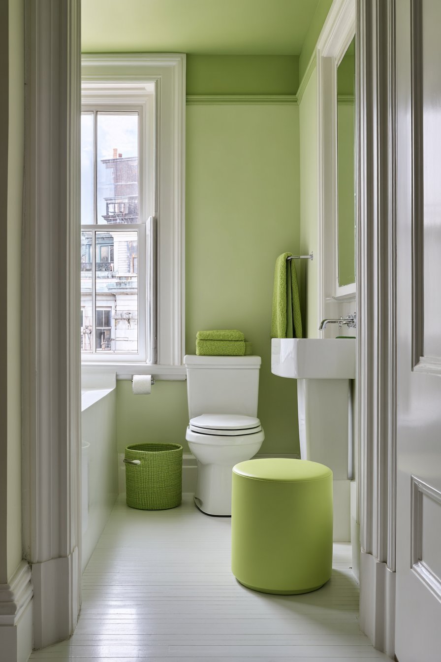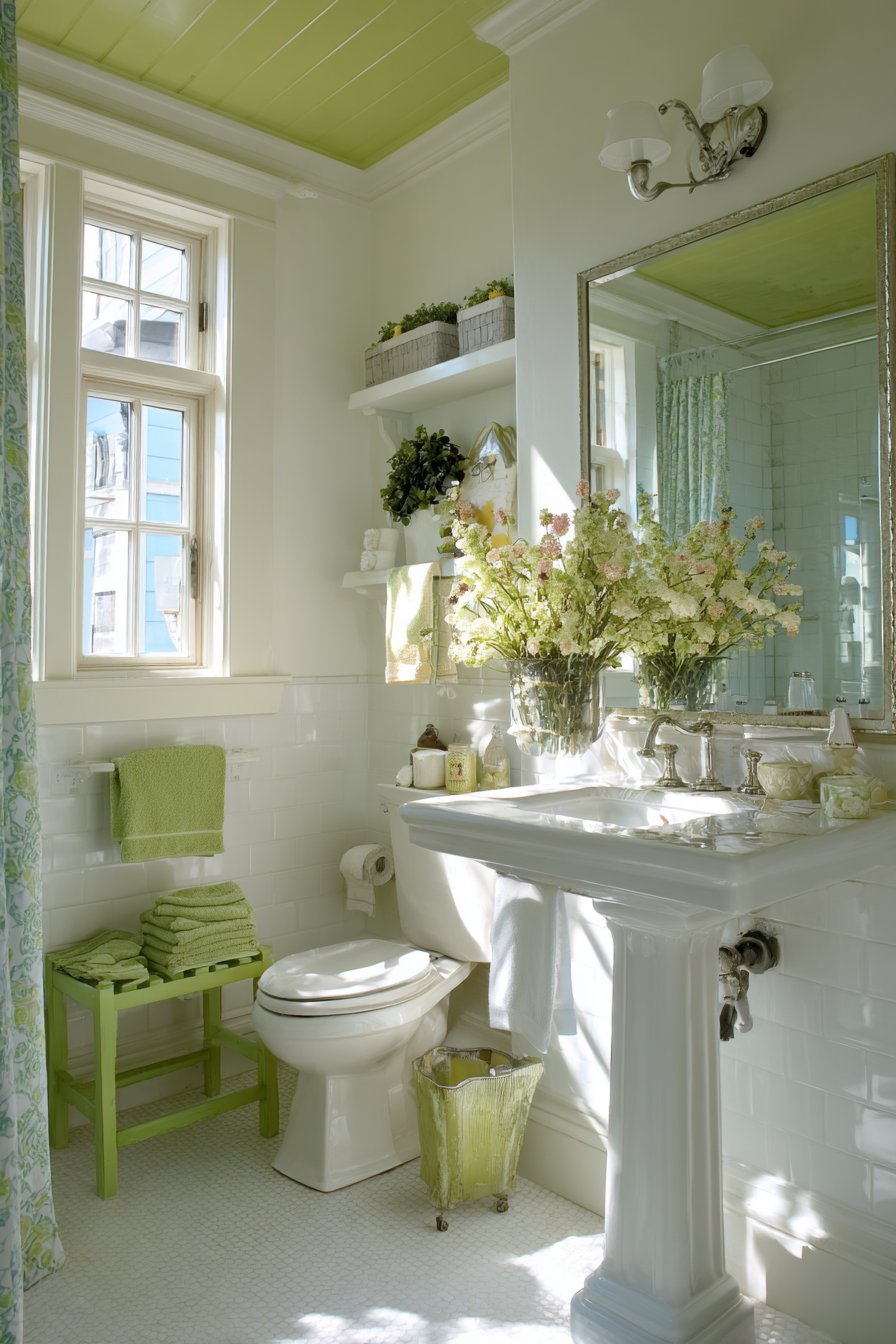 A small green step stool and coordinating hand towels echo the ceiling color at ground level, creating vertical color connection without requiring extensive commitment to green throughout the space. These easily-changeable accessories allow you to strengthen or soften the green theme as your preferences evolve. Natural light bounces off white surfaces while the green ceiling adds distinctive personality, creating a bathroom that feels fresh, clever, and personalized without major renovation investment.