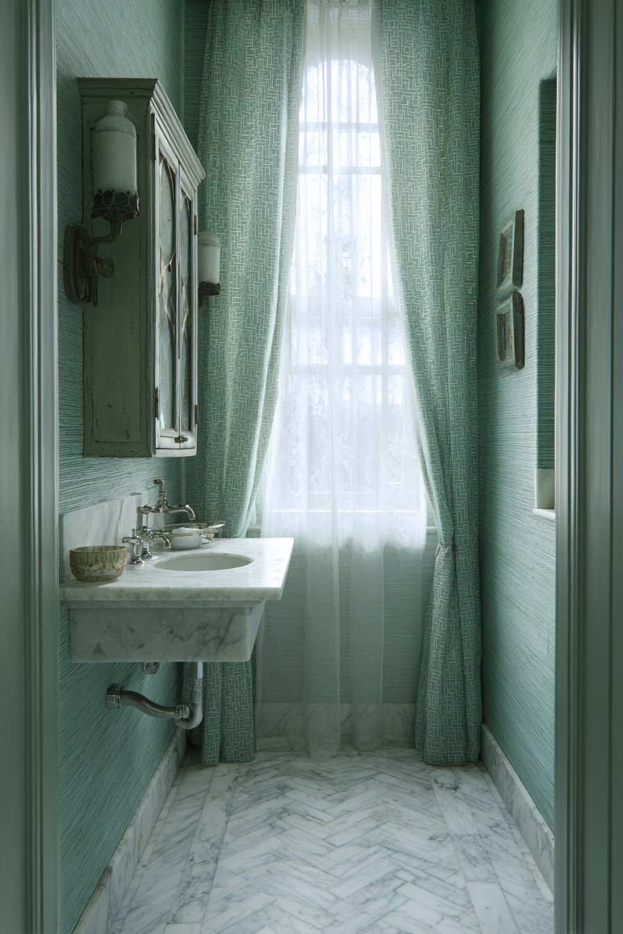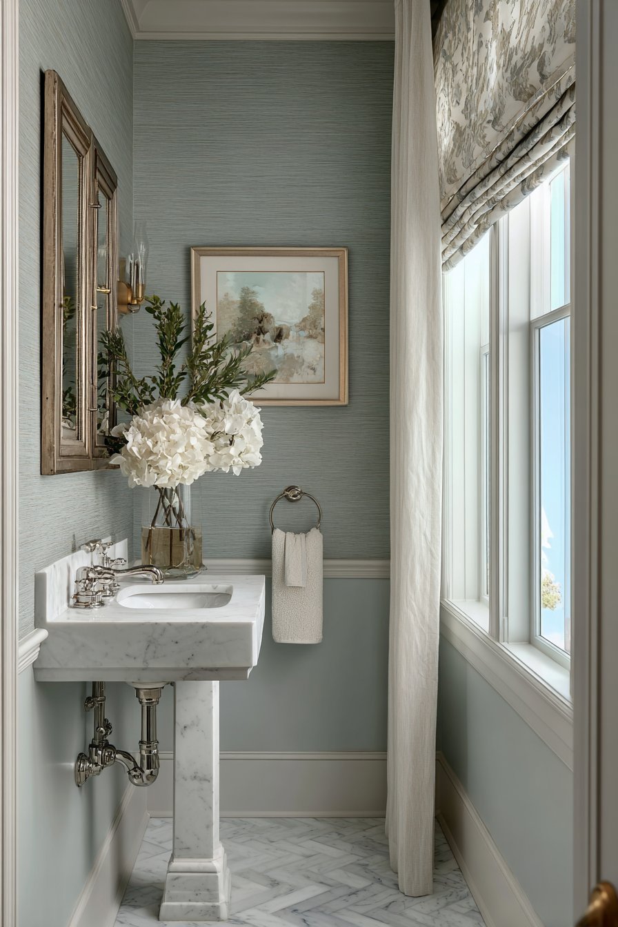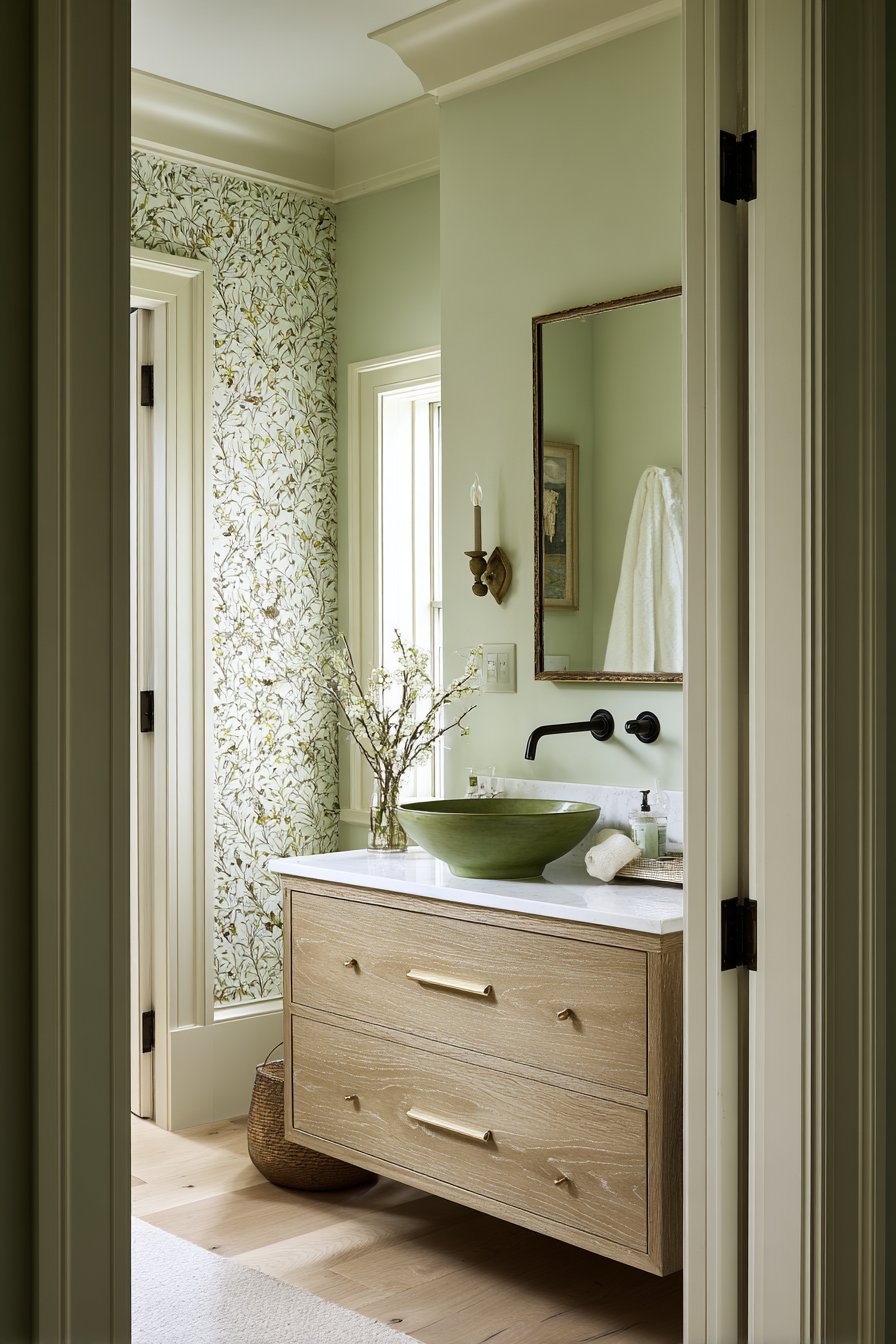 Natural grasscloth wallpaper in a subtle green-gray tone creates sophisticated textural interest across all walls in this refined powder room design. Grasscloth, woven from natural grasses and fibers, brings organic texture and subtle variation that adds depth impossible to achieve with flat paint. The green-gray color represents a perfect neutral—green enough to establish the intended palette while gray enough to remain versatile and sophisticated. This balanced tone works particularly well in small spaces because it reads as neither overwhelmingly colorful nor boringly neutral.