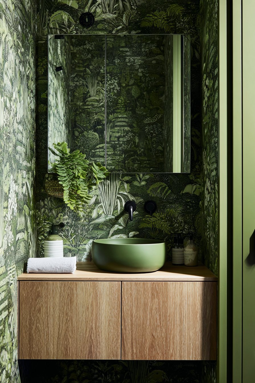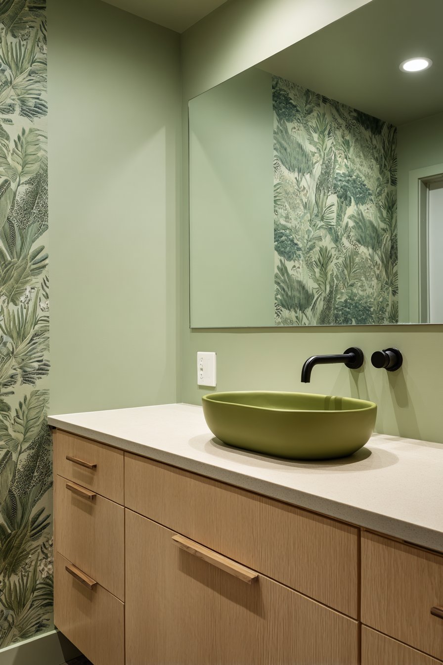 Matte black fixtures provide additional contrast and contemporary edge, their dark finish creating striking visual punctuation marks against the varied green tones throughout the space. This three-way color relationship—forest green, mint green, and matte black—demonstrates sophisticated color theory in action, with each hue supporting and enhancing the others. Behind the vanity, a frameless rectangular mirror reflects botanical print wallpaper that adds pattern and depth without overwhelming the small space.