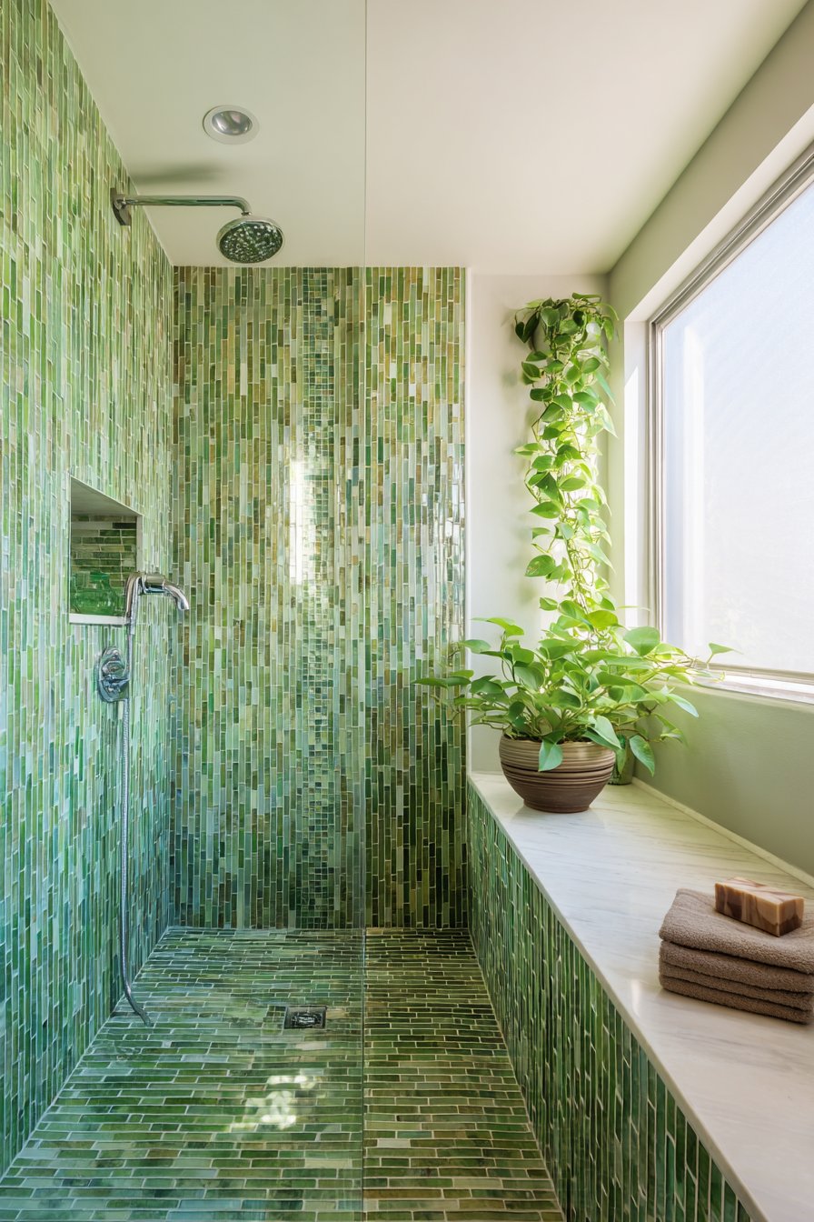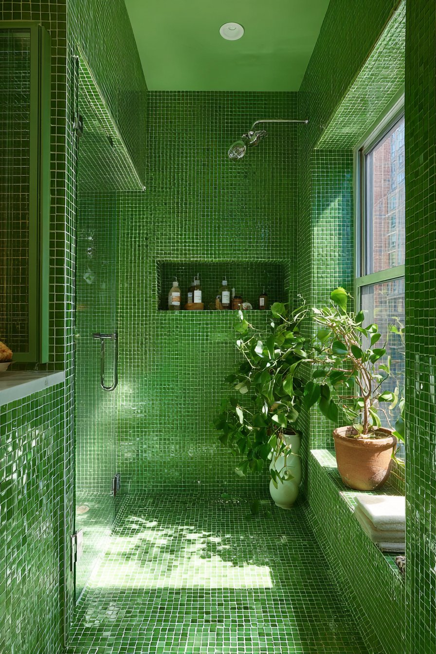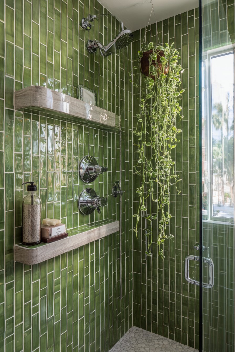 Built-in corner shelving demonstrates thoughtful planning for functional storage within the shower itself. These niches hold natural soap bars and a small trailing pothos plant, the latter bringing living greenery that reinforces the color palette while thriving in the humid bathroom environment. Chrome fixtures provide bright, reflective accents that shine brilliantly against the rich green backdrop, their cool metallic finish complementing the glass tiles’ inherent shimmer.